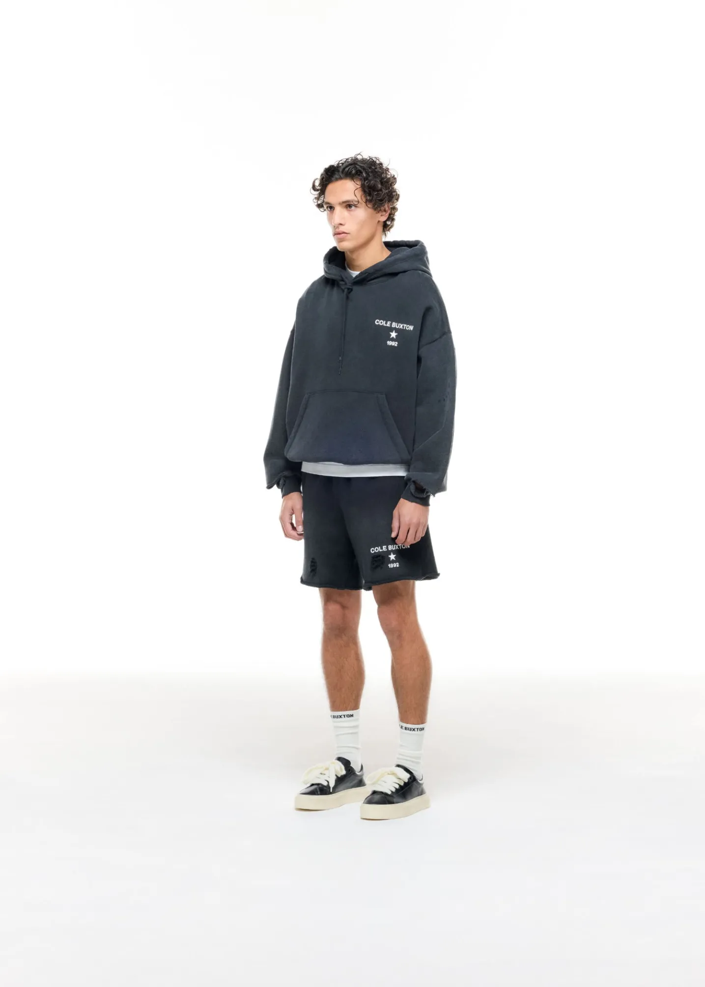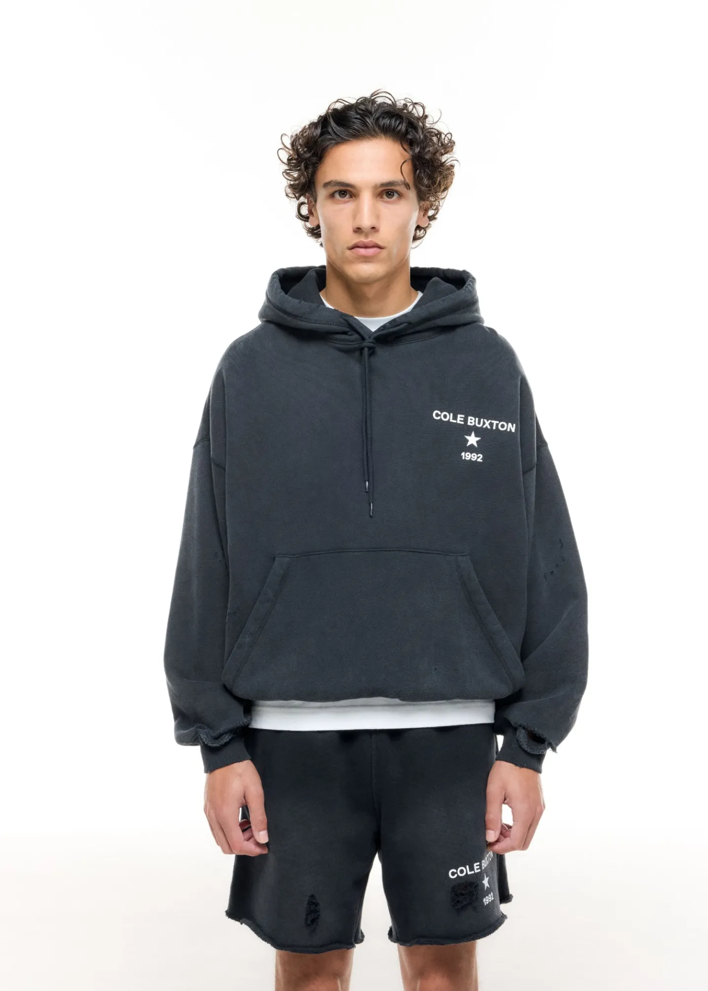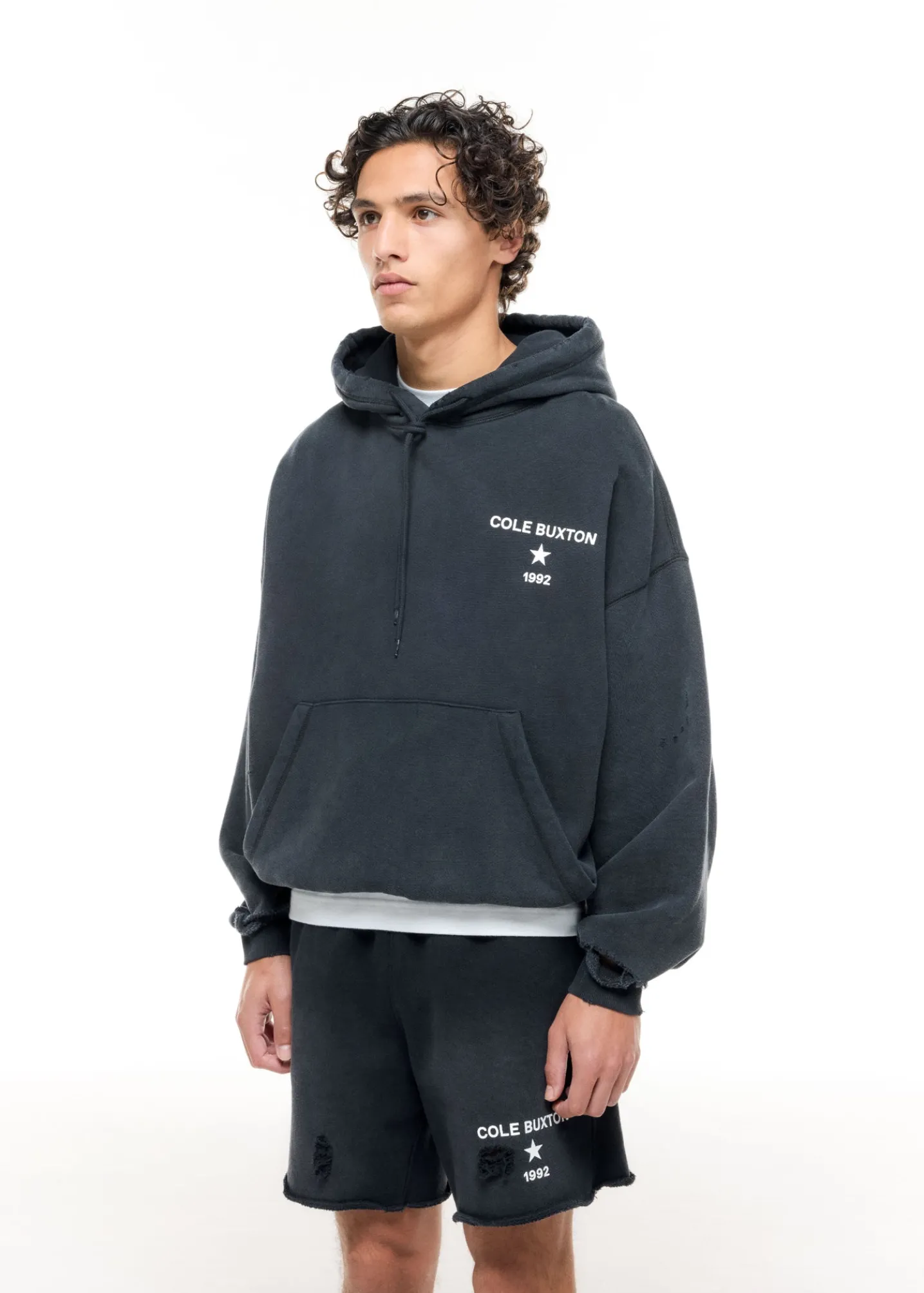 The distressed hoodie, a brand new hoodie for SS25. We’ve developed a brand new 500gsm half brushed American fleece for this that’s heavy in weight yet has a luxury drape. We have heavily washed this hoodie and subtly distressed it all over with meticulous paint marks inspired by vintage Americana. Featuring our 1992 graphic on the left chest and back.
