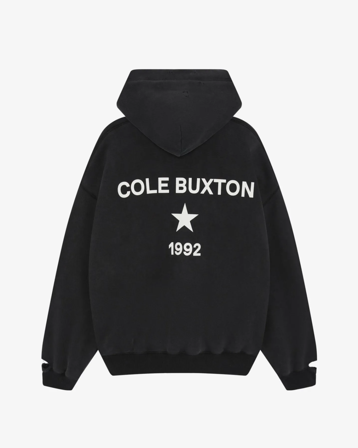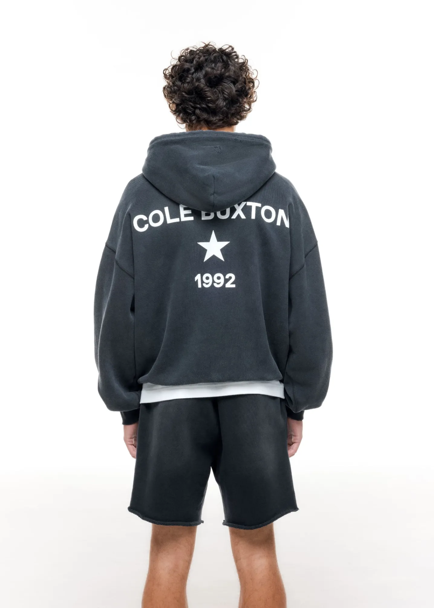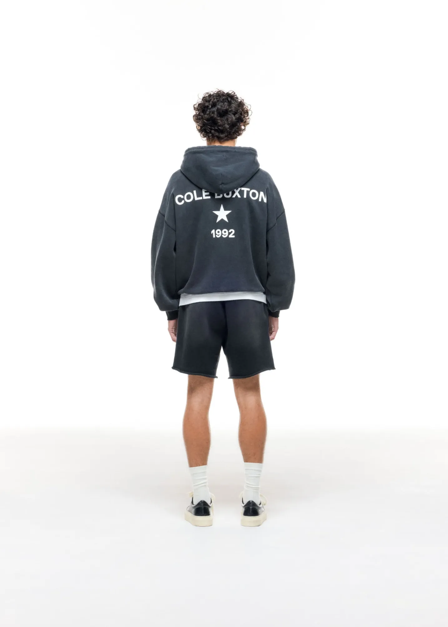 The distressed hoodie, a brand new hoodie for SS25. We’ve developed a brand new 500gsm half brushed American fleece for this that’s heavy in weight yet has a luxury drape. We have heavily washed this hoodie and subtly distressed it all over with meticulous paint marks inspired by vintage Americana. Featuring our 1992 graphic on the left chest and back.