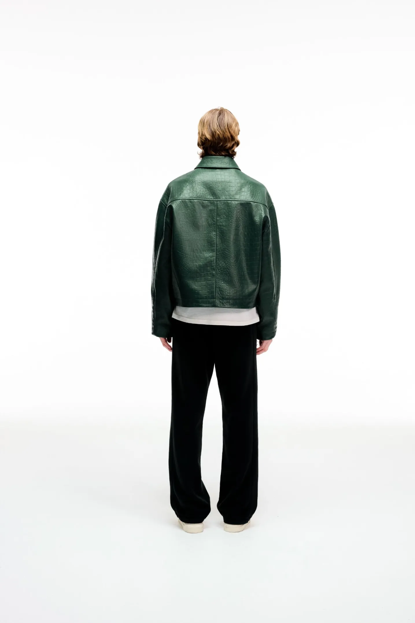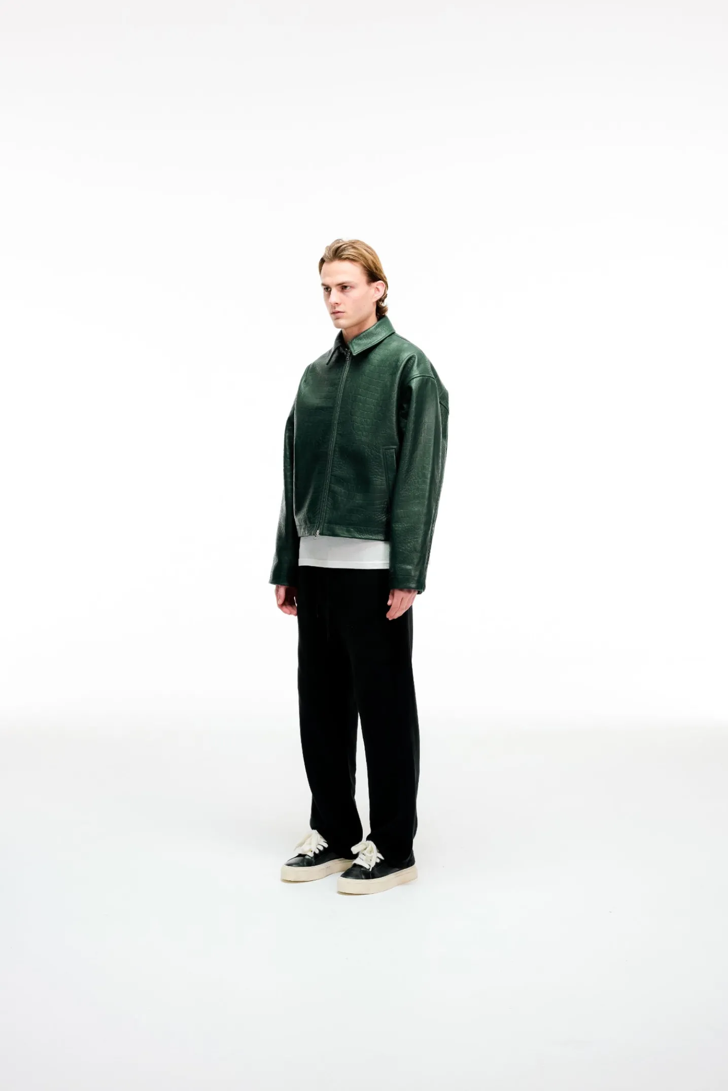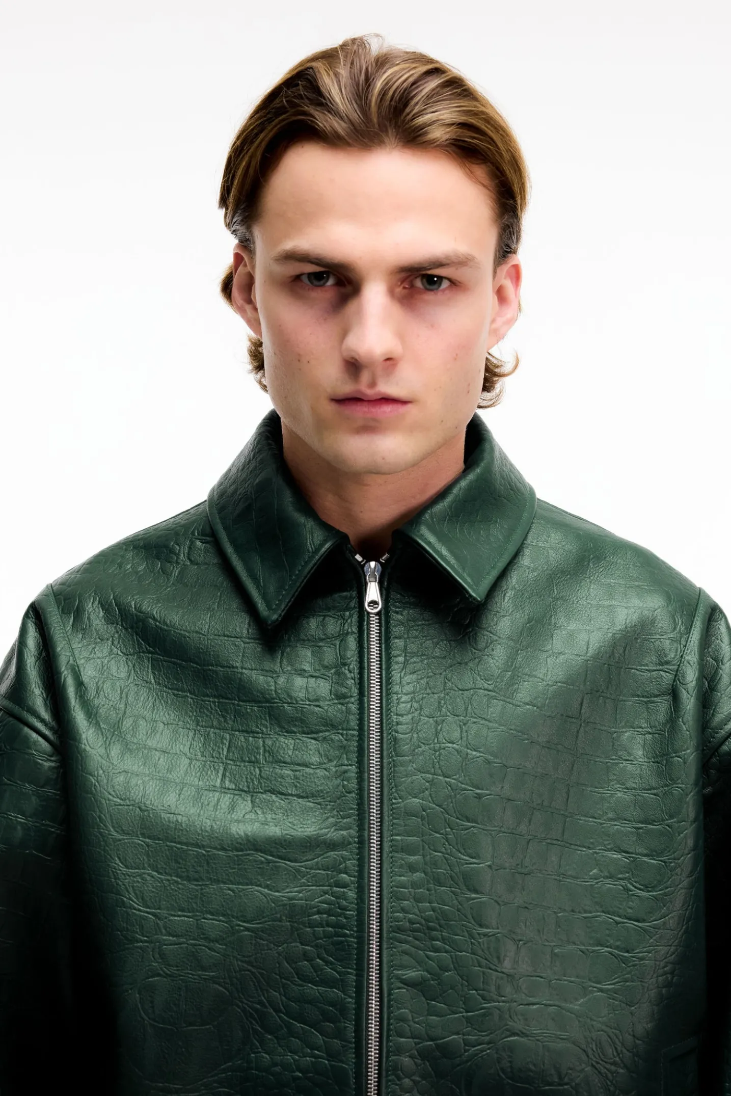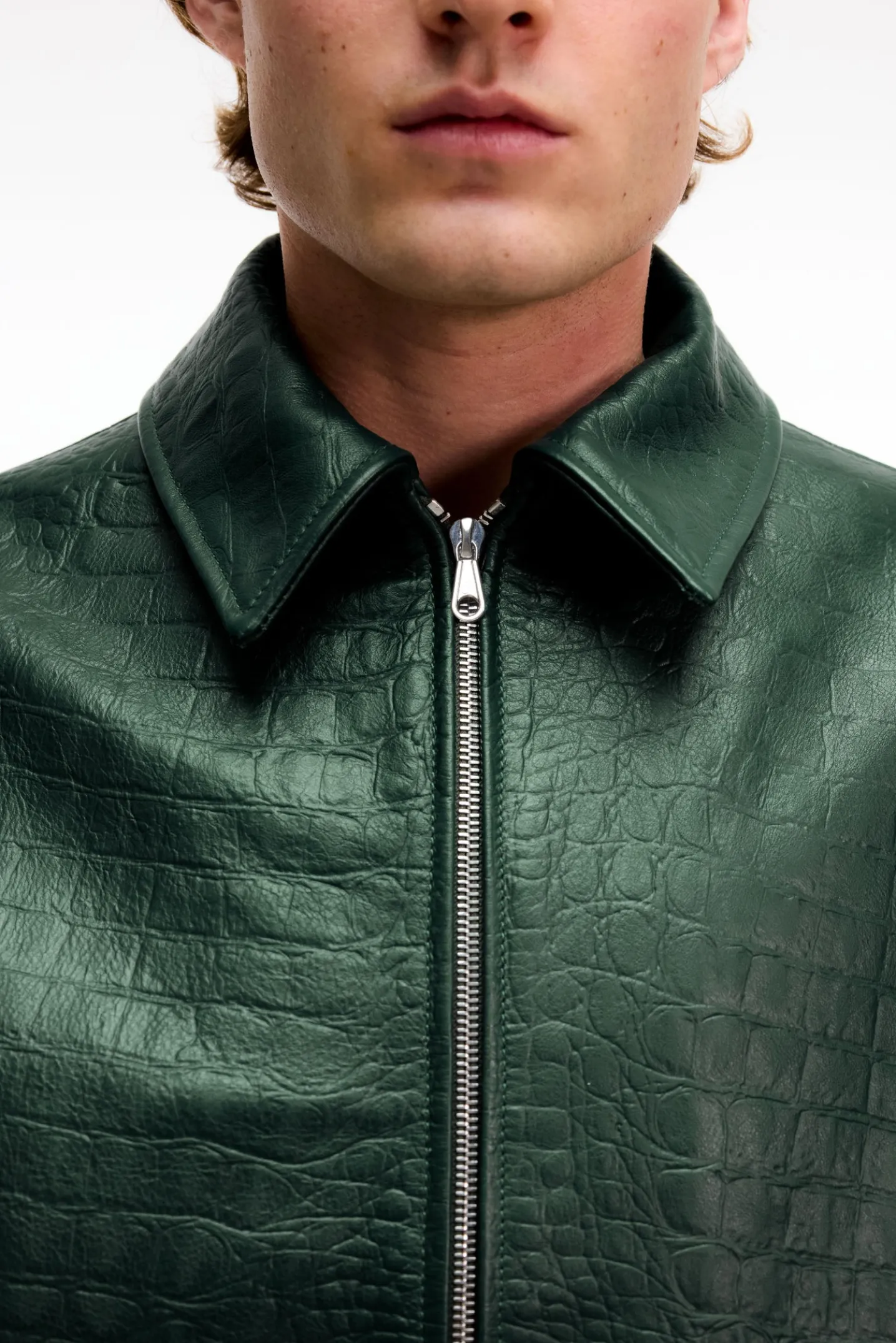This croc effect leather blouson is luxury throughout, cut in a cropped silhouette with slightly dropped shoulders and a classic overshirt collar. The outer is an Italian heavy cow leather with a crocodile pattern embossing all over. Finished with CB branded riri zips on the centre front.