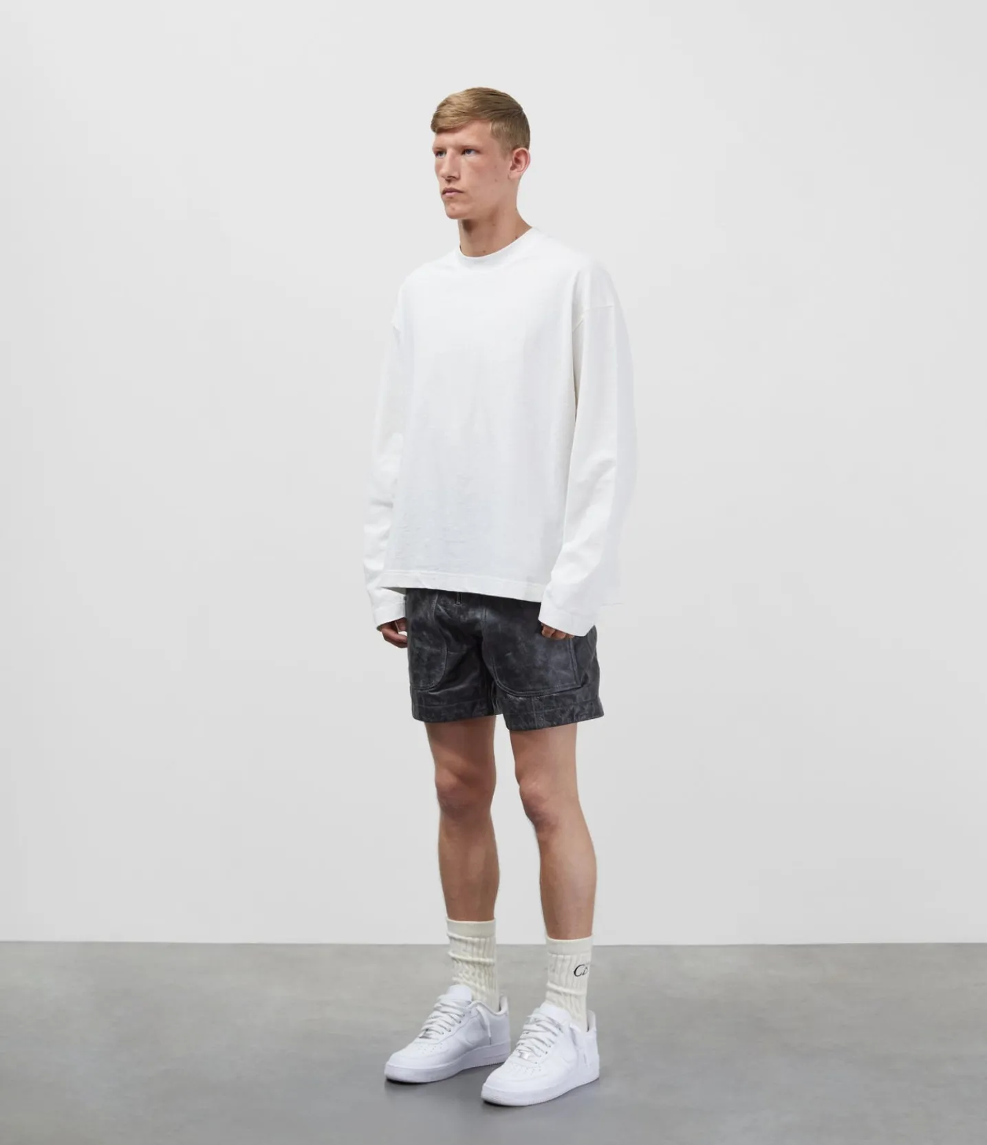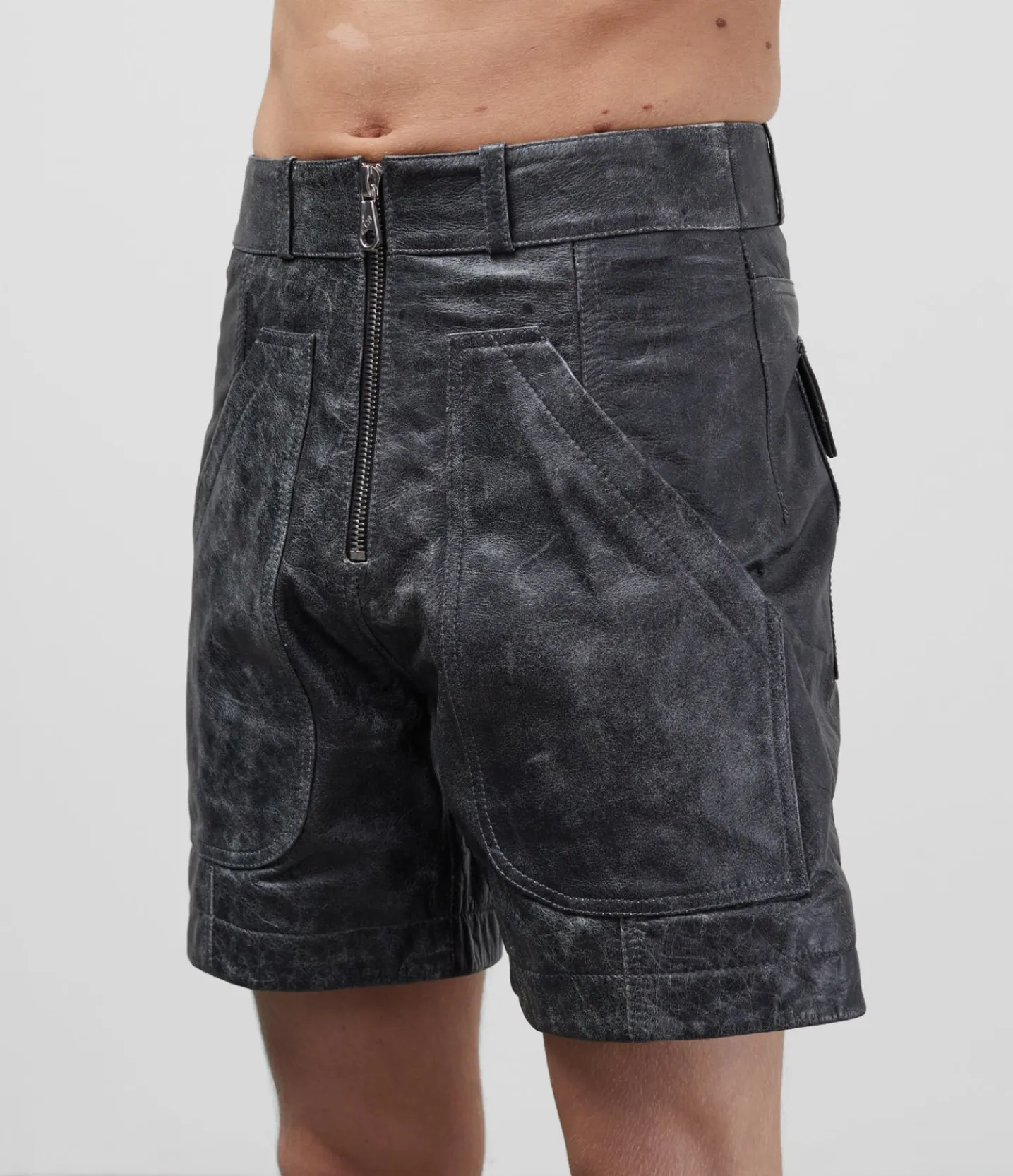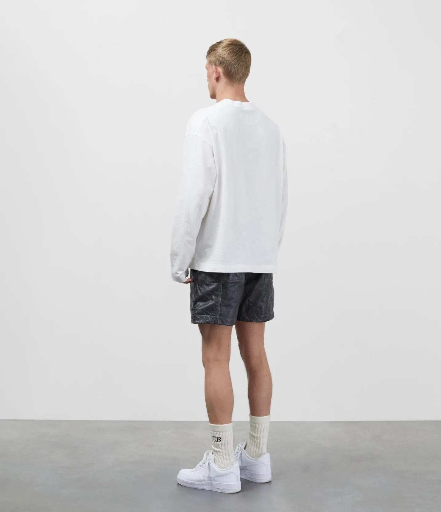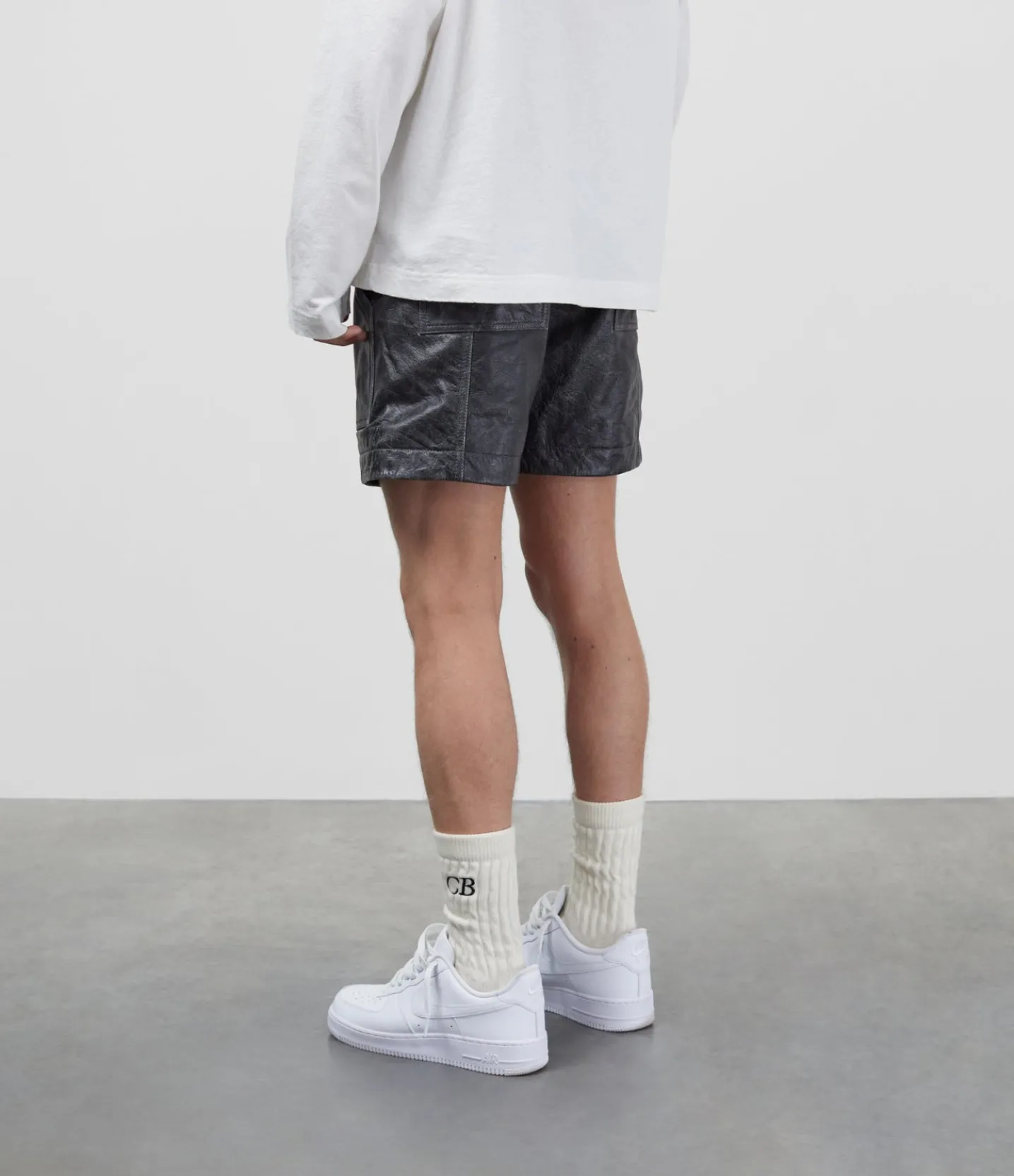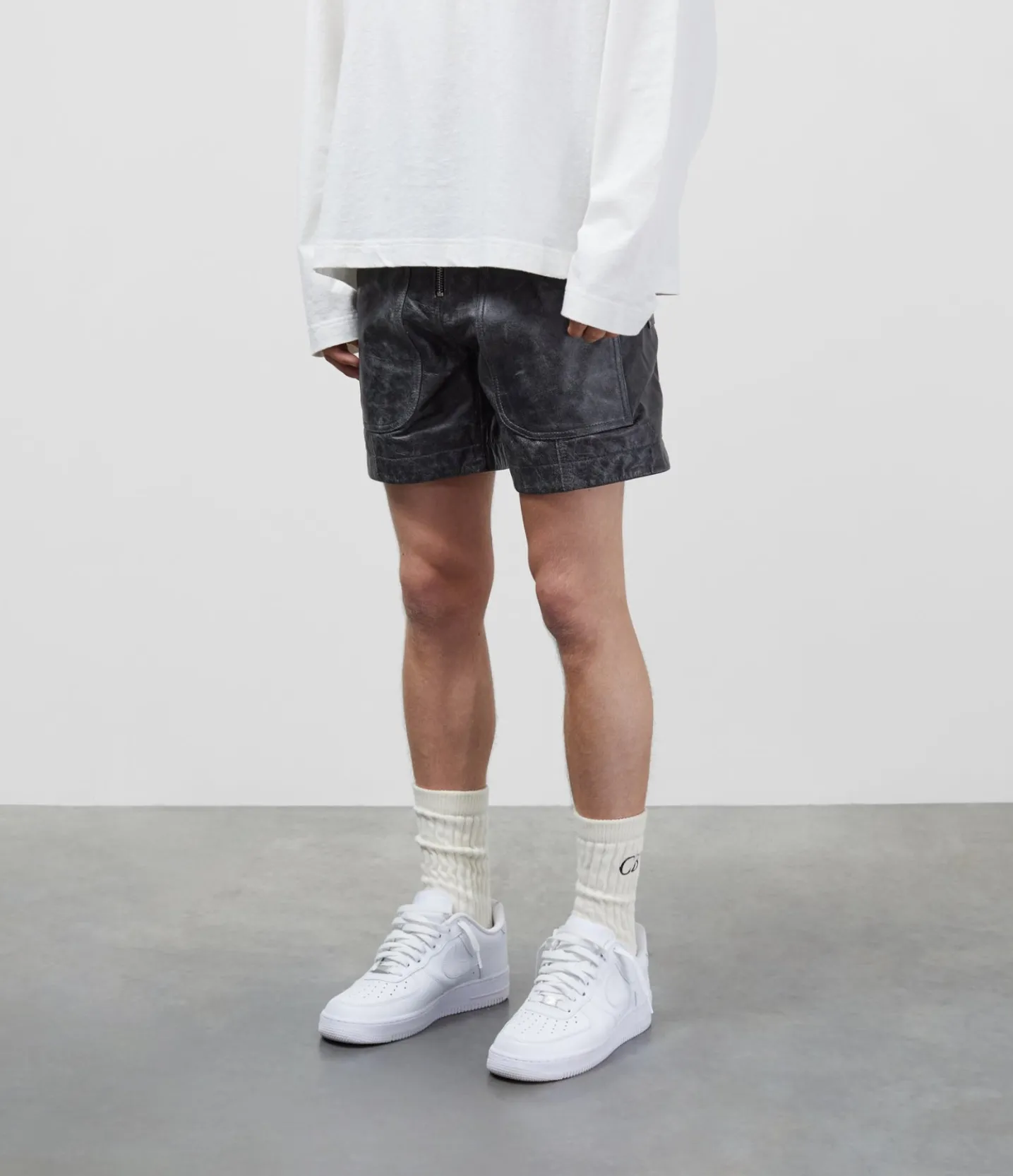Brand new for SS23 are these cracked leather shorts. We have cut these in a boxy silhouette featuring a silky lining, front and back flat felled seams, signature carpenter patch pockets and exposed riri zip on the fly. Due to the nature of the leather tumbling process, each garment is unique and may differ slightly to the image.
