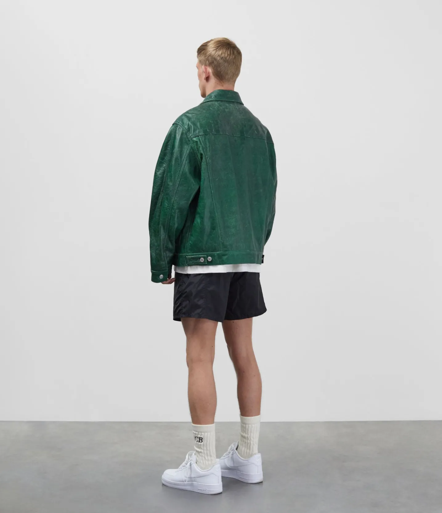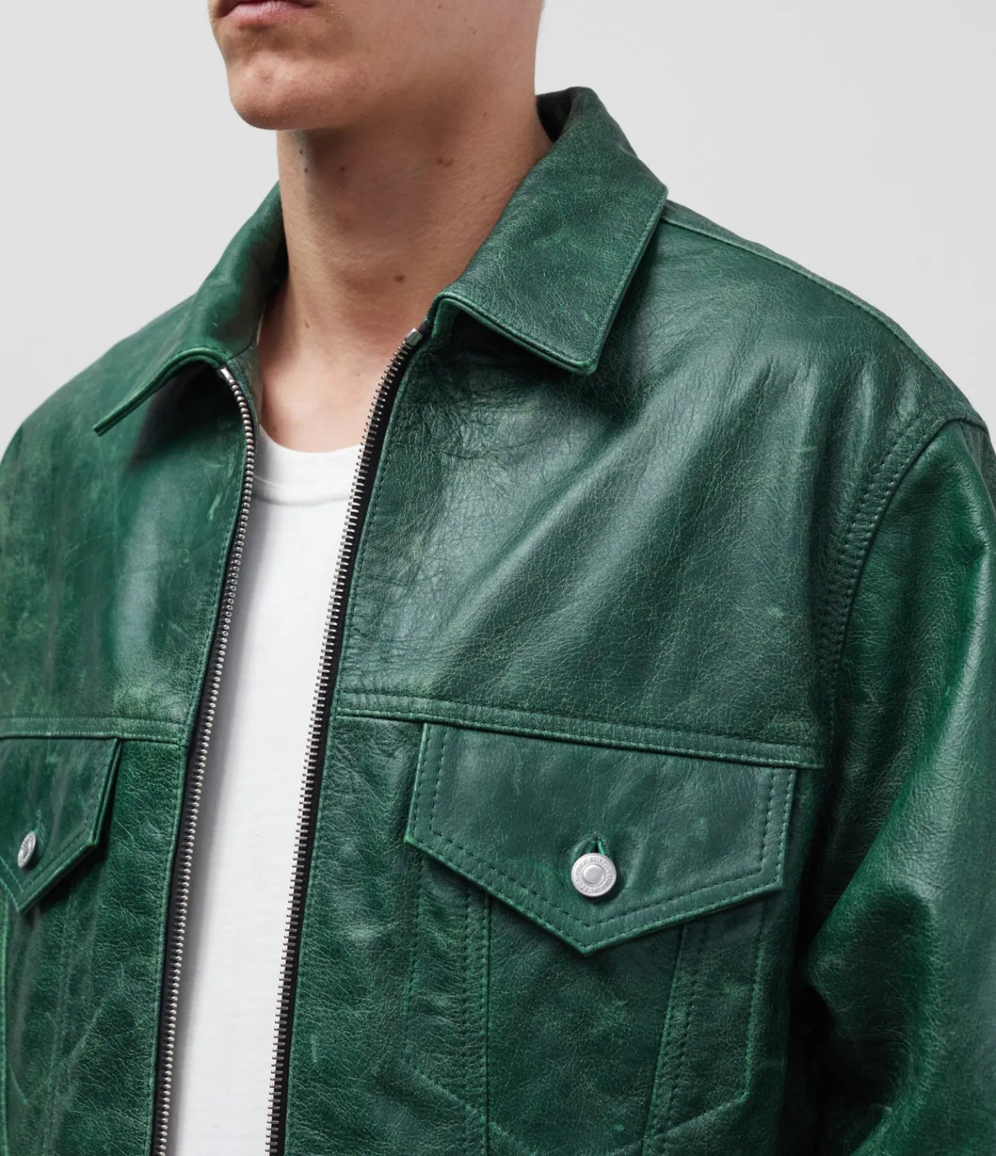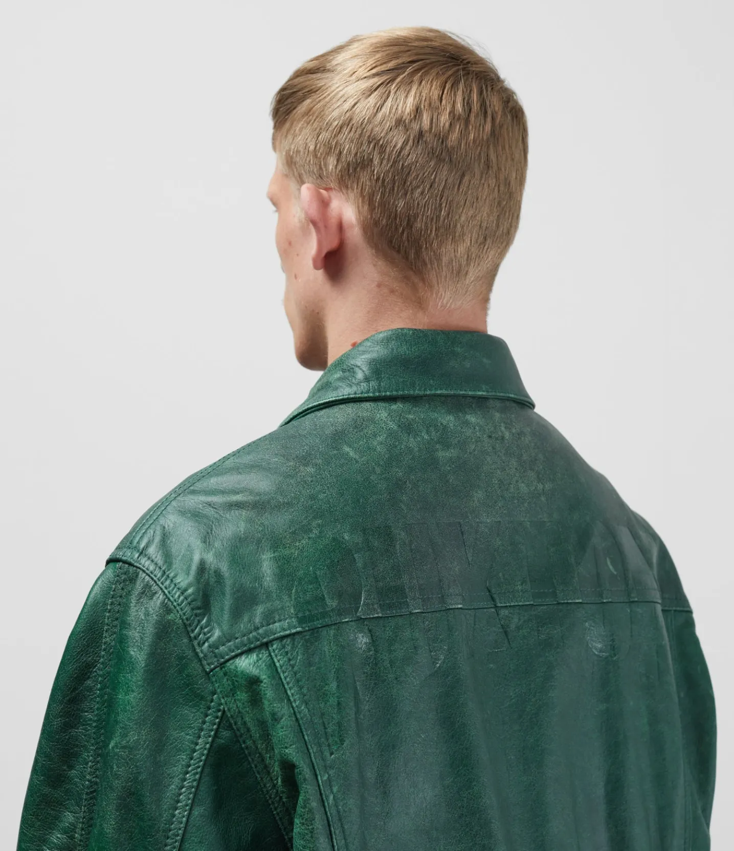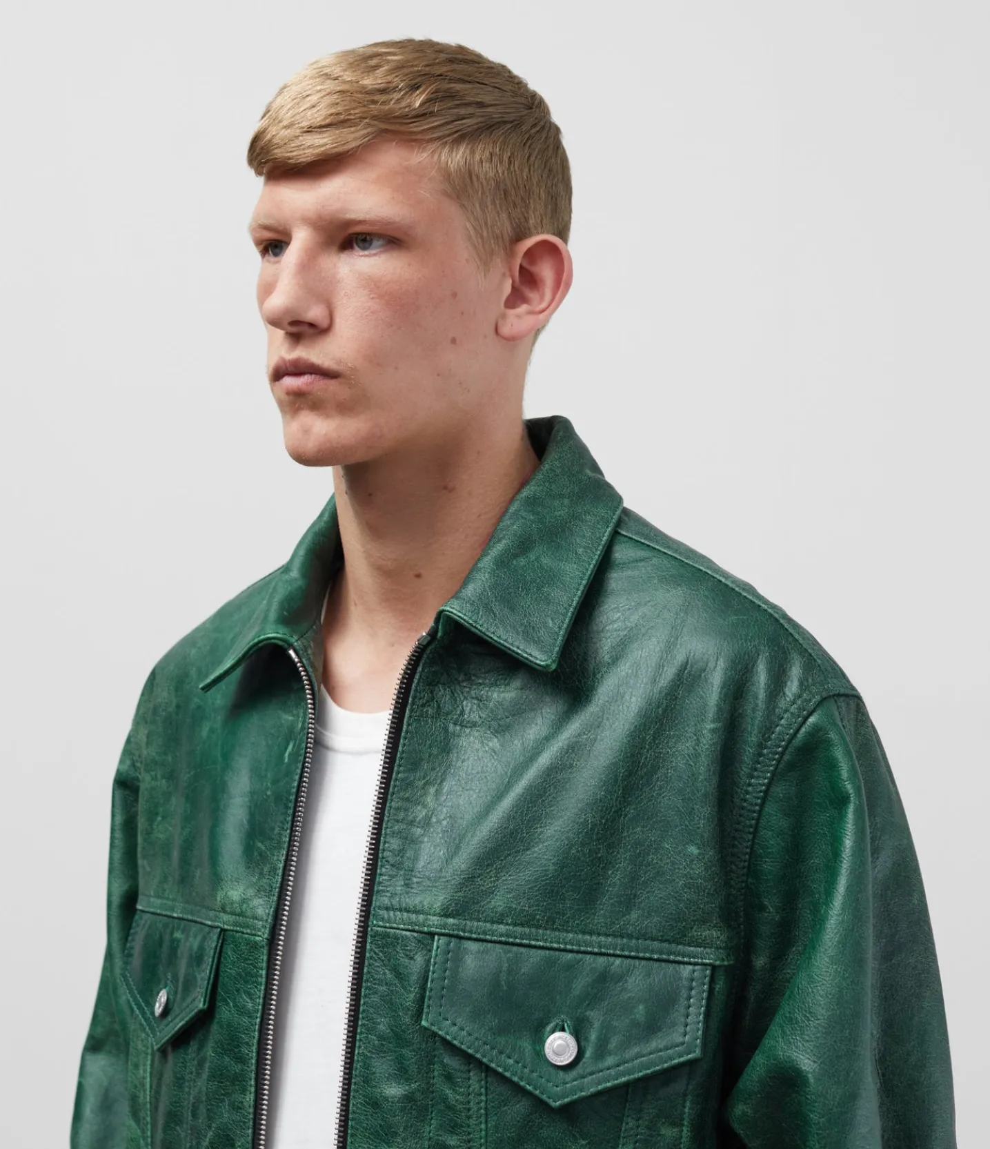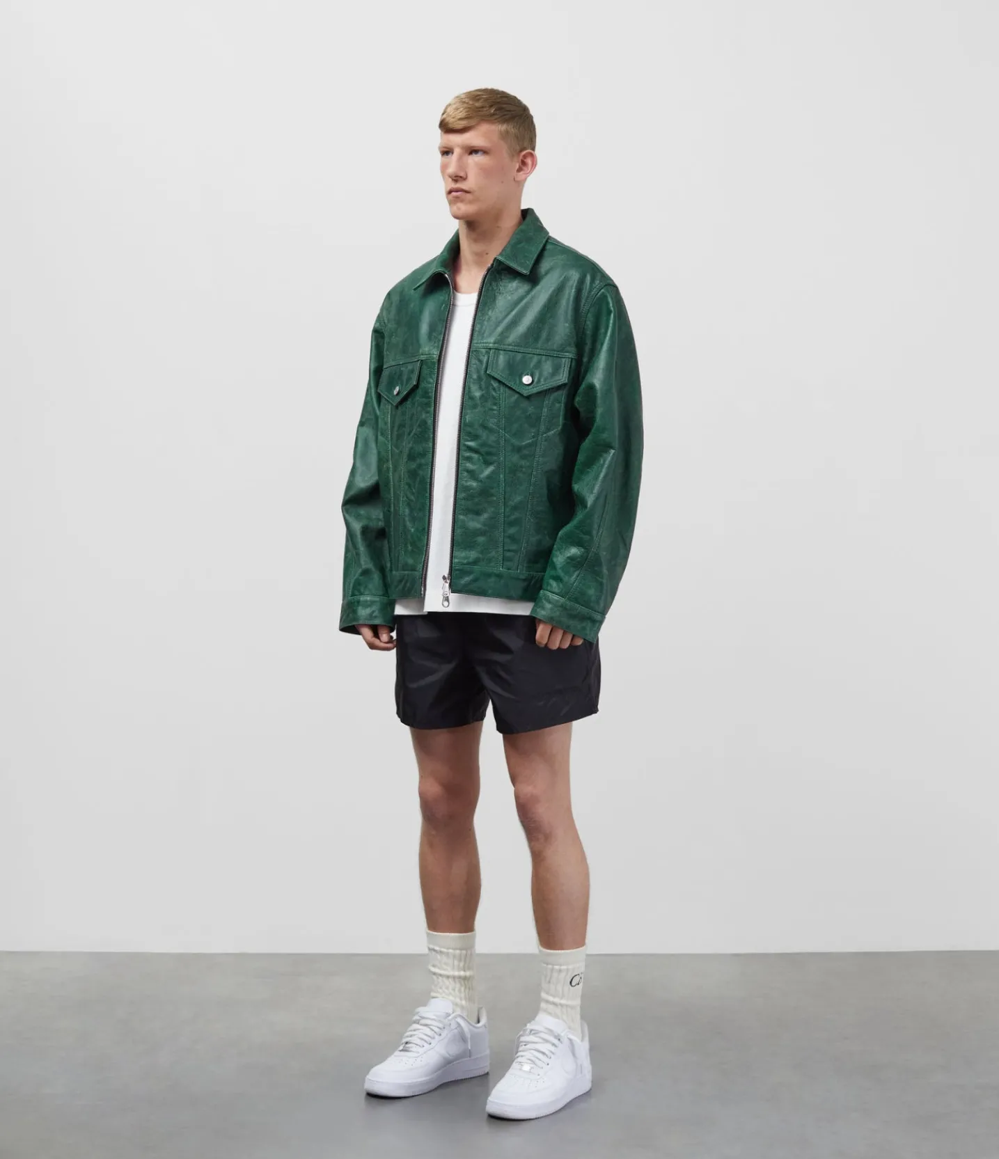 Our latest addition to our leather offering are these luxury cracked leather trucker jackets. The silhouette is cropped in body length, featuring classic trucker jacket detailing, full riri hardware and a debossed back logo.