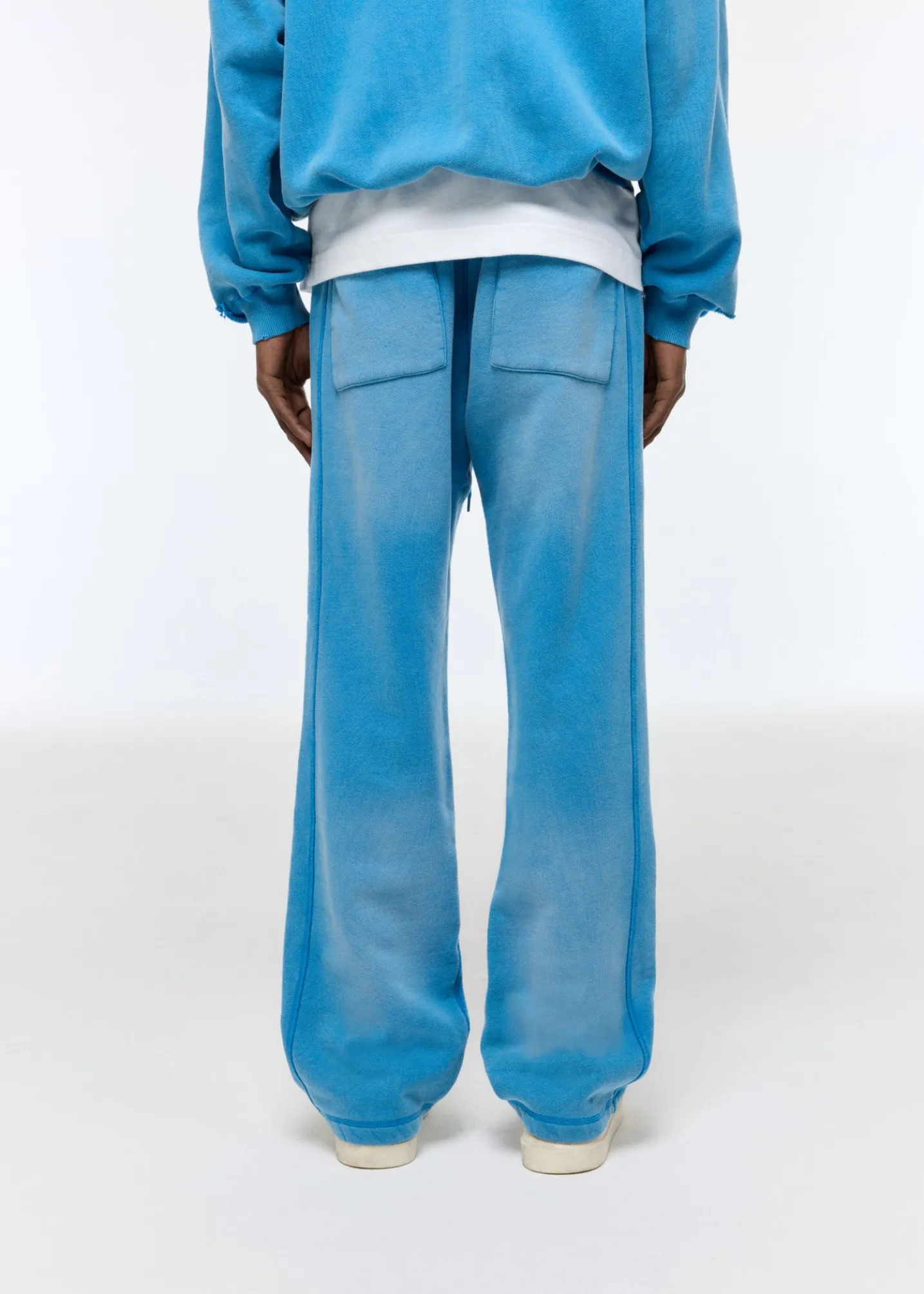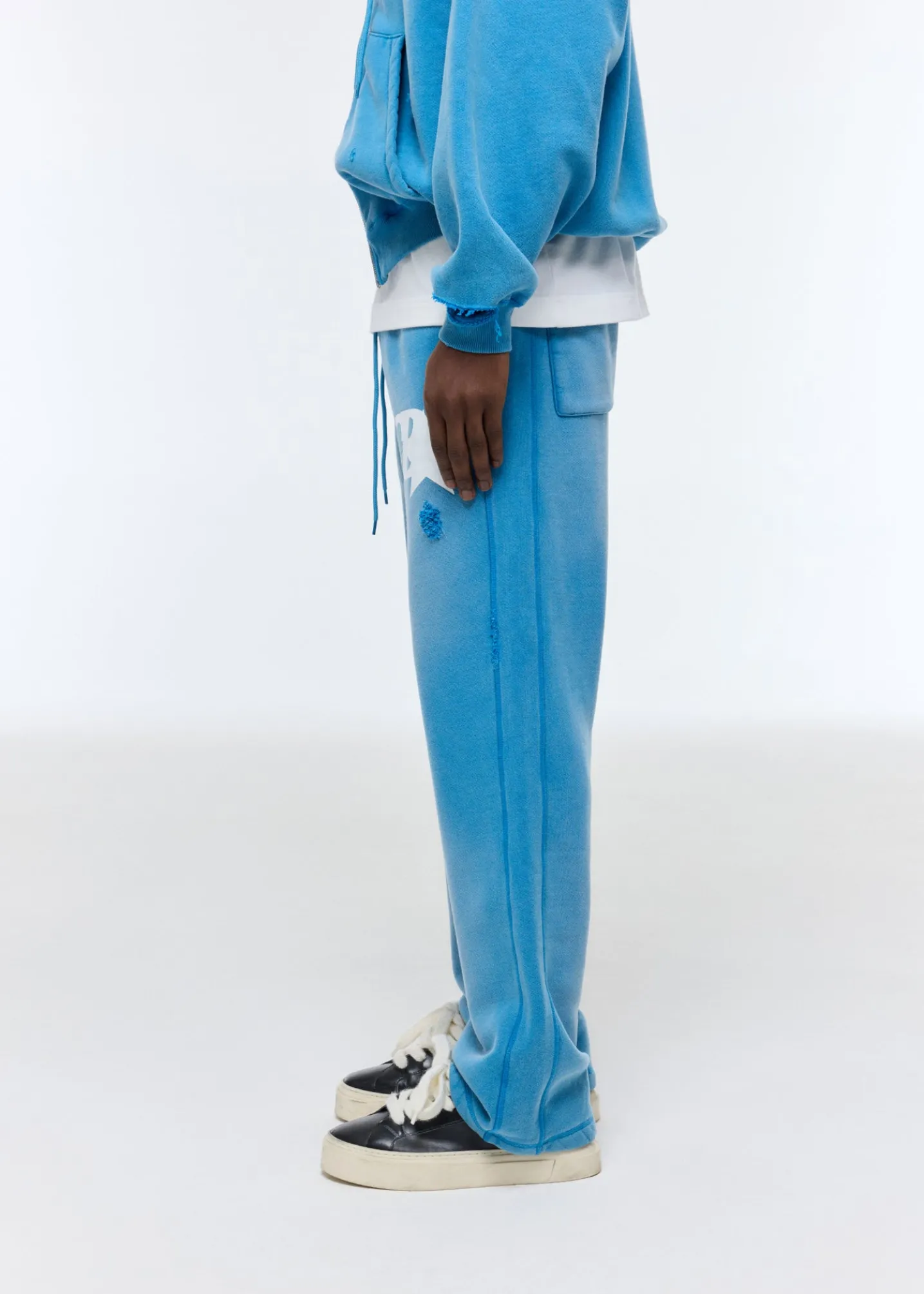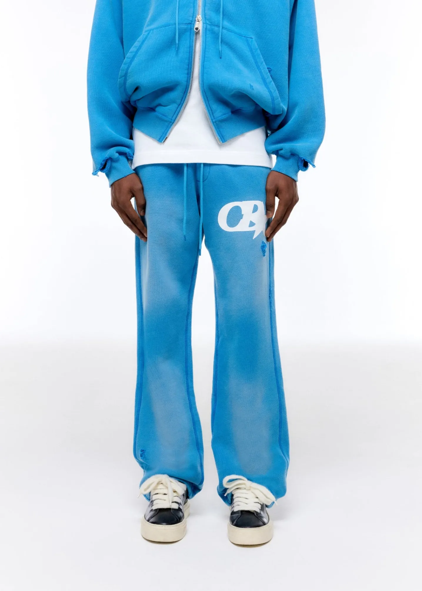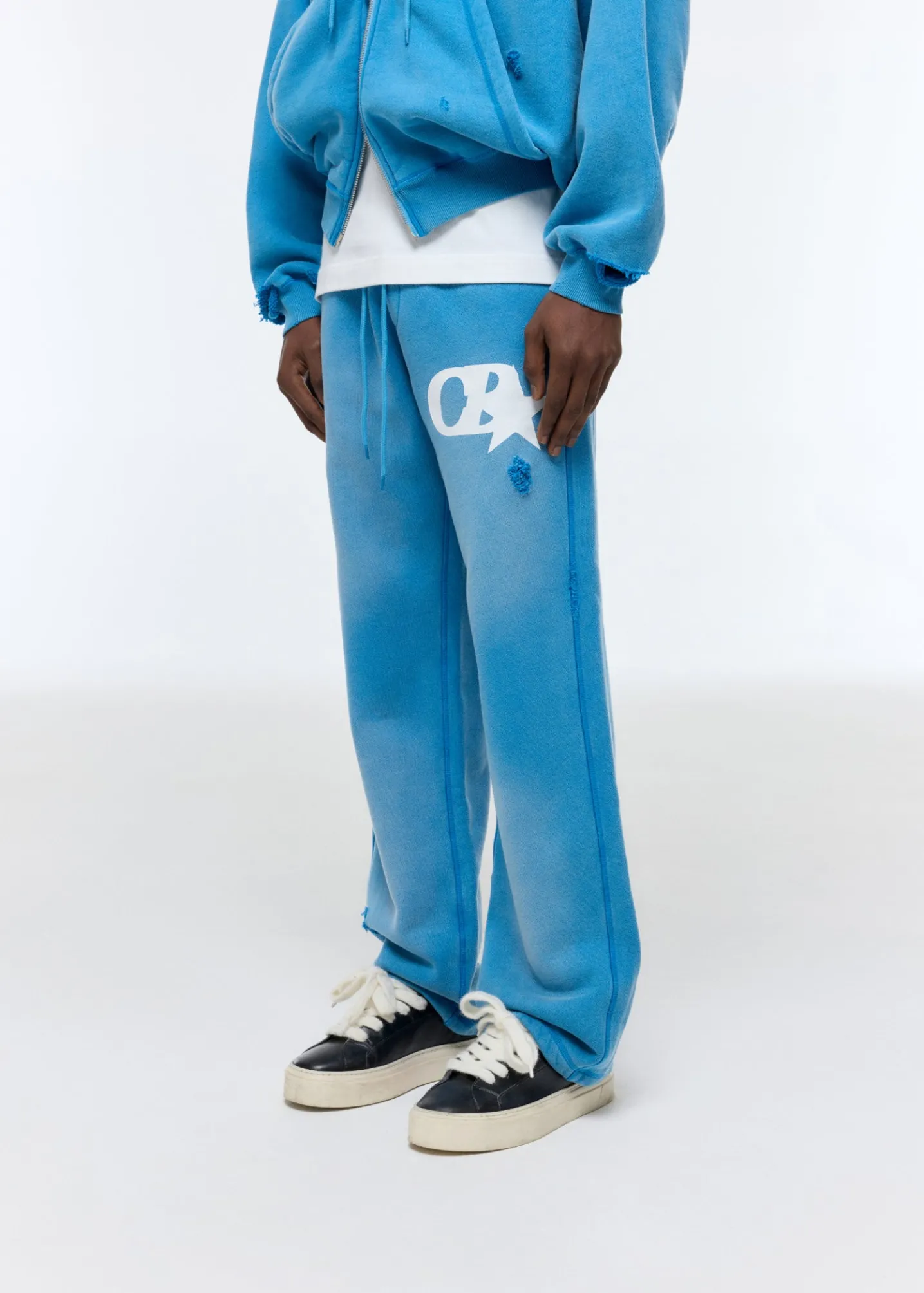 The distressed CB star sweatpant, a brand new pant for SS25. We’ve developed a brand new 500gsm half brushed American fleece for this that’s heavy in weight yet has a luxury drape. We have printed our CB star logo on these and then heavily washed it to achieve a perfectly faded and worn-in hand feel. Cut in our straight legged silhouette with a very slight boot cut to sit perfectly over the shoe.