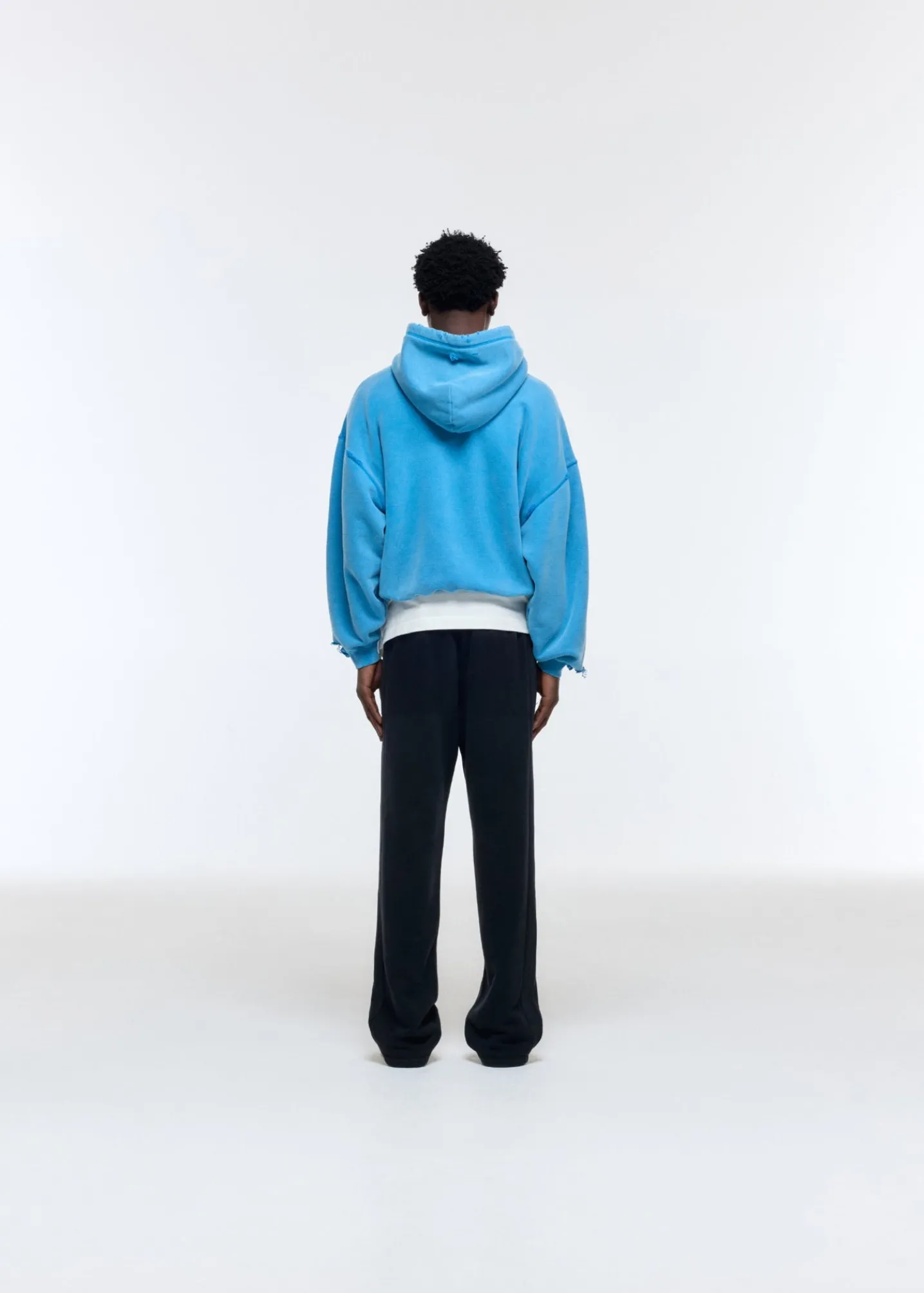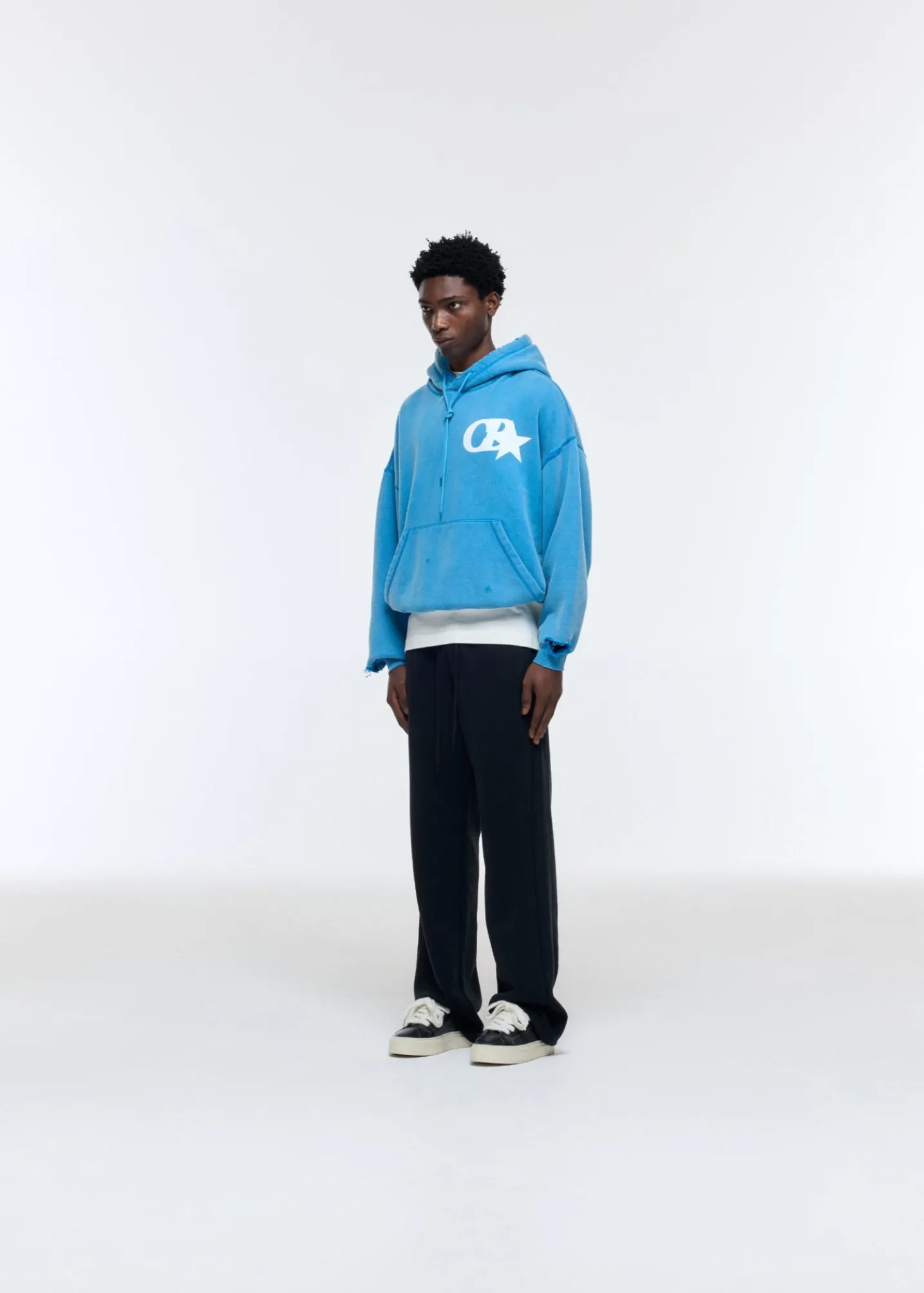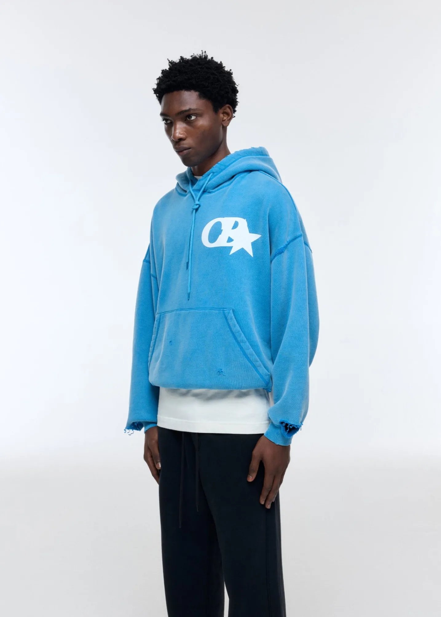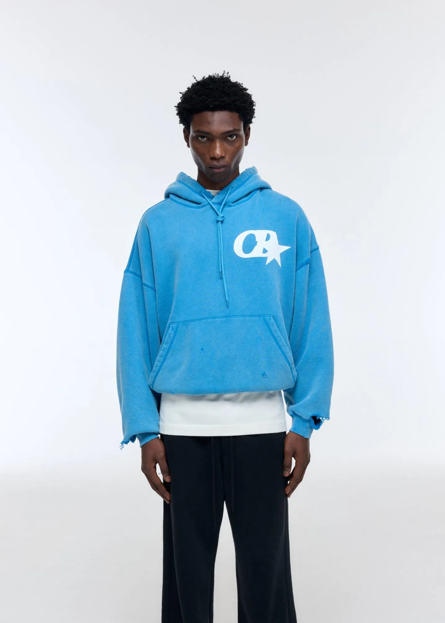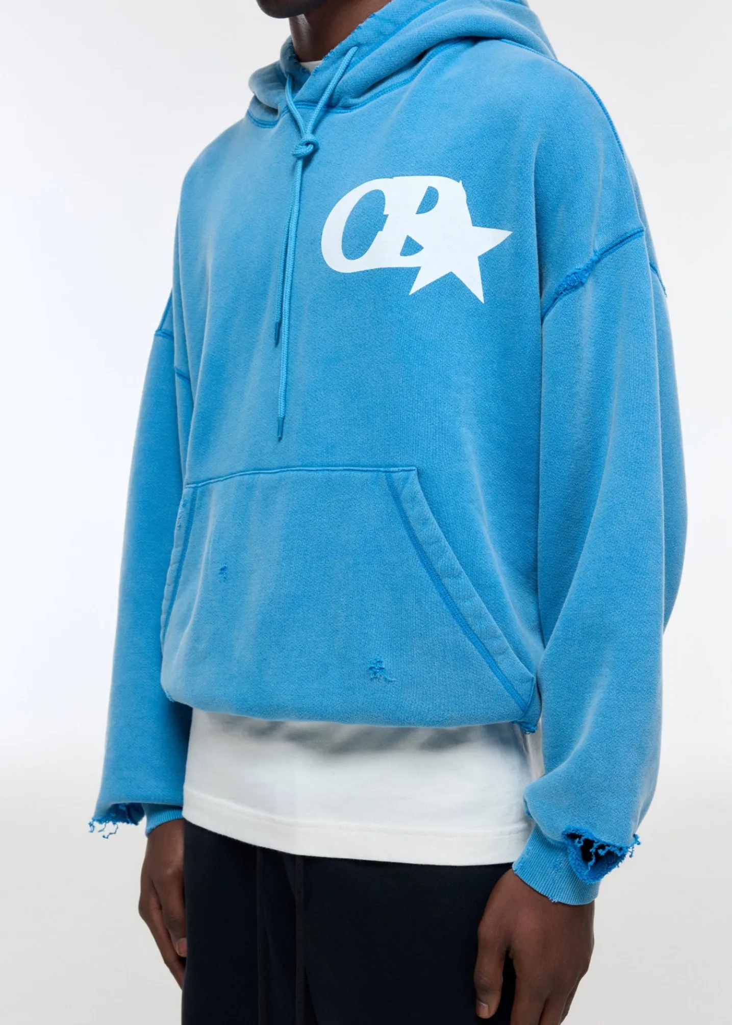 The distressed CB star hoodie, a brand new hoodie for SS25. We’ve developed a brand new 500gsm half brushed American fleece for this that’s heavy in weight yet has a luxury drape. We have printed our CB star logo on this and then heavily washed it to achieve a perfectly faded and worn-in hand feel.
