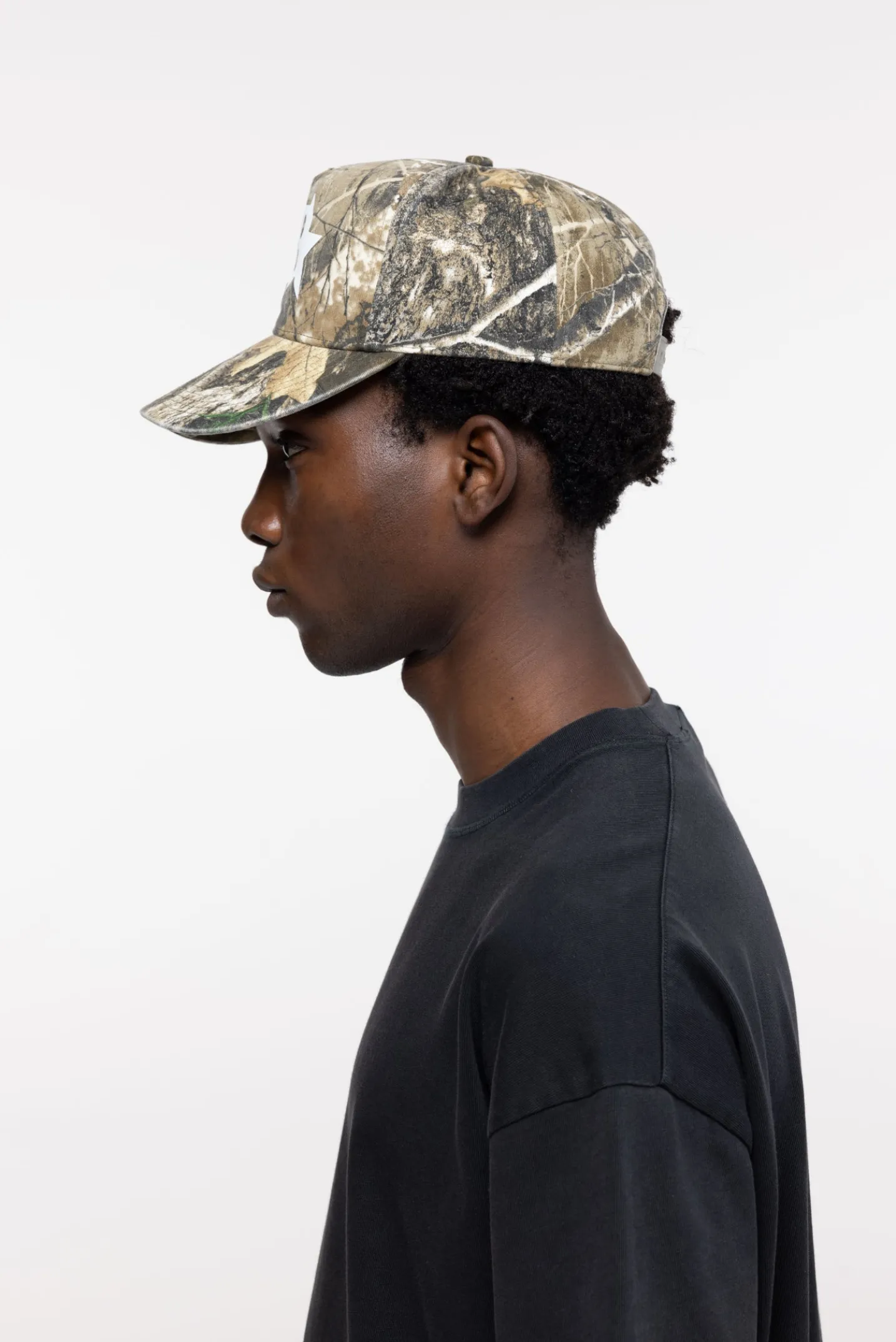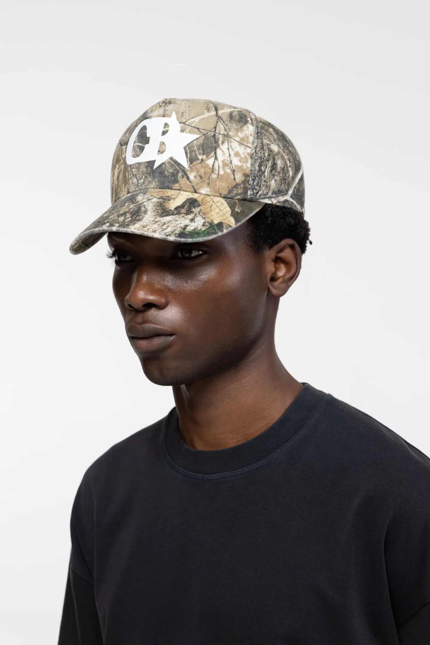 Realtree Cotton canvas twill cap in a boxy silhouette with exaggerated dart at the centre front. Featuring our CB star print.