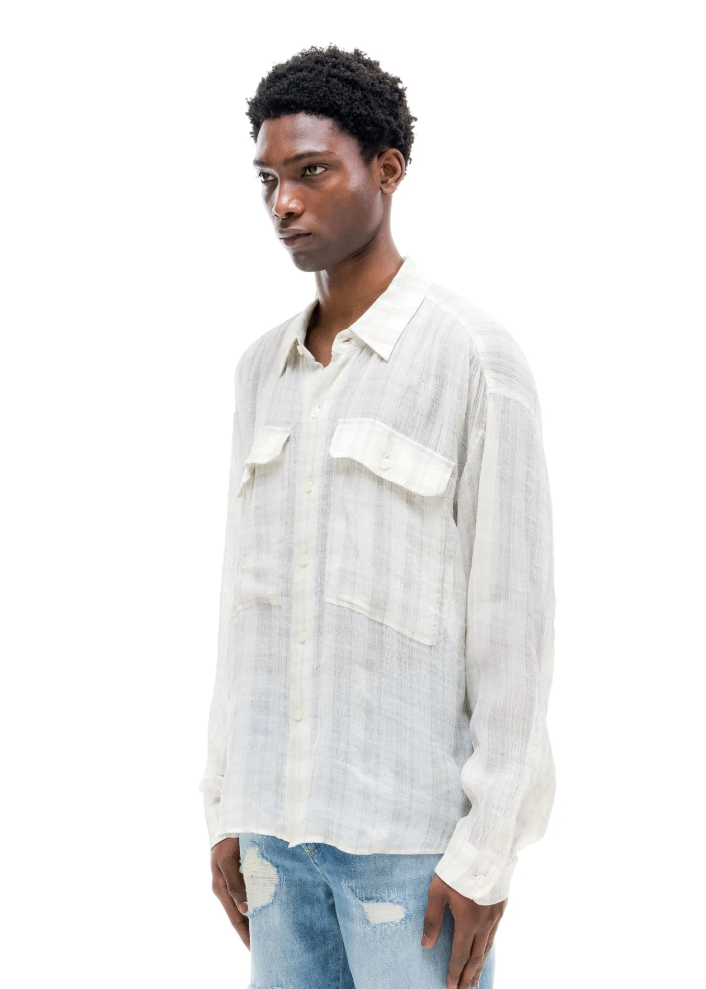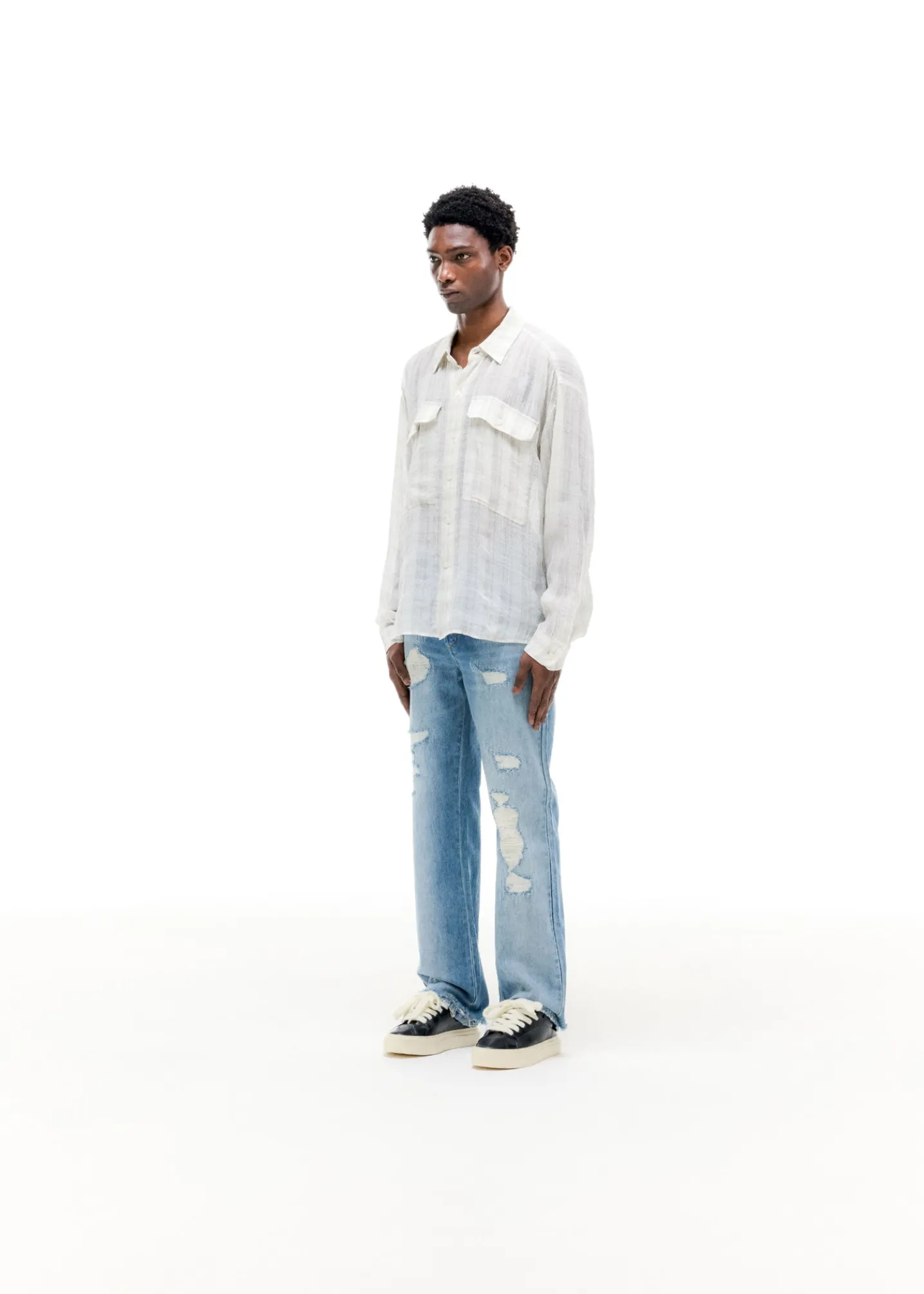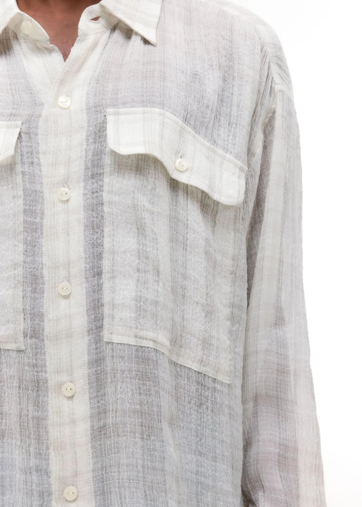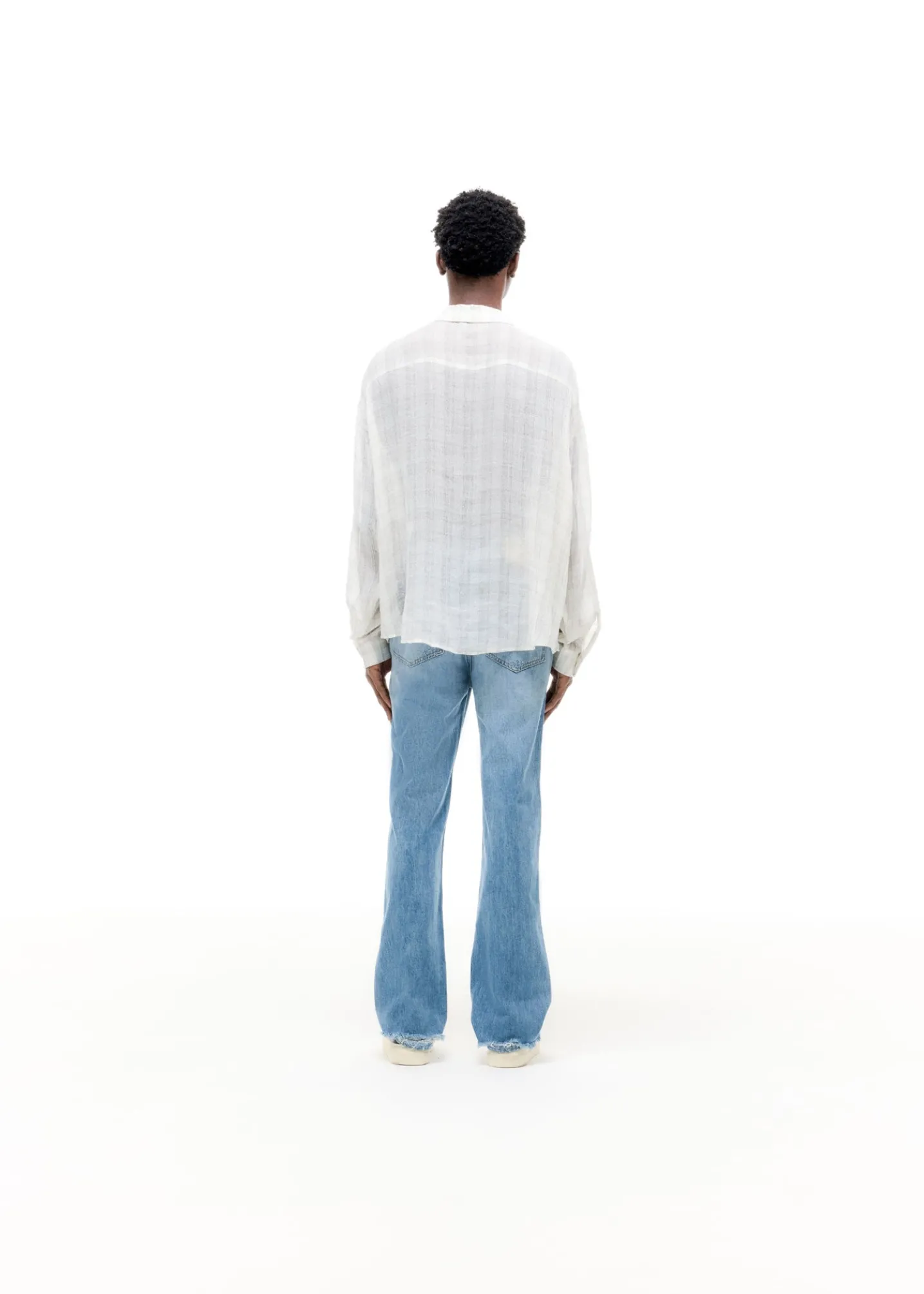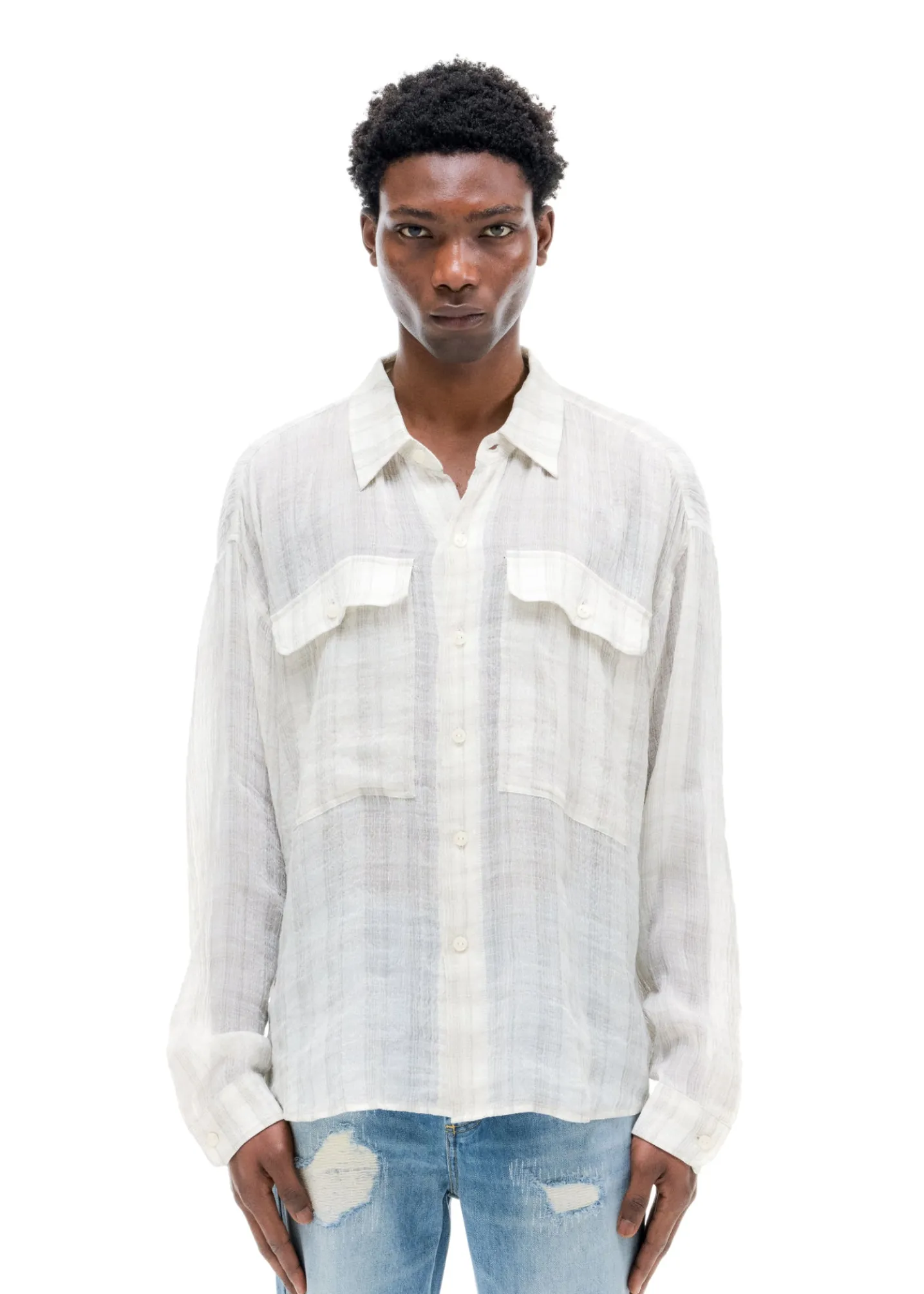 Brand new for SS25 is our ivy league shirt. With design cues taken from classic Ivy League campus attire we’ve cut this shirt from a slubbed check in a cropped and wide silhouette with dropped shoulders, a distressed scalloped hemline and finished with 2 button down signature chest pockets. Designed to be worn open with a vest or buttoned up.