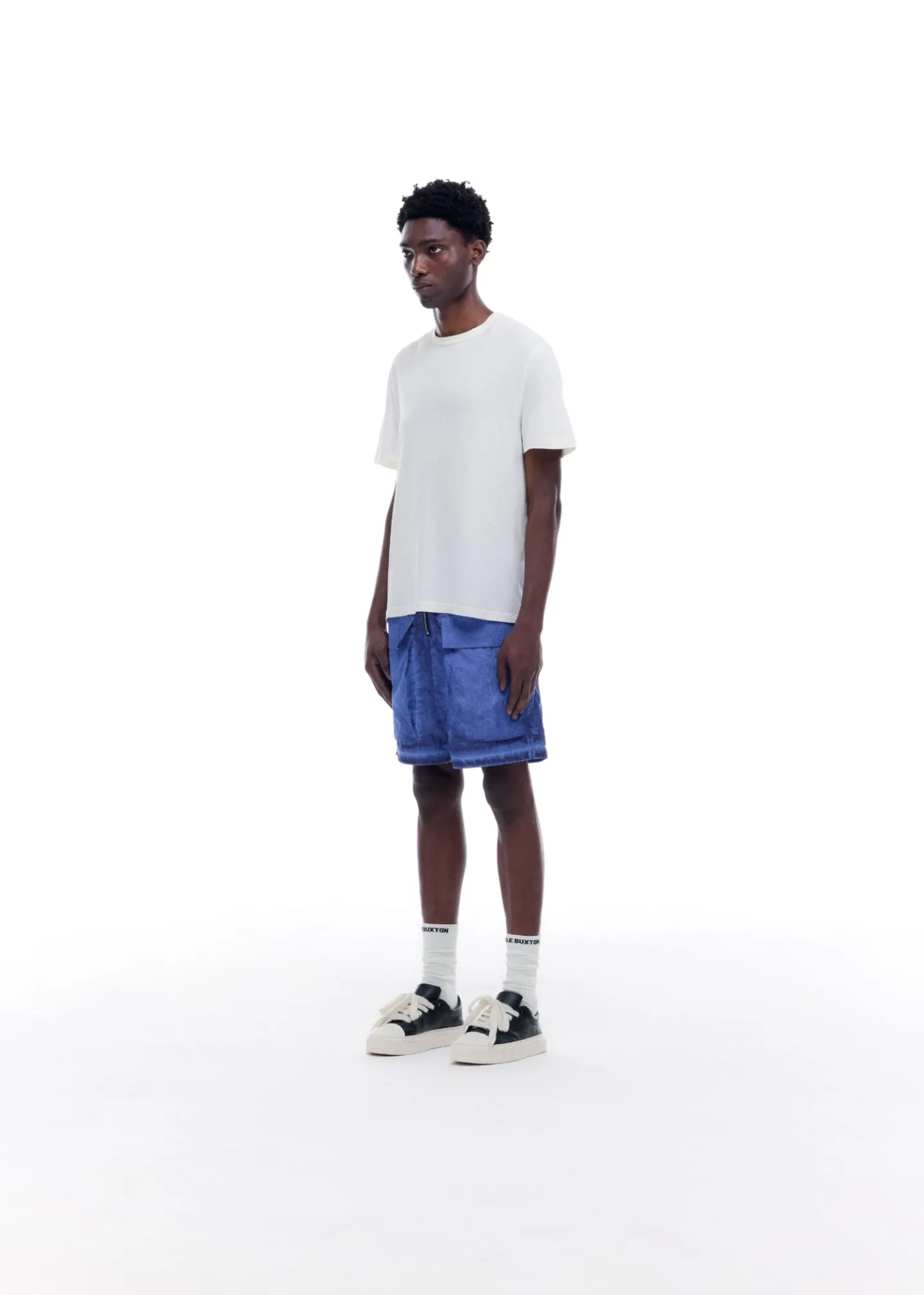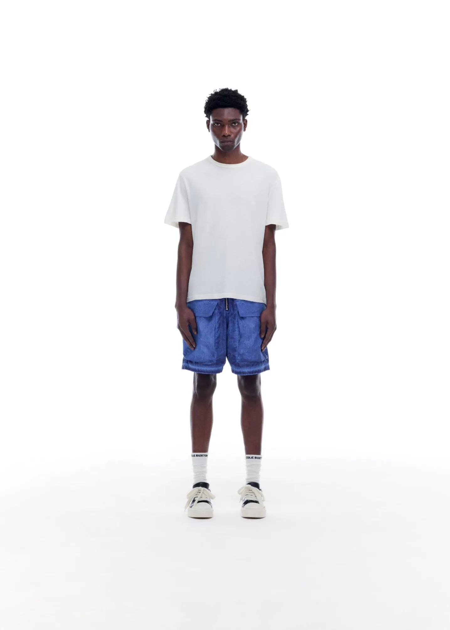 Our cargo shorts are a blend of classic menswear with design cues from military sportswear. The outer is cut from a luxury lightweight nylon in a boxy silhouette featuring oversized front combat pockets, an elasticated waistband and finished with our CB branded zippers. These have been washed with an intense cold wash treatment to create a two tone fade all over so each piece is unique.