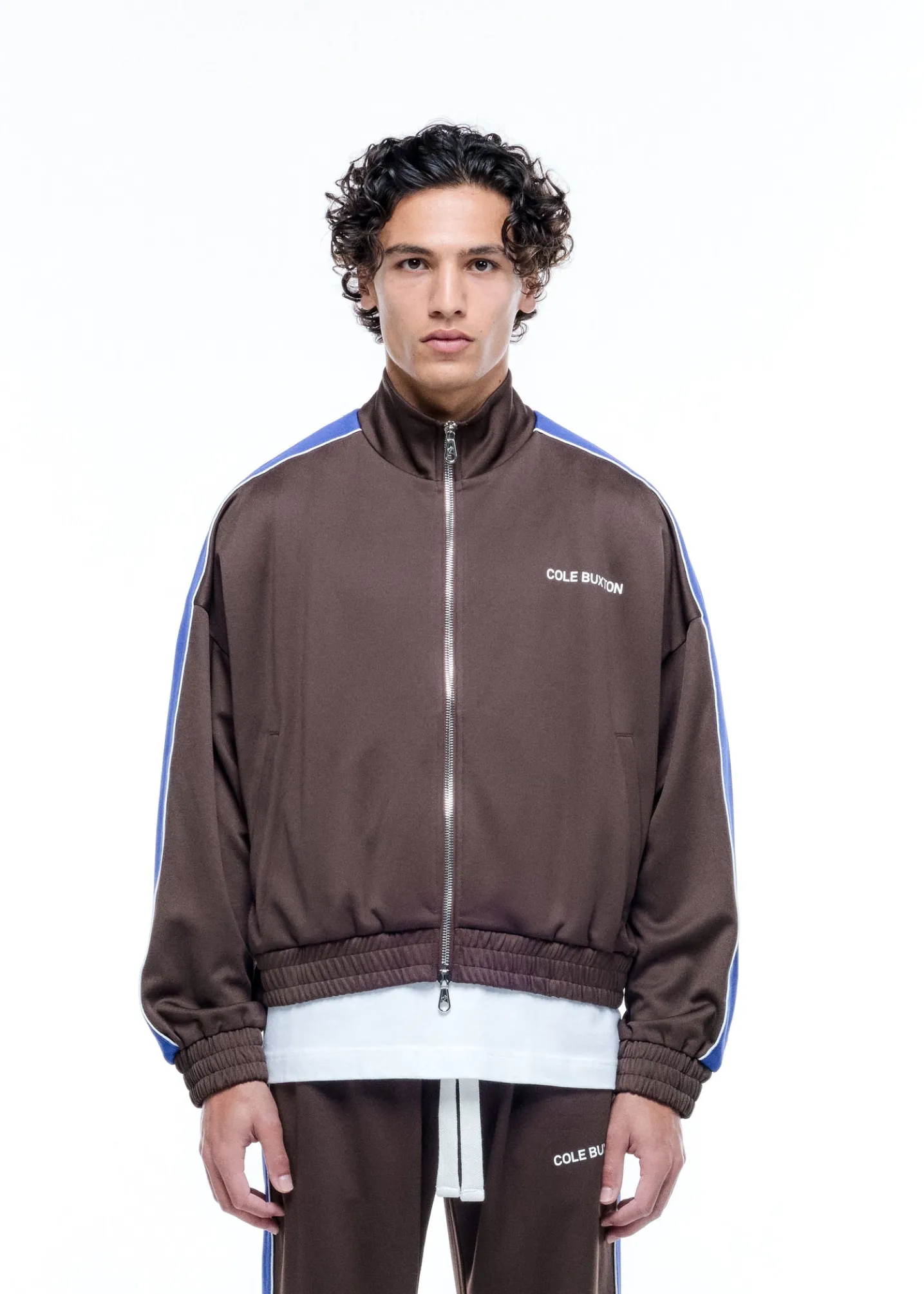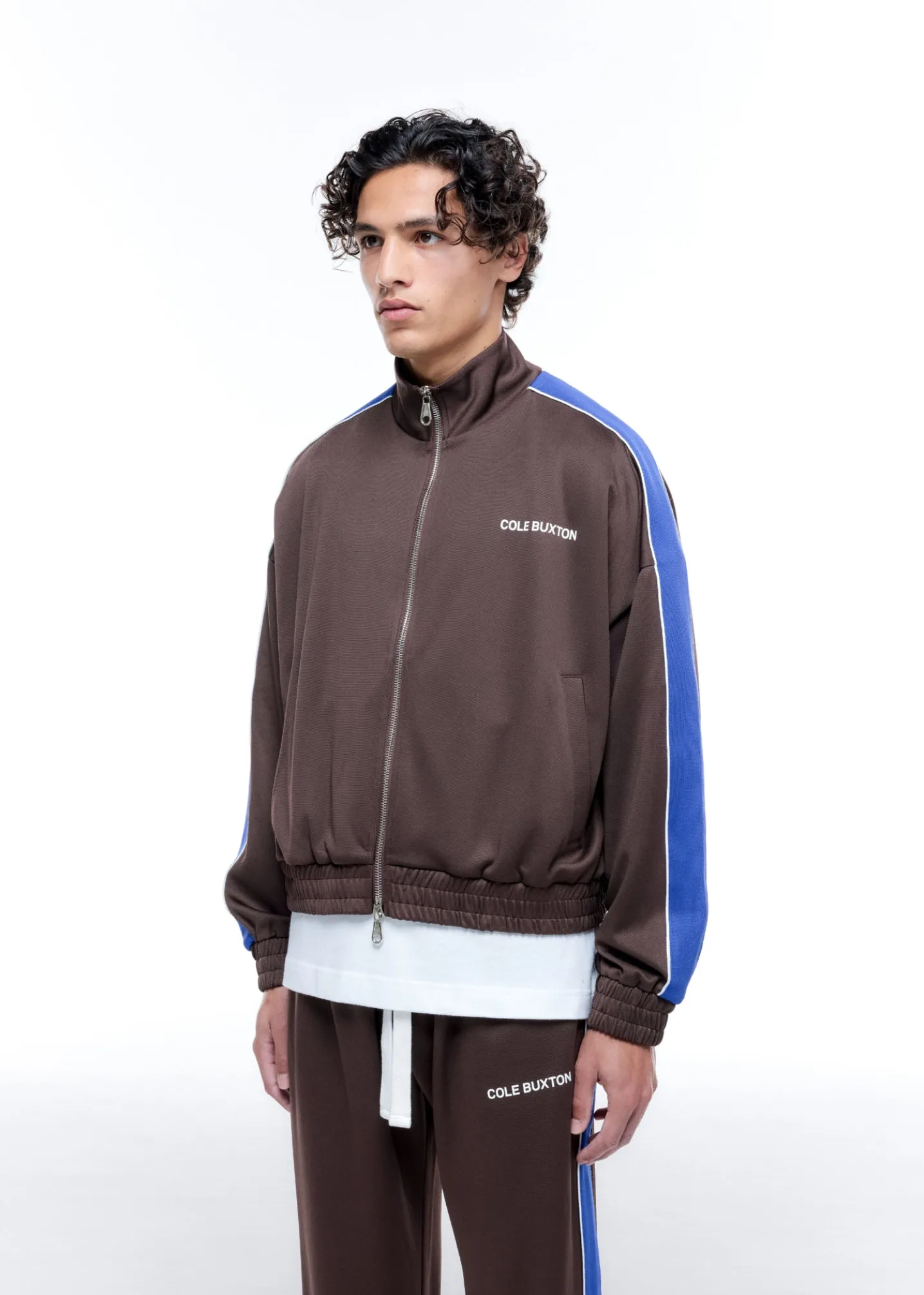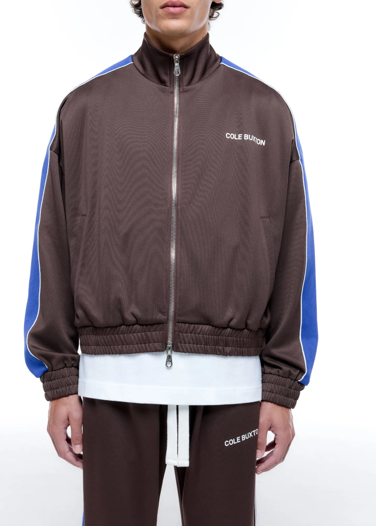 Cut from our drapey interlock polyester in a classic cropped track jacket silhouette, featuring a screen printed Cole Buxton logo on the left chest, piped contrast woven tape down the sleeves and finished with a 2-way CB branded zip.