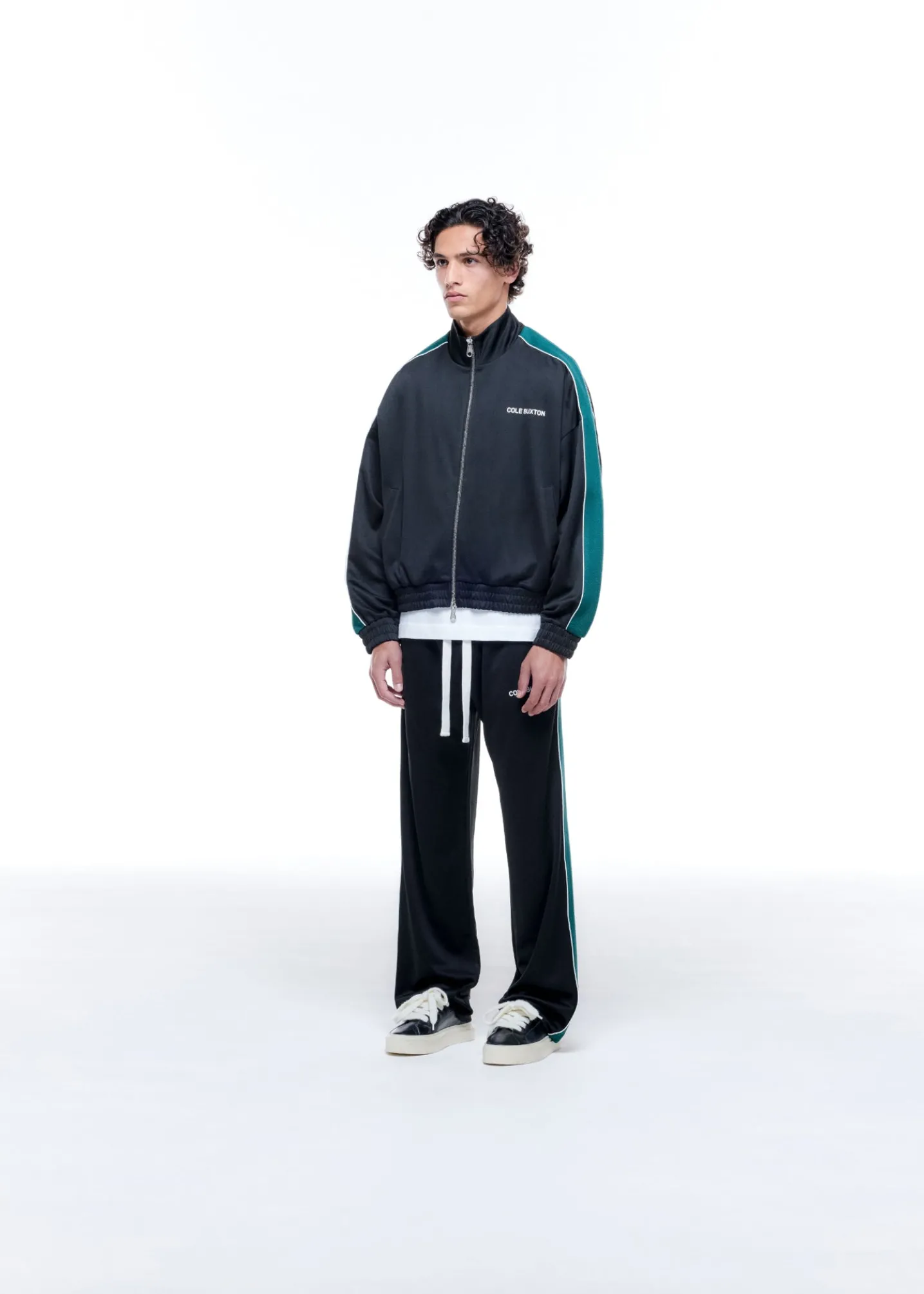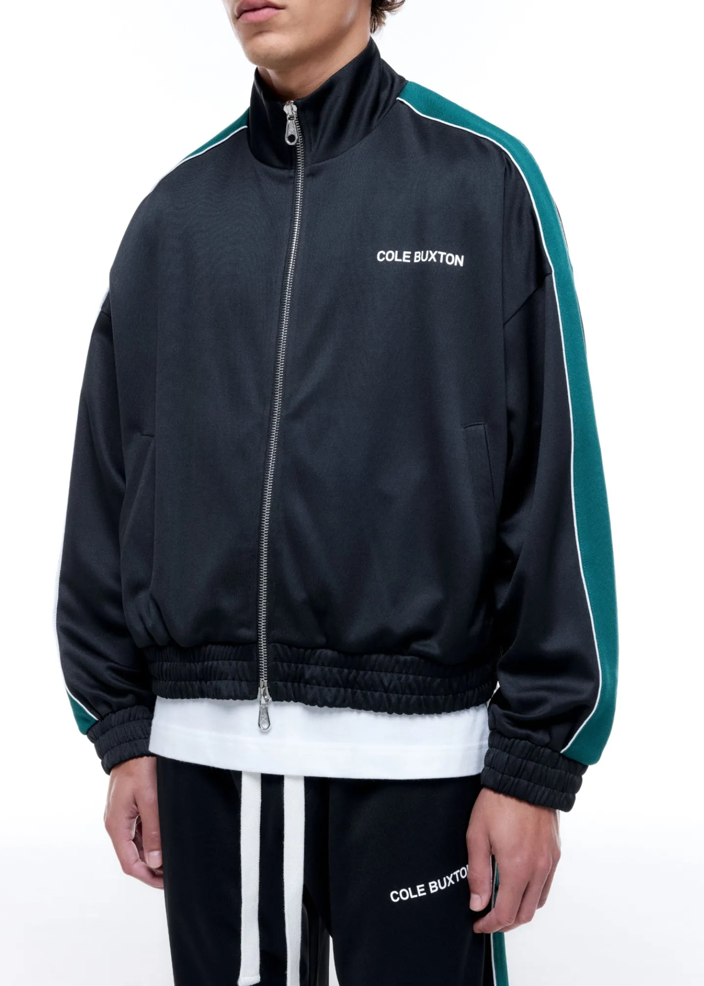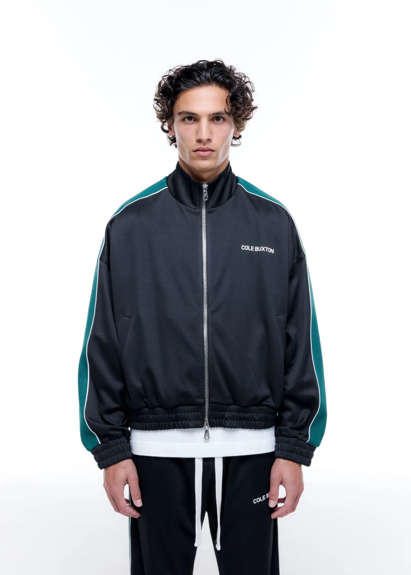 Cut from our drapey interlock polyester in a classic cropped track jacket silhouette, featuring a screen printed Cole Buxton logo on the left chest, piped contrast woven tape down the sleeves and finished with a 2-way CB branded zip.
