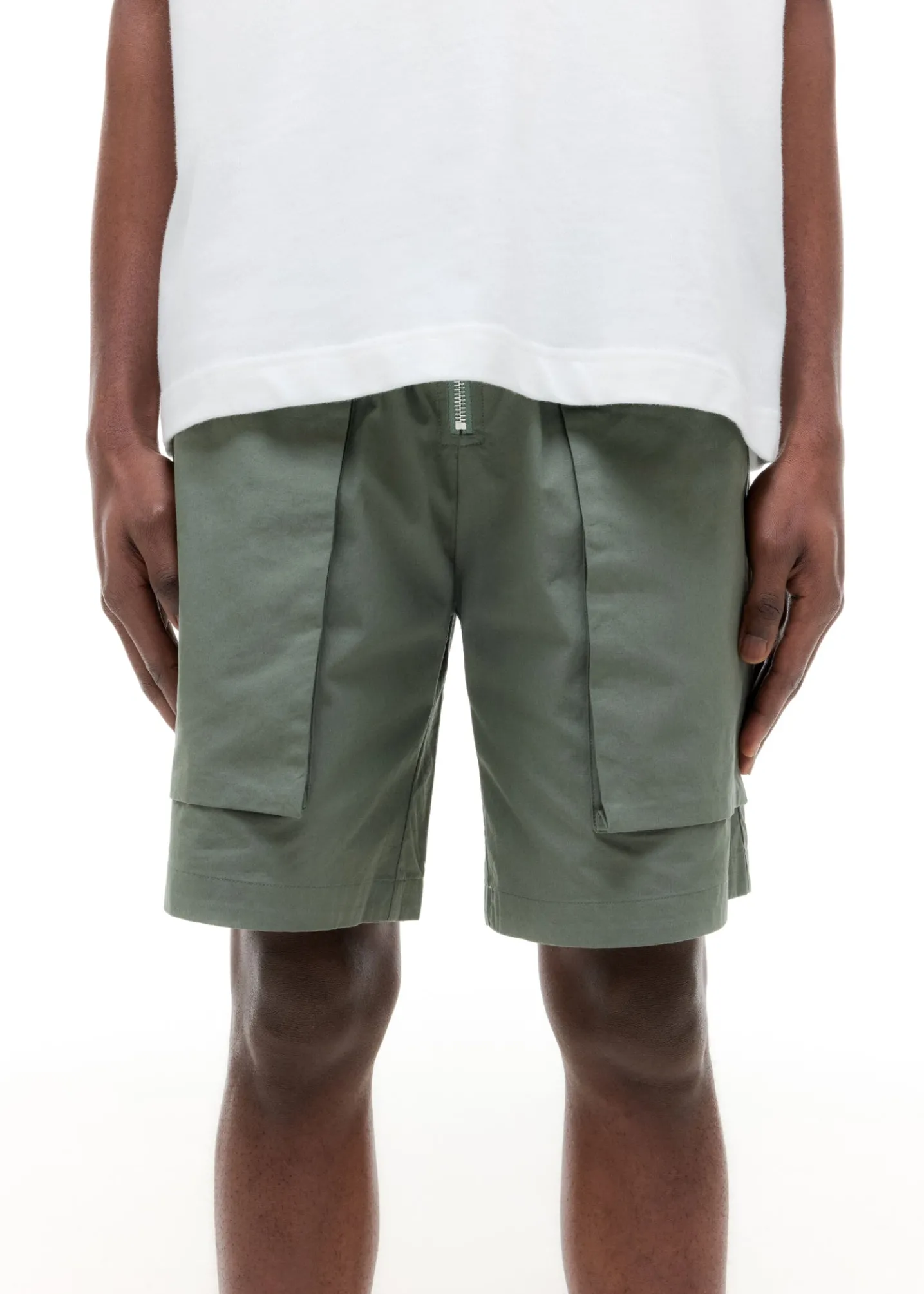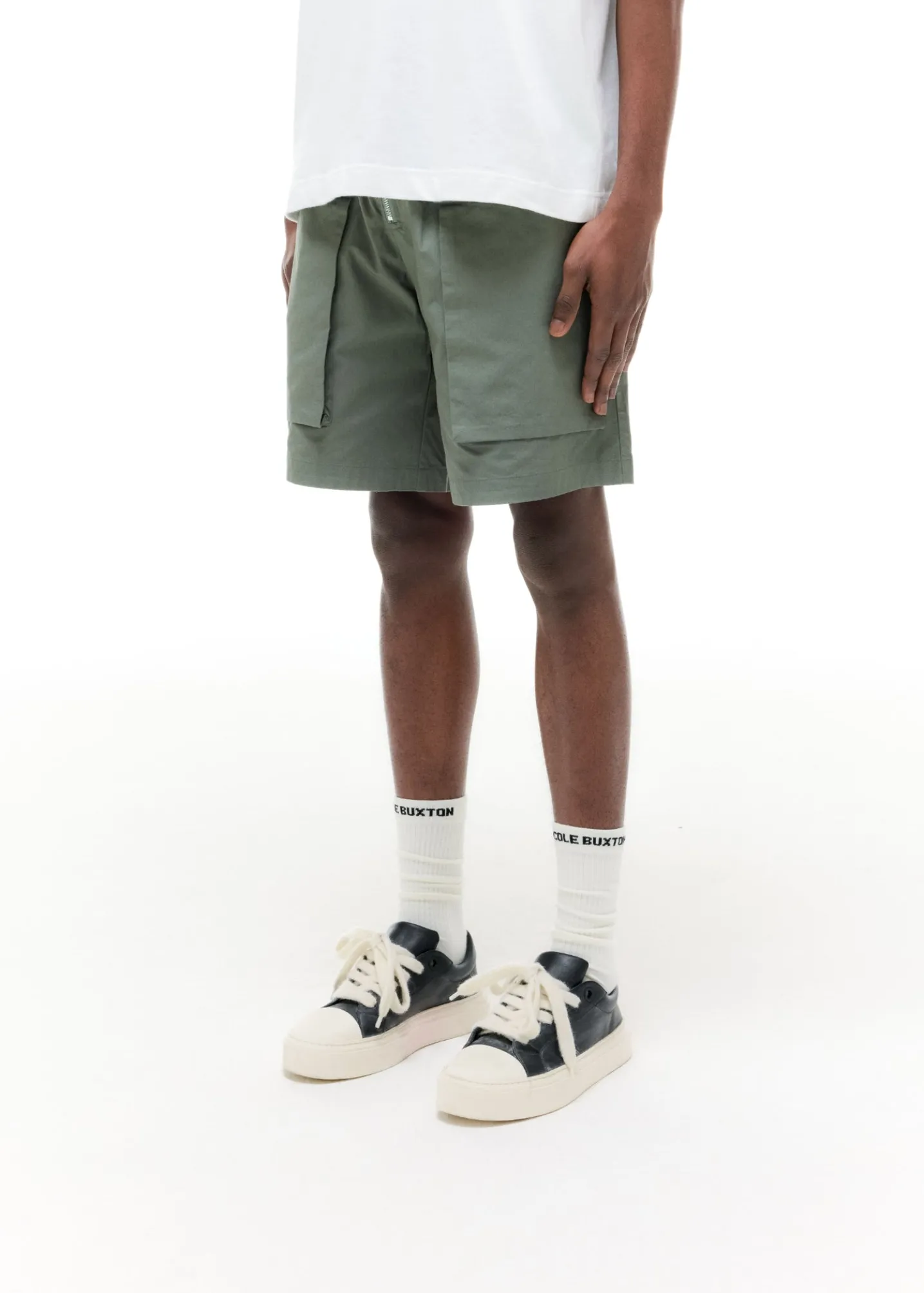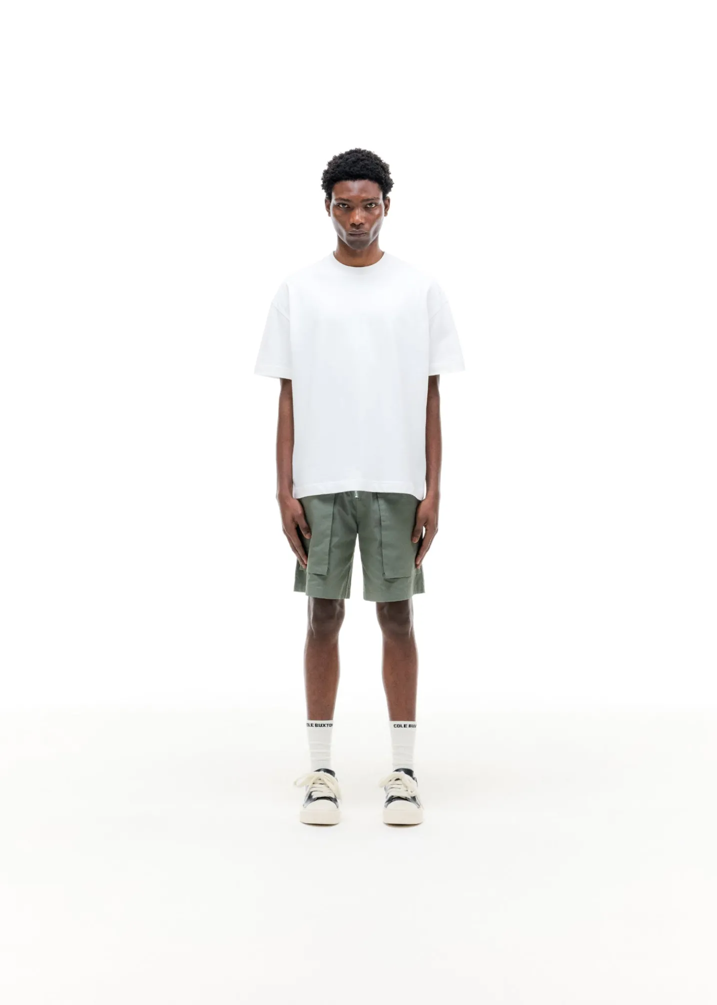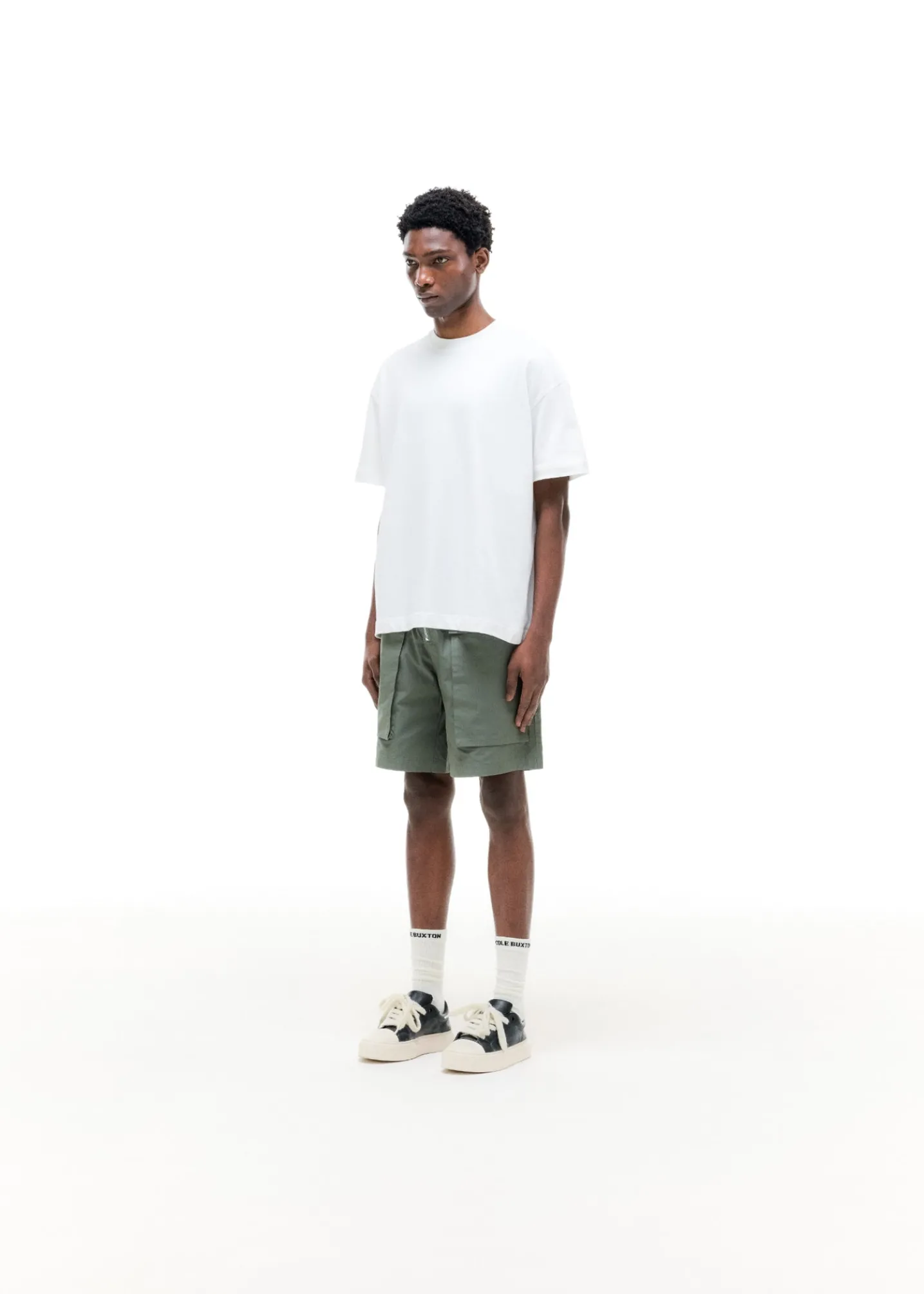 Our cargo shorts are a blend of classic menswear with design cues from military sportswear. The outer is cut from a luxury soft-faced cotton in a boxy silhouette featuring oversized front combat pockets, an elasticated waistband and finished with our CB branded exposed zipper.