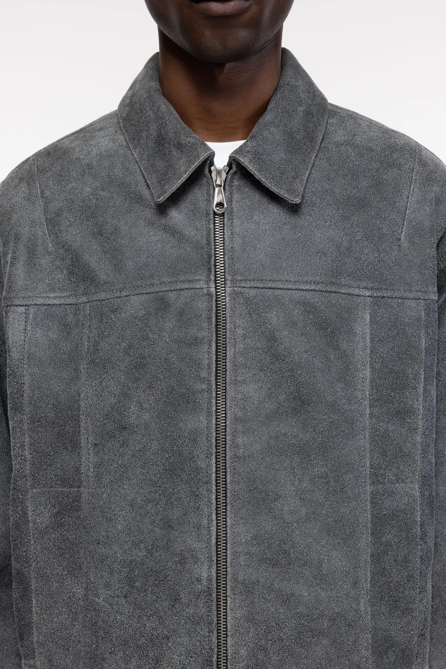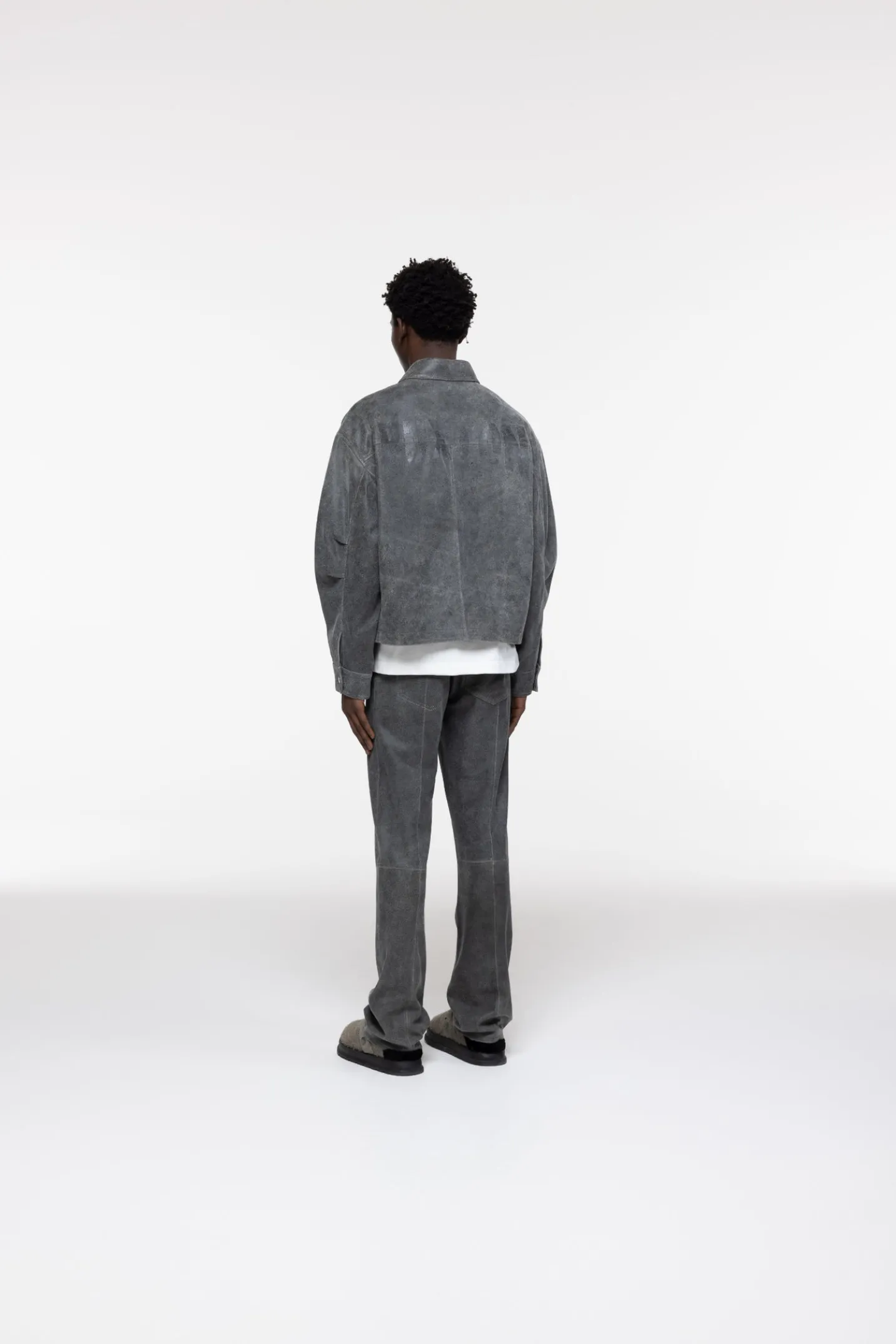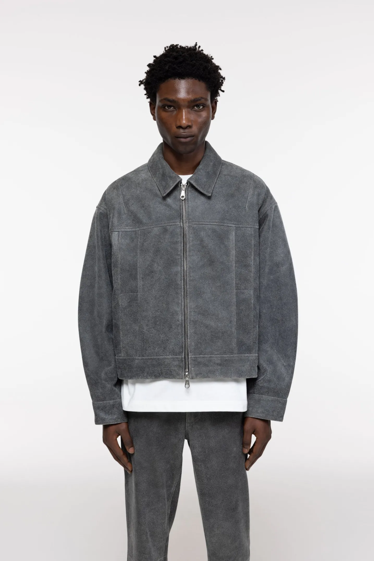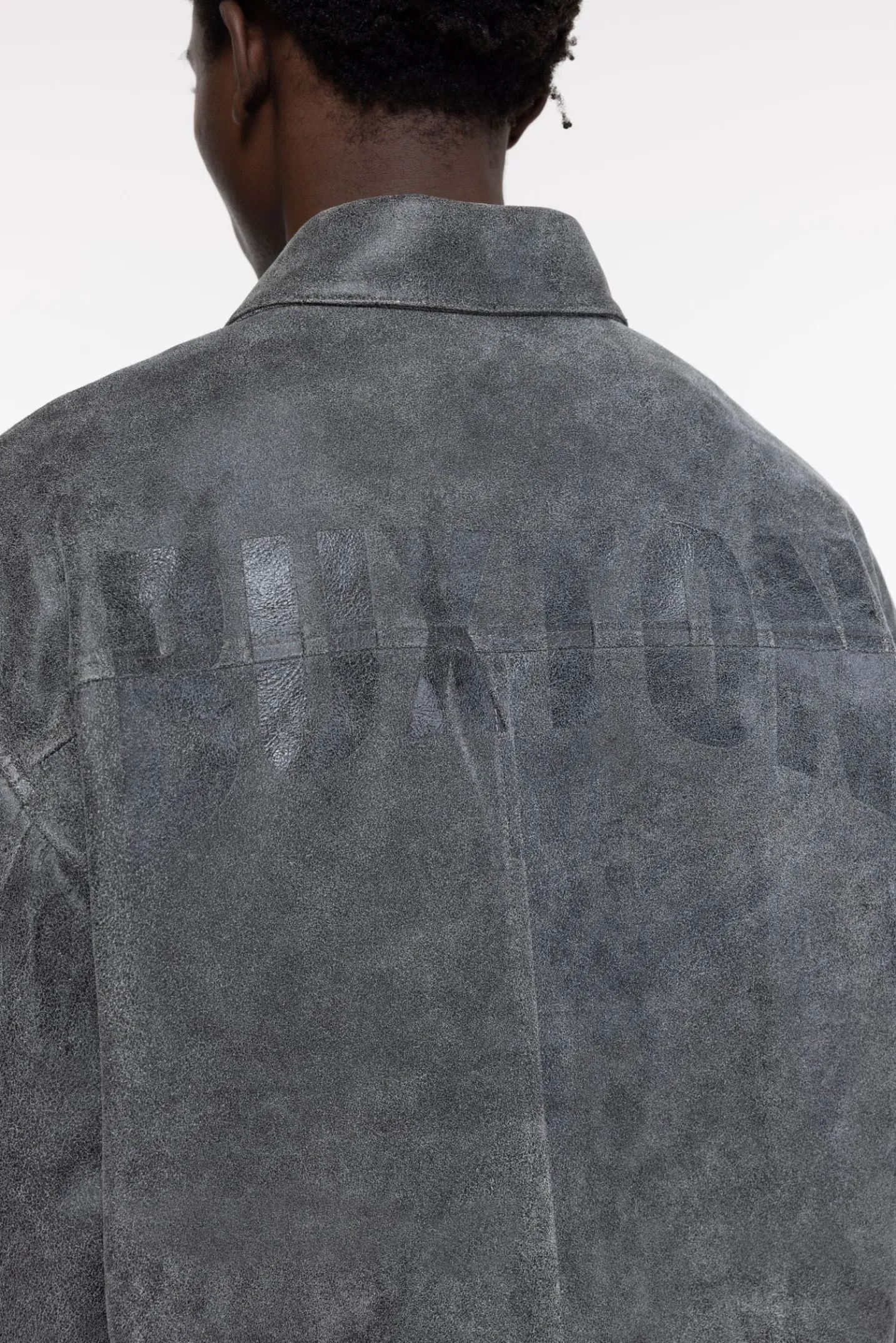 This crackedleather work jacket is luxury throughout, cut in a cropped silhouette with slightly dropped shoulders and a classic overshirt collar. The outer is an Italian soft cracked lamb skinleather with a “Buxton”embossing across the back. Featuring oversized double welt pockets and finished with a CB branded riri zip.