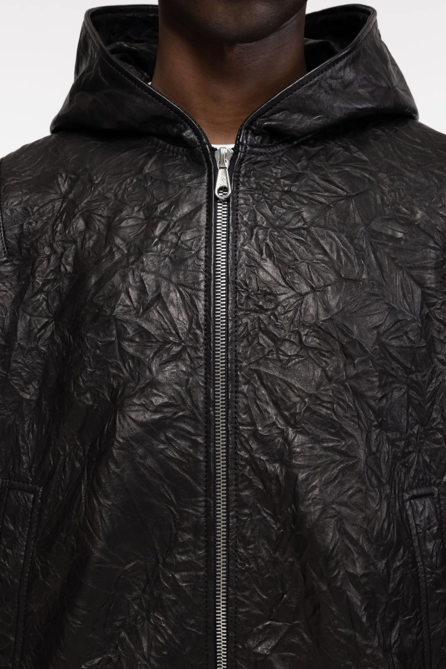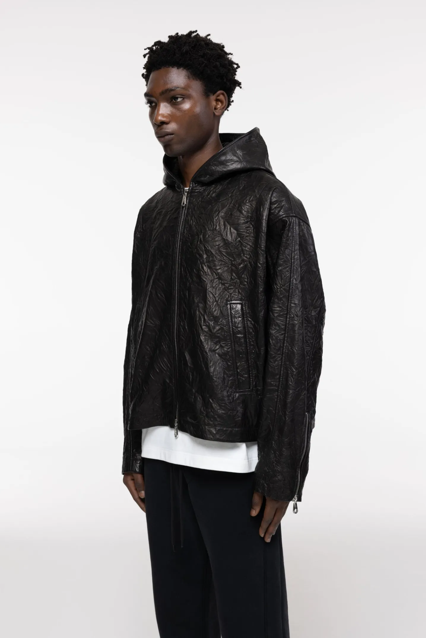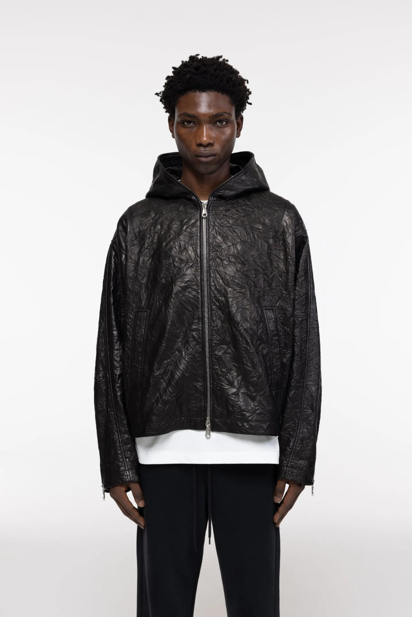 This hooded jacket is luxury throughout, cut from a super soft crinkled Italian leather in an oversized cropped silhouette. Featuring two jet pockets, zipped cuffs and finished with a two-way CB riri zip.