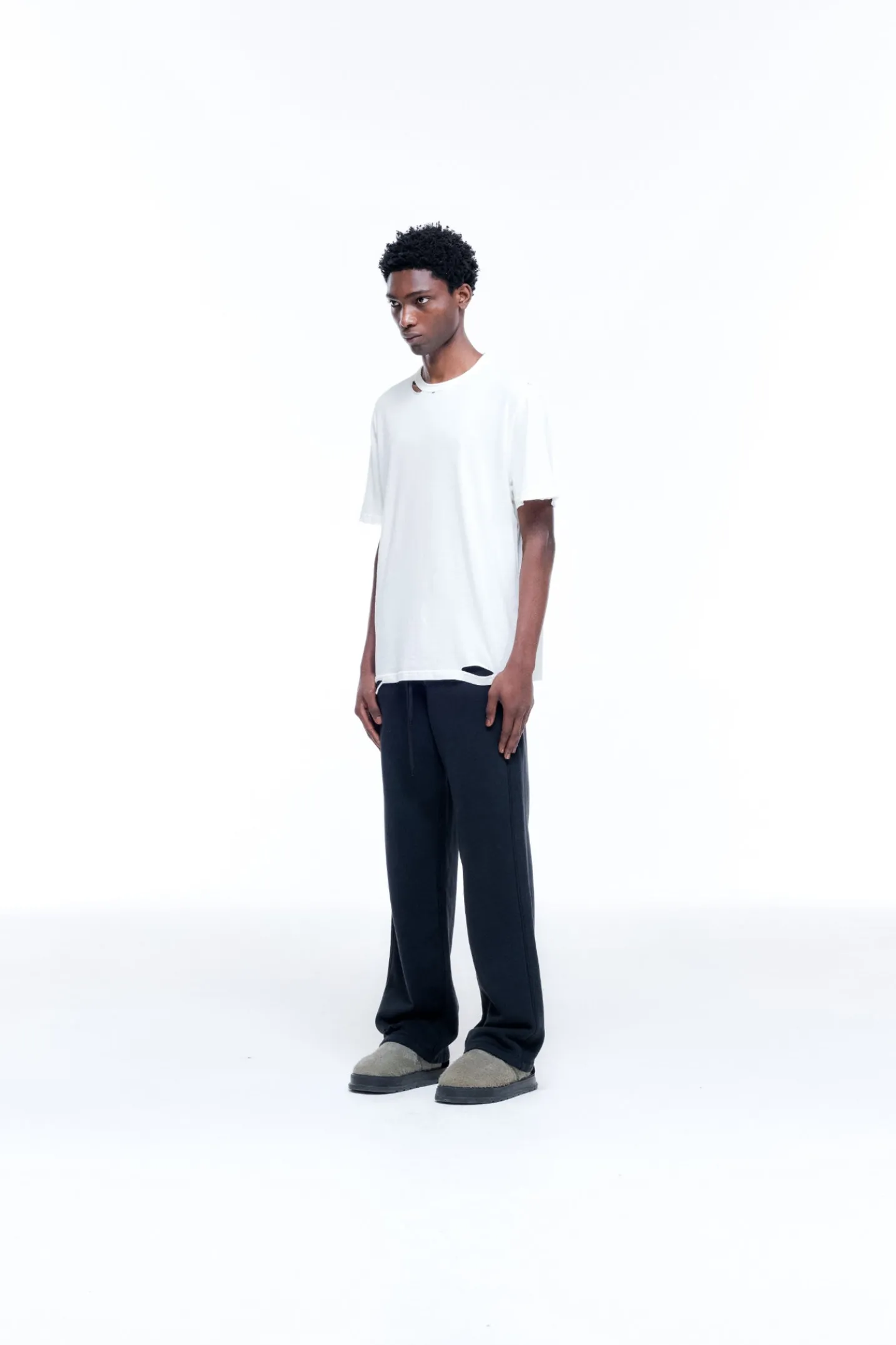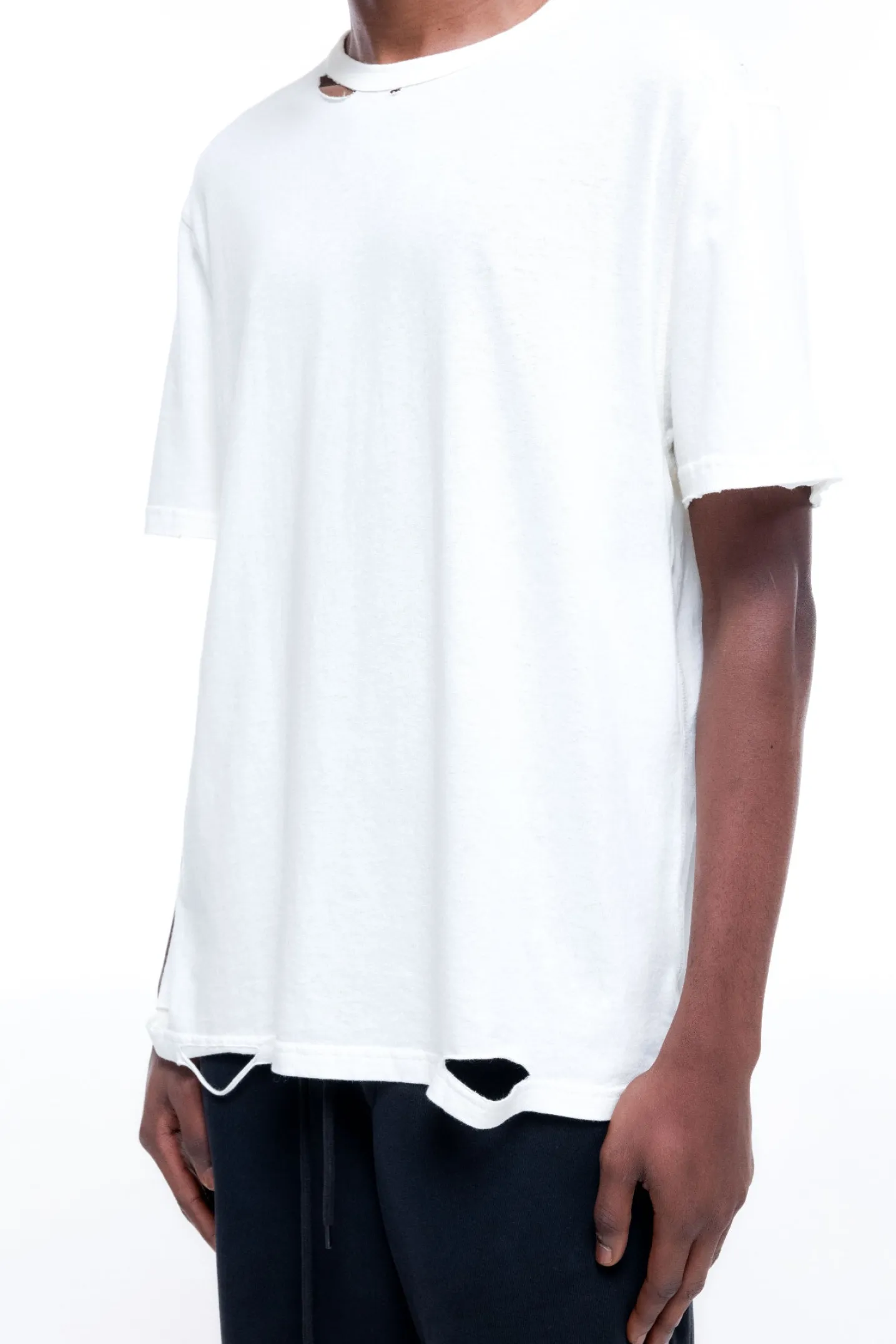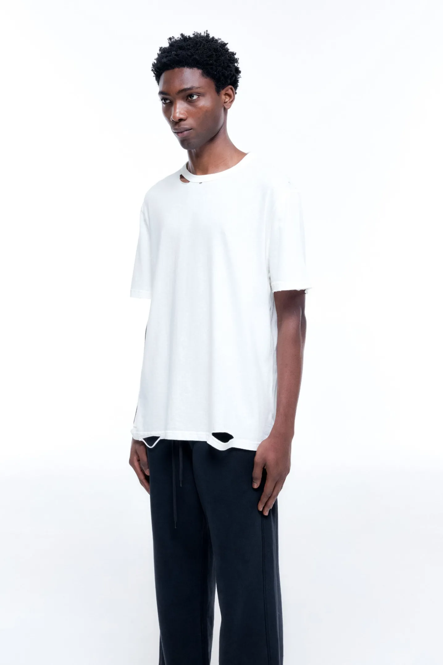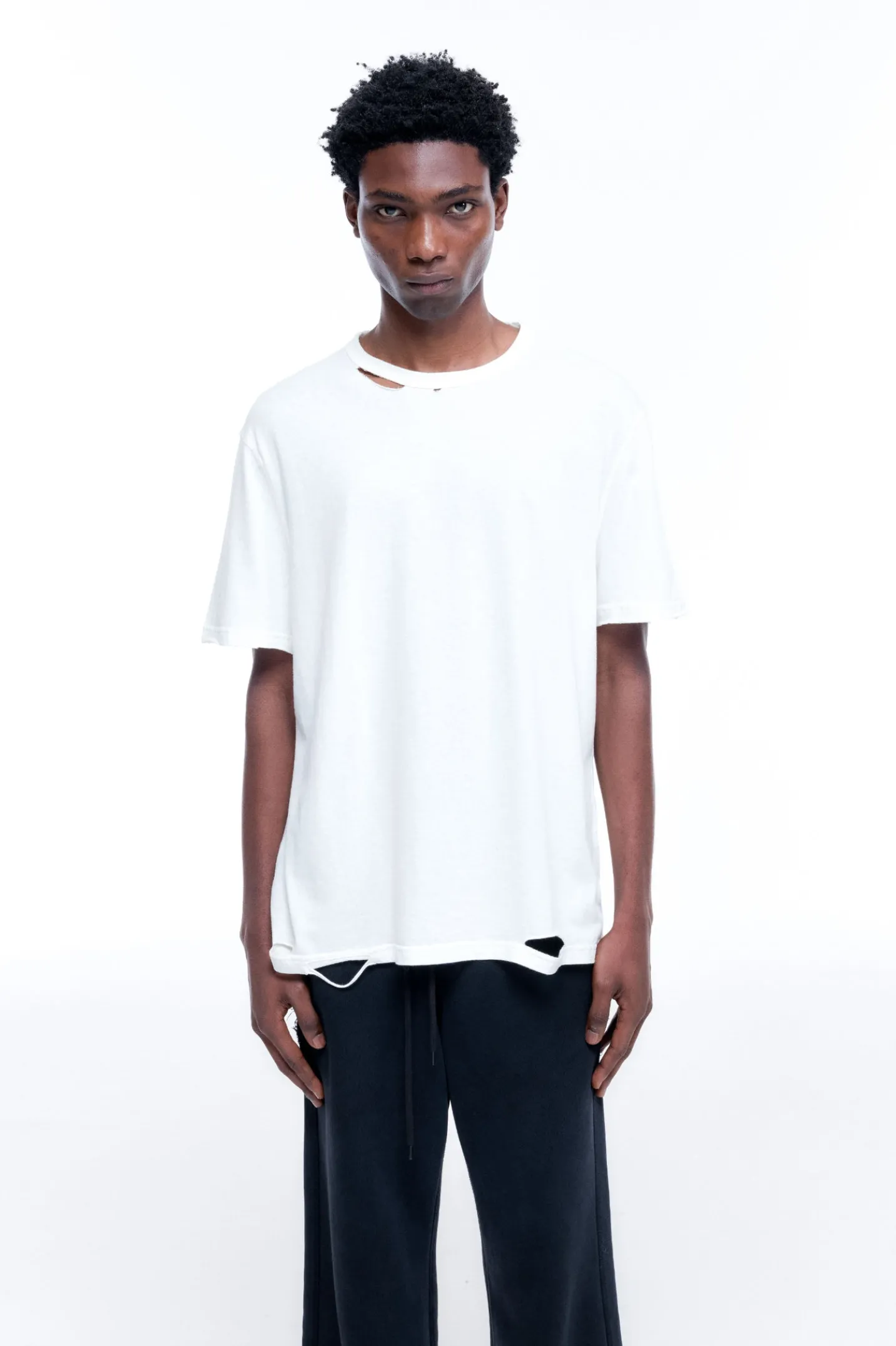 The Cole T-shirt is the newest offering in our t-shirt silhouettes. Cut in a more athletic shape from an open ended lightweight drapey cotton featuring a self fabric collar, coverstitched detailing throughout and a tonal classic embroidery on the back neck. We have subtly distressed this by hand to mimic vintage single jersey tshirts.