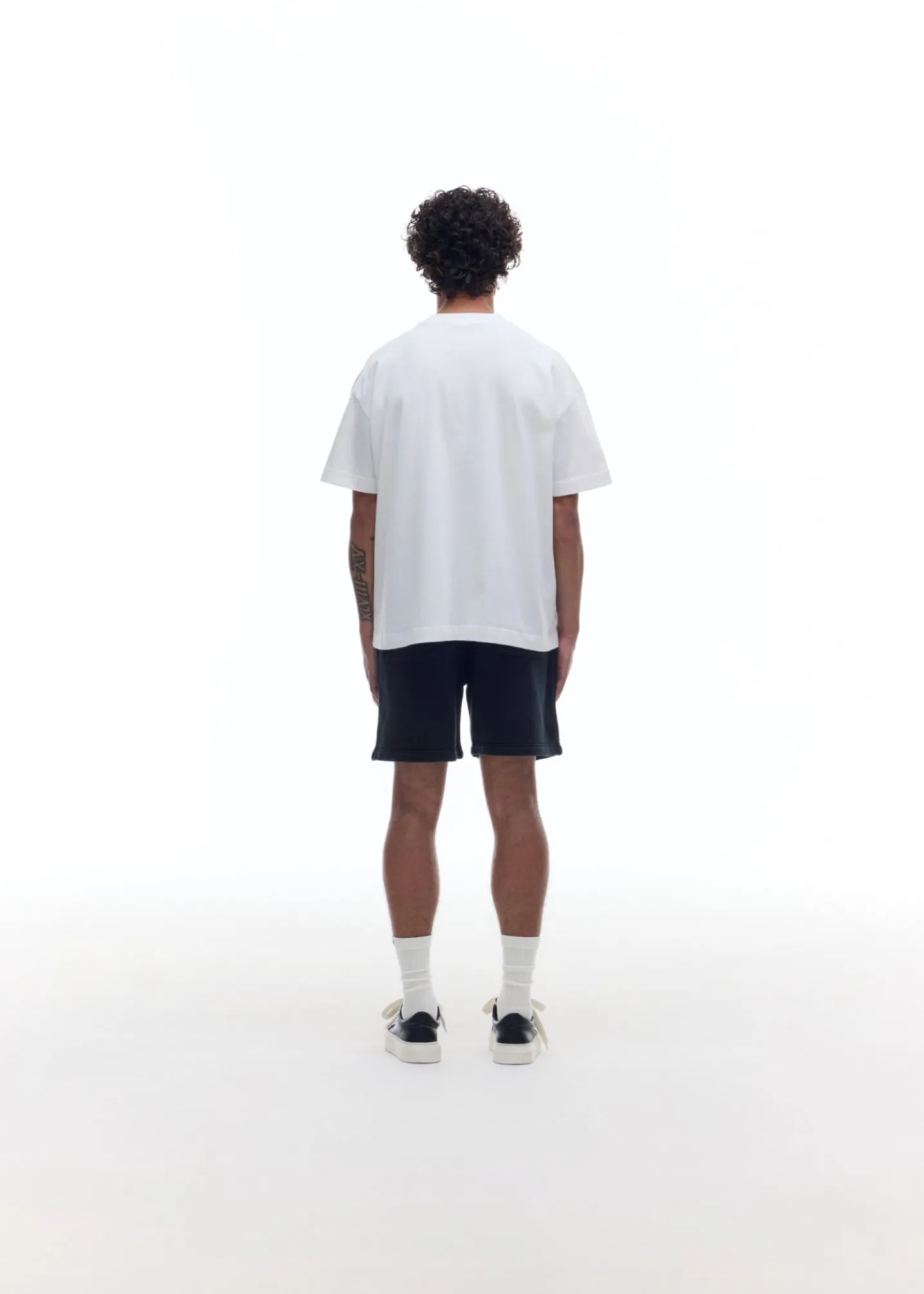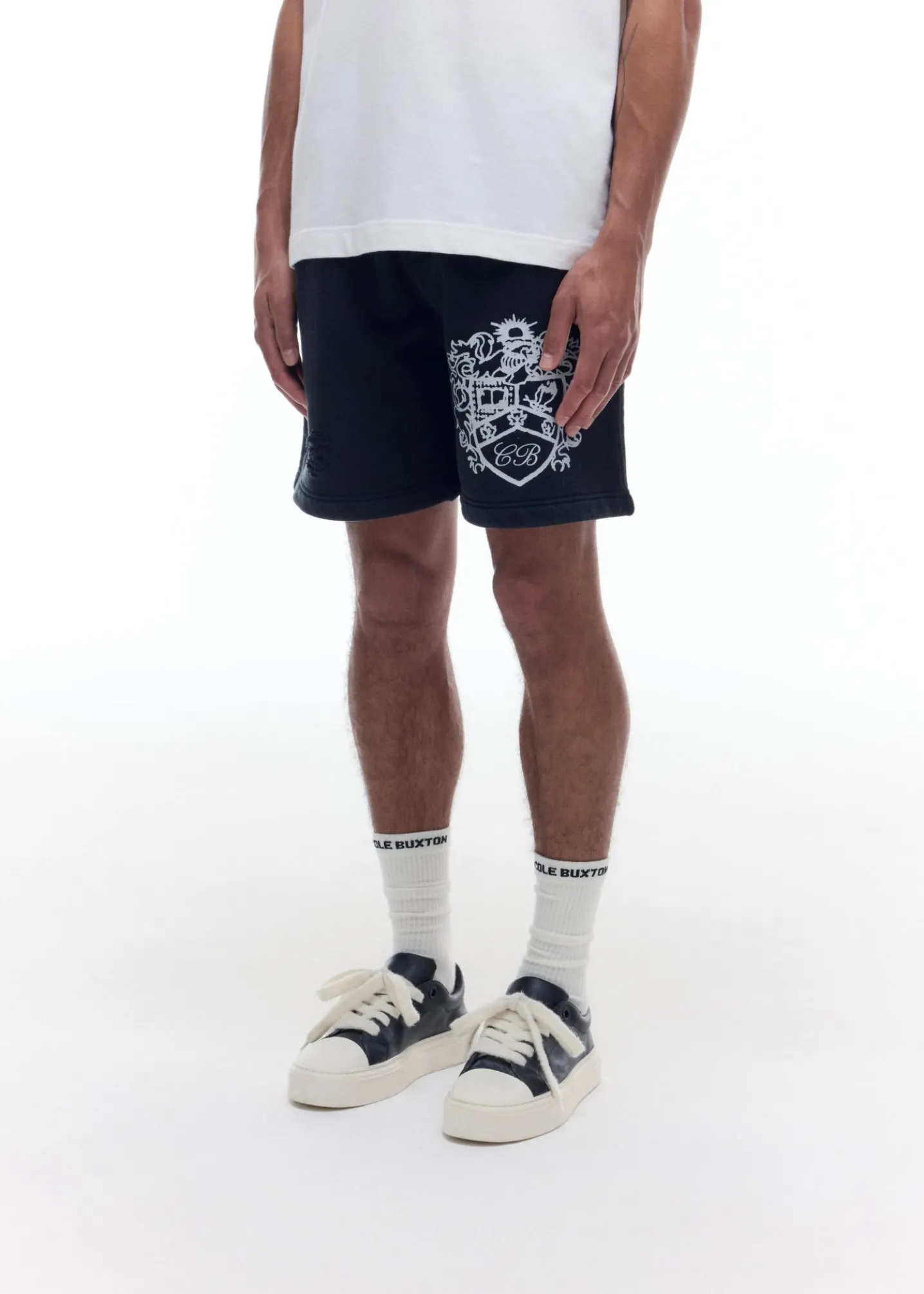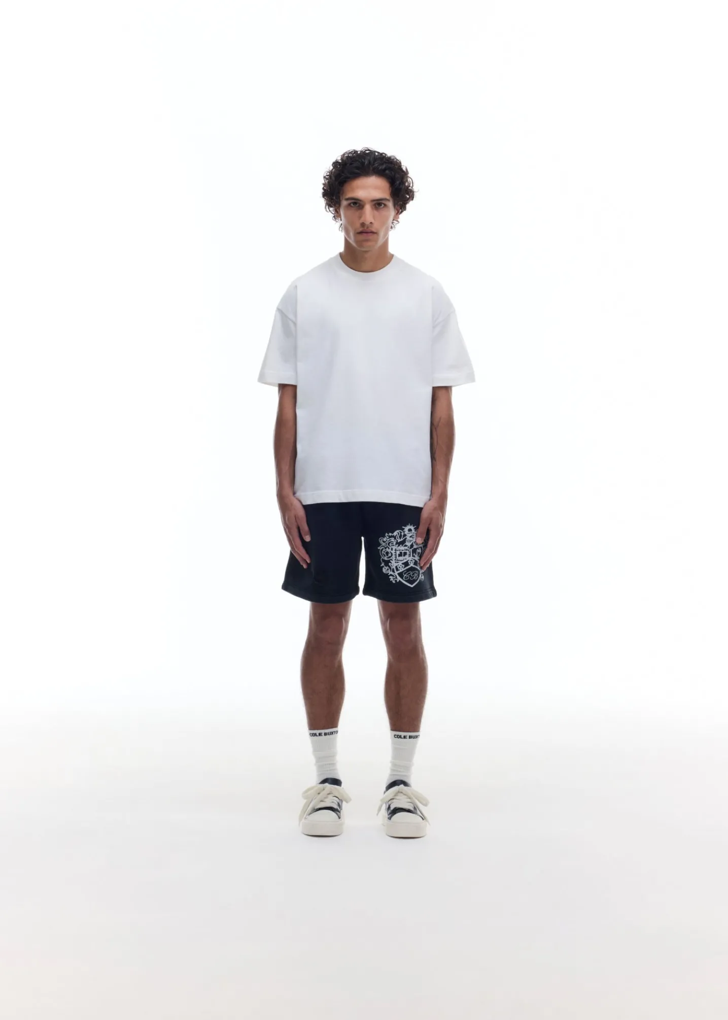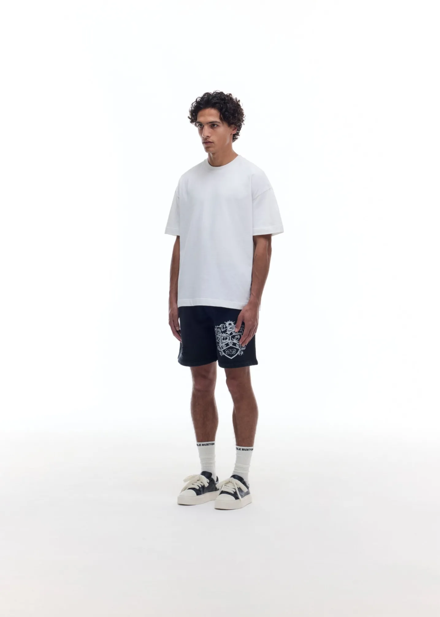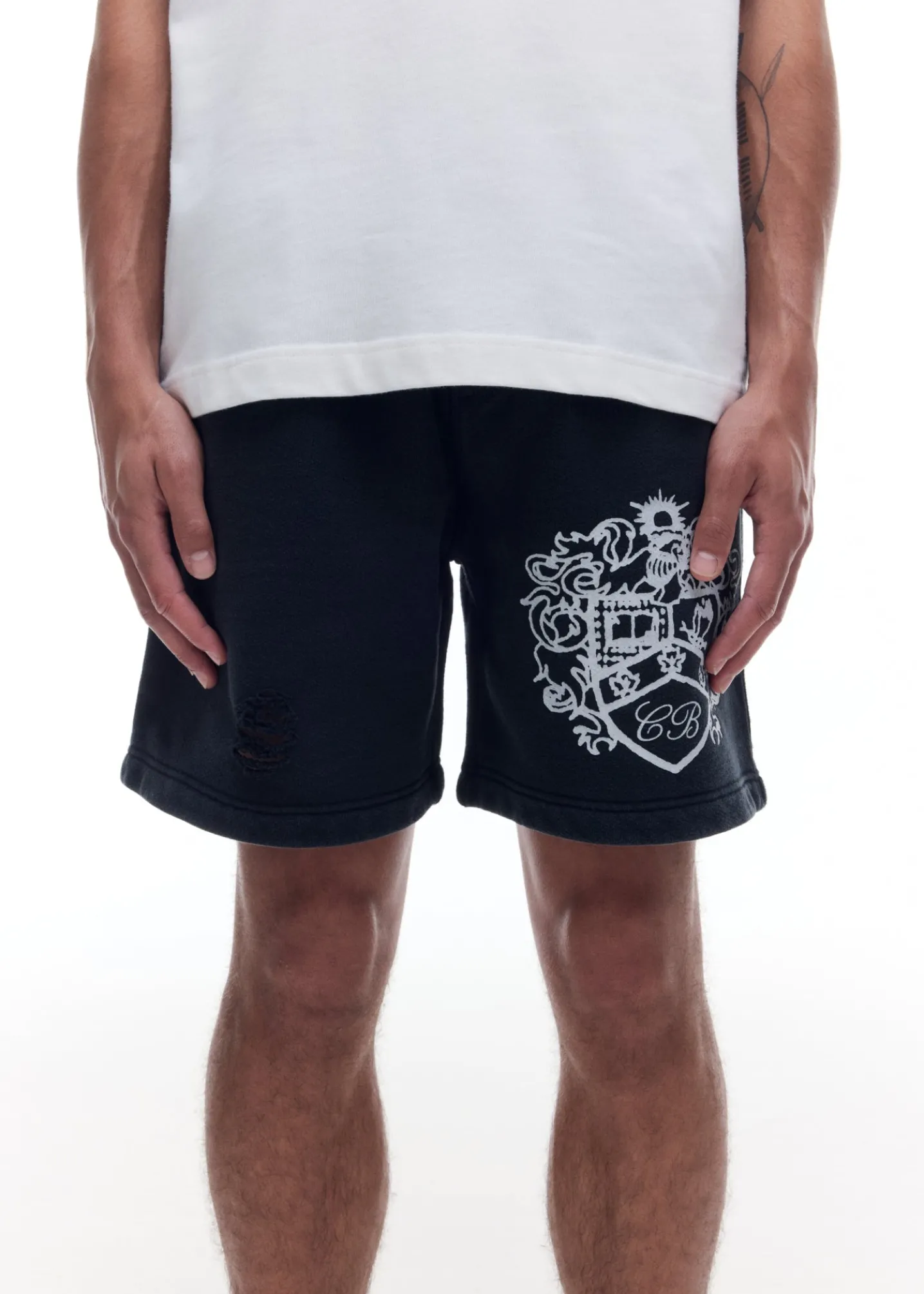 These distressed shorts are brand new for ss25. We’ve developed a brand new 500gsm half brushed American fleece for this that’s heavy in weight yet has a luxury drape. The silhouette is boxy and old school and features our collegiate crest print on the left thigh.