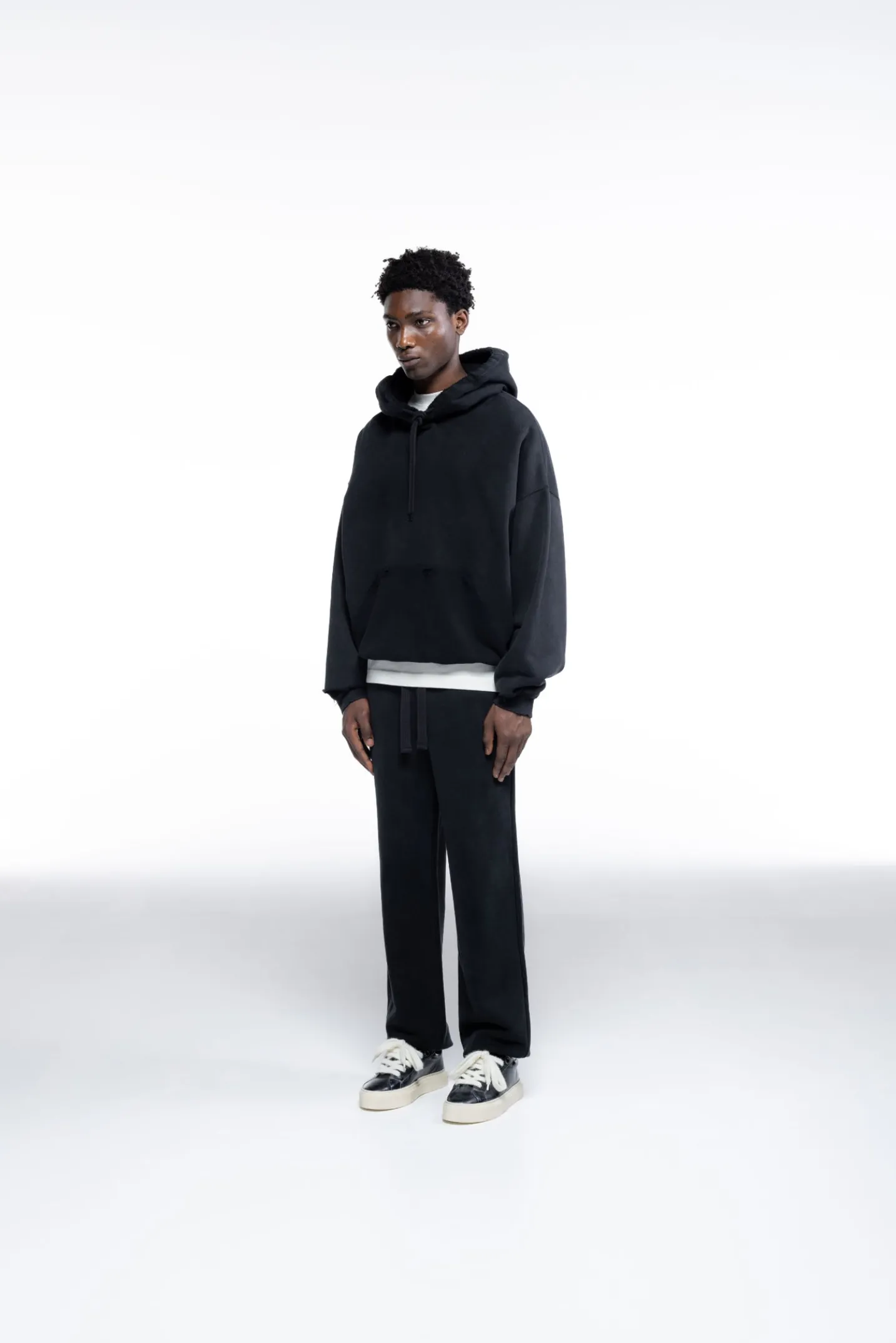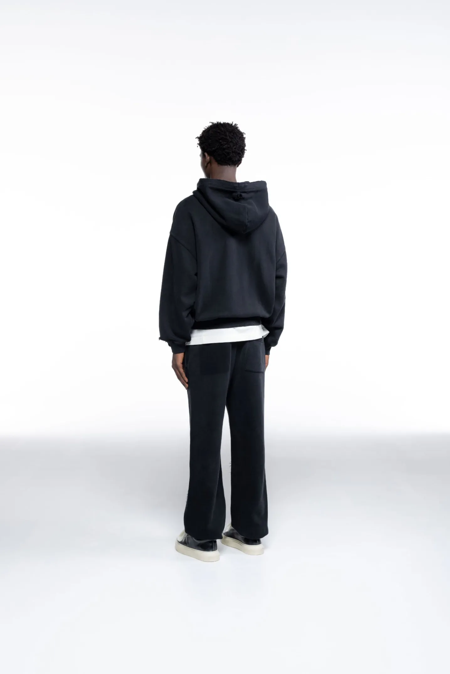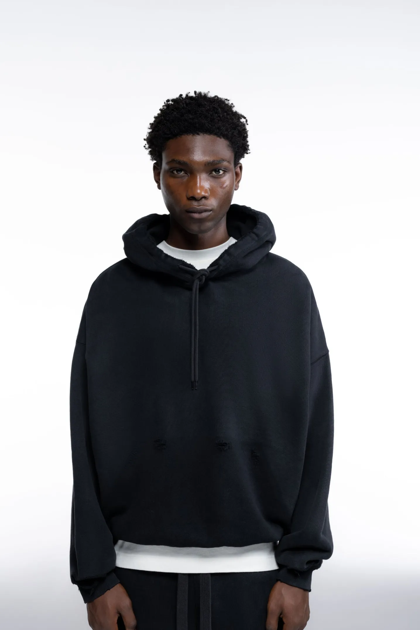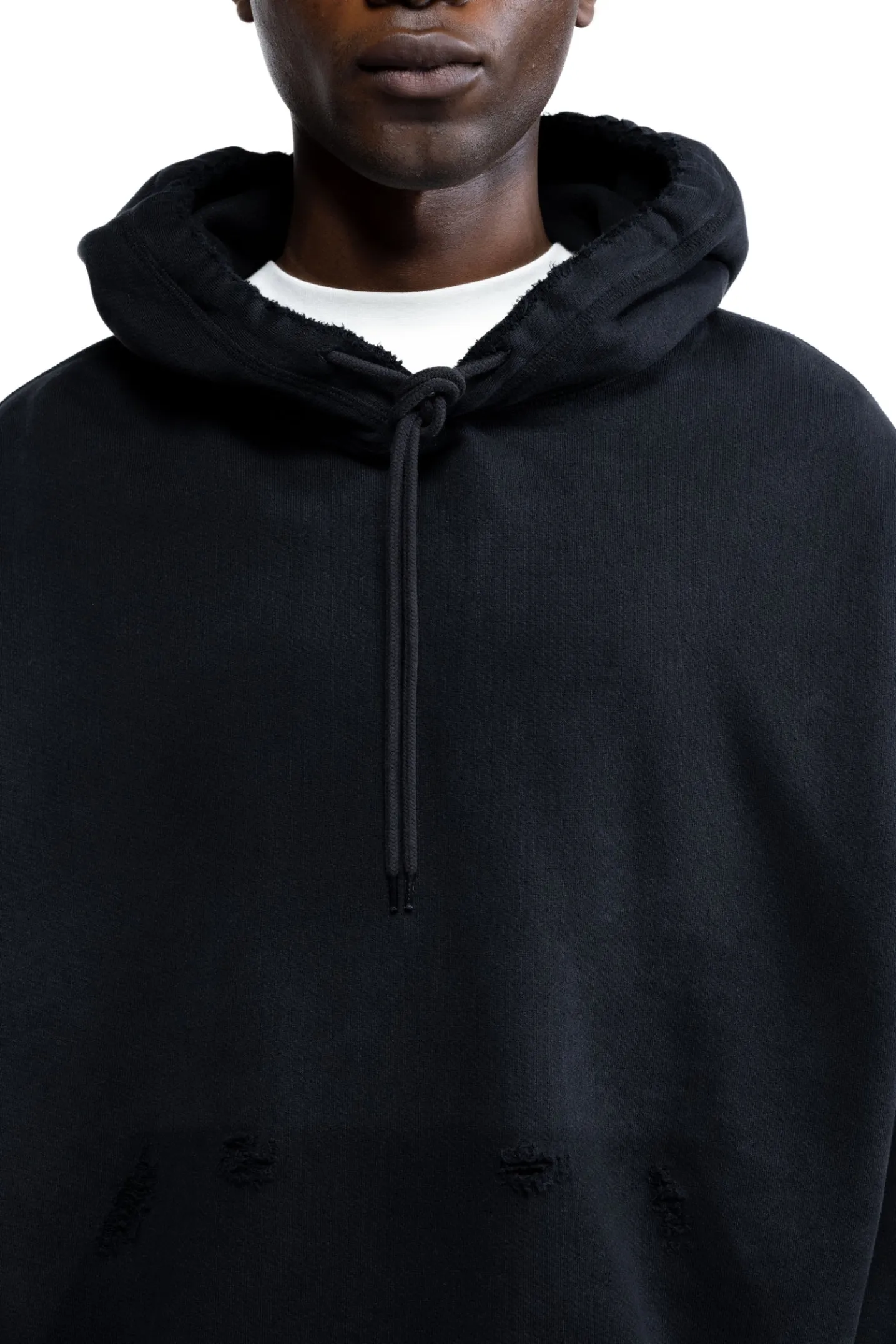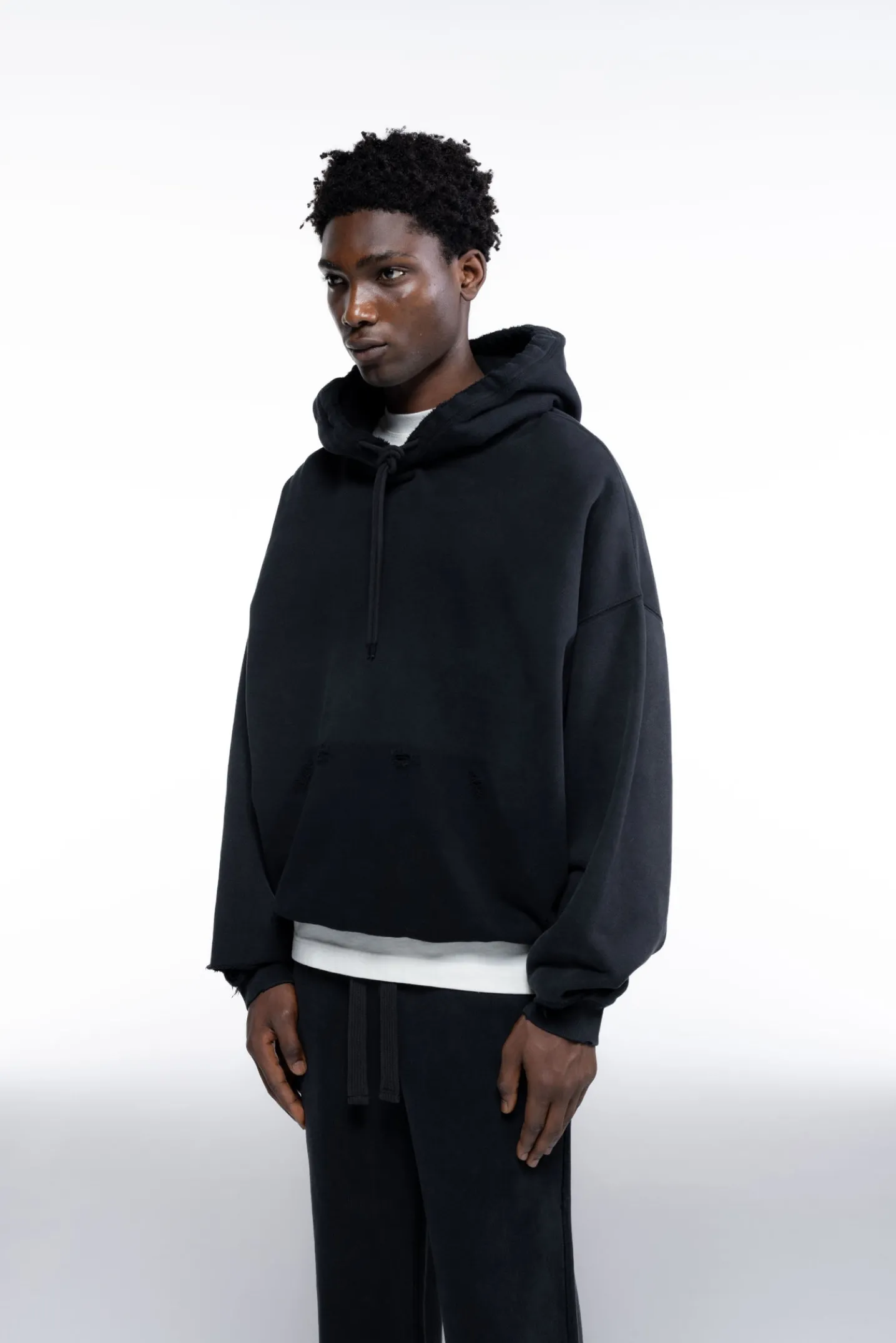 The distressed hoodie, a brand new hoodie for AW24. We’ve developed a brand new 500gsm half brushed American fleece for this that’s heavy in weight yet has a luxury drape. We have heavily washed this then removed the pocket to reveal its darker unwashed silhouette. The distressing has been done by hand mimicking my dad’s original CB hoodie from 8 years ago.
