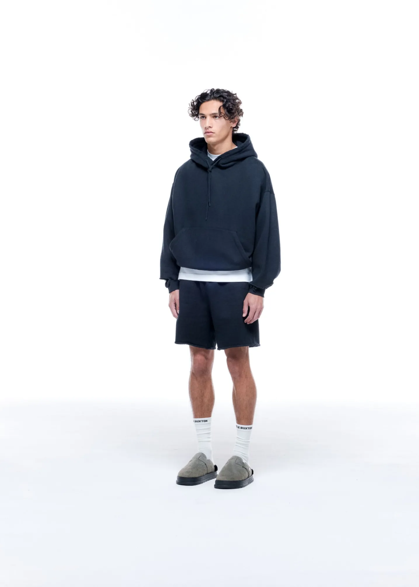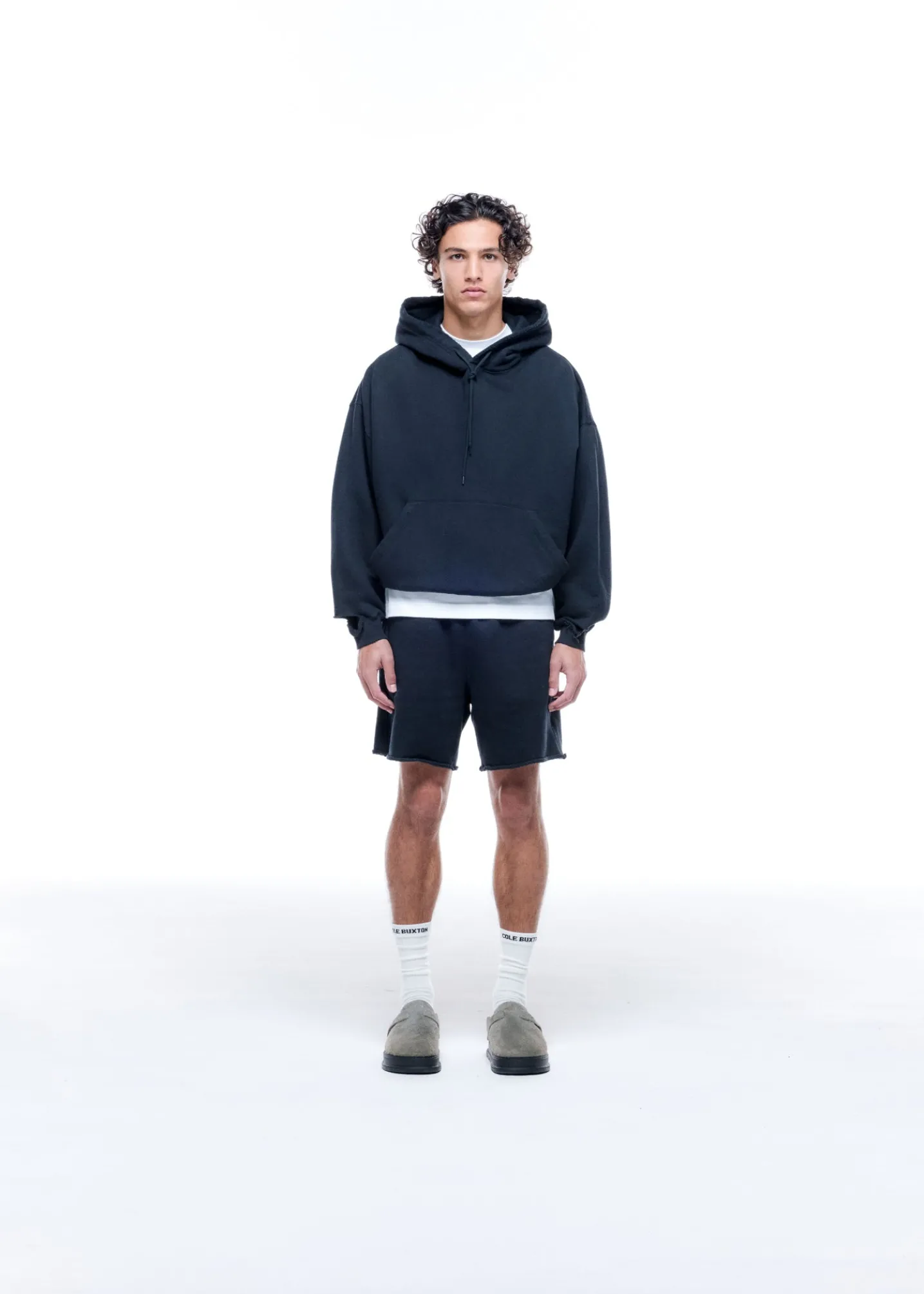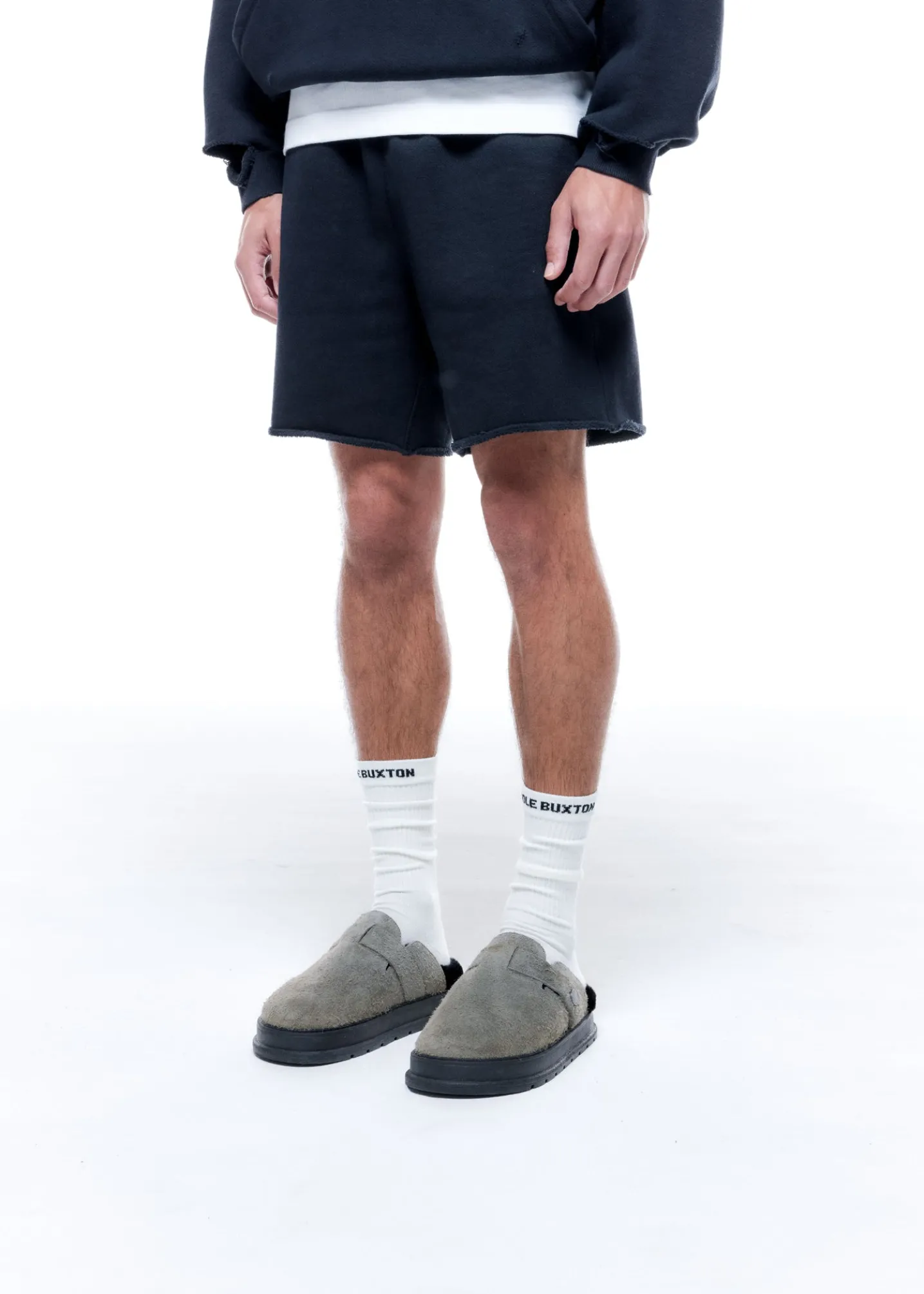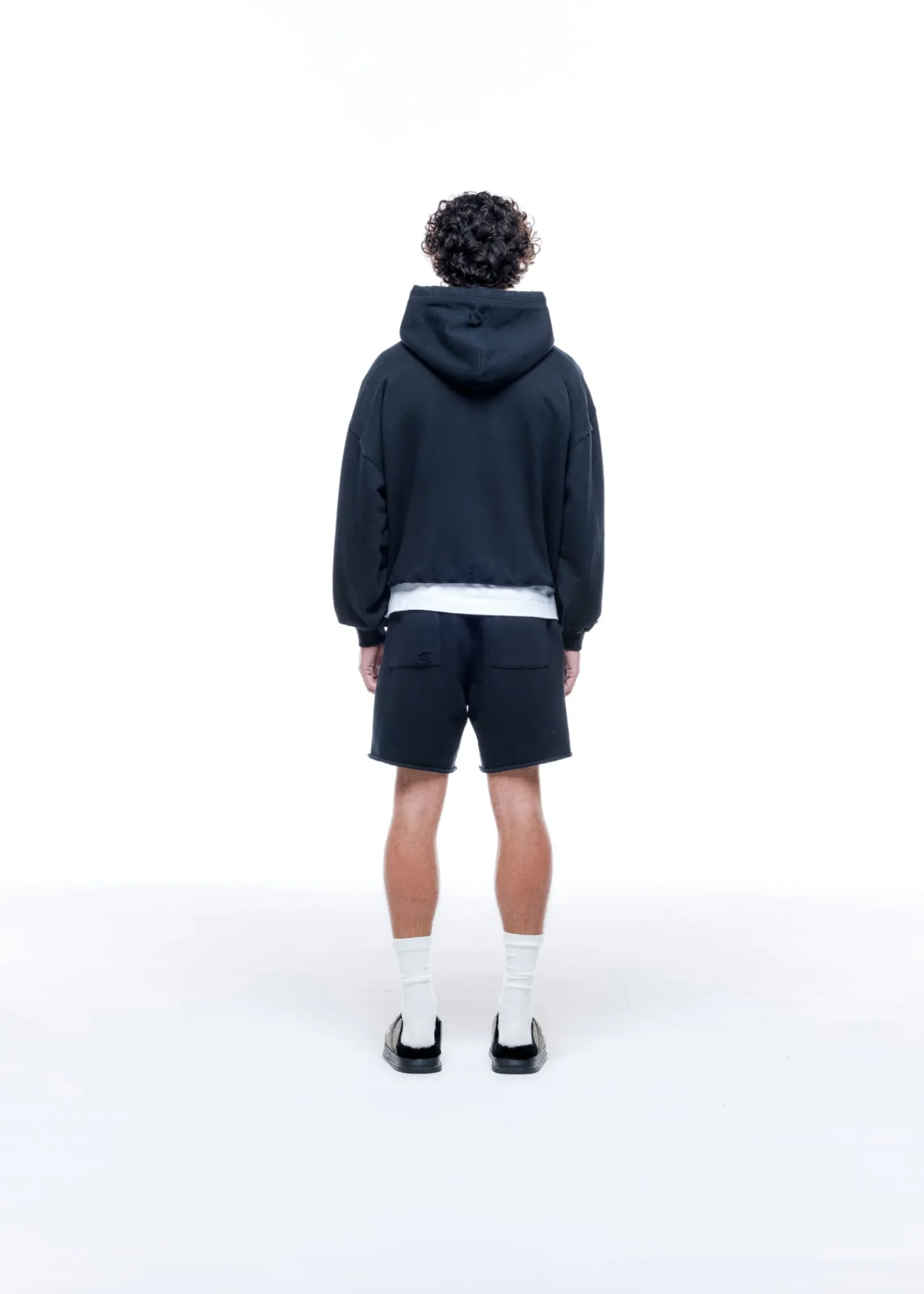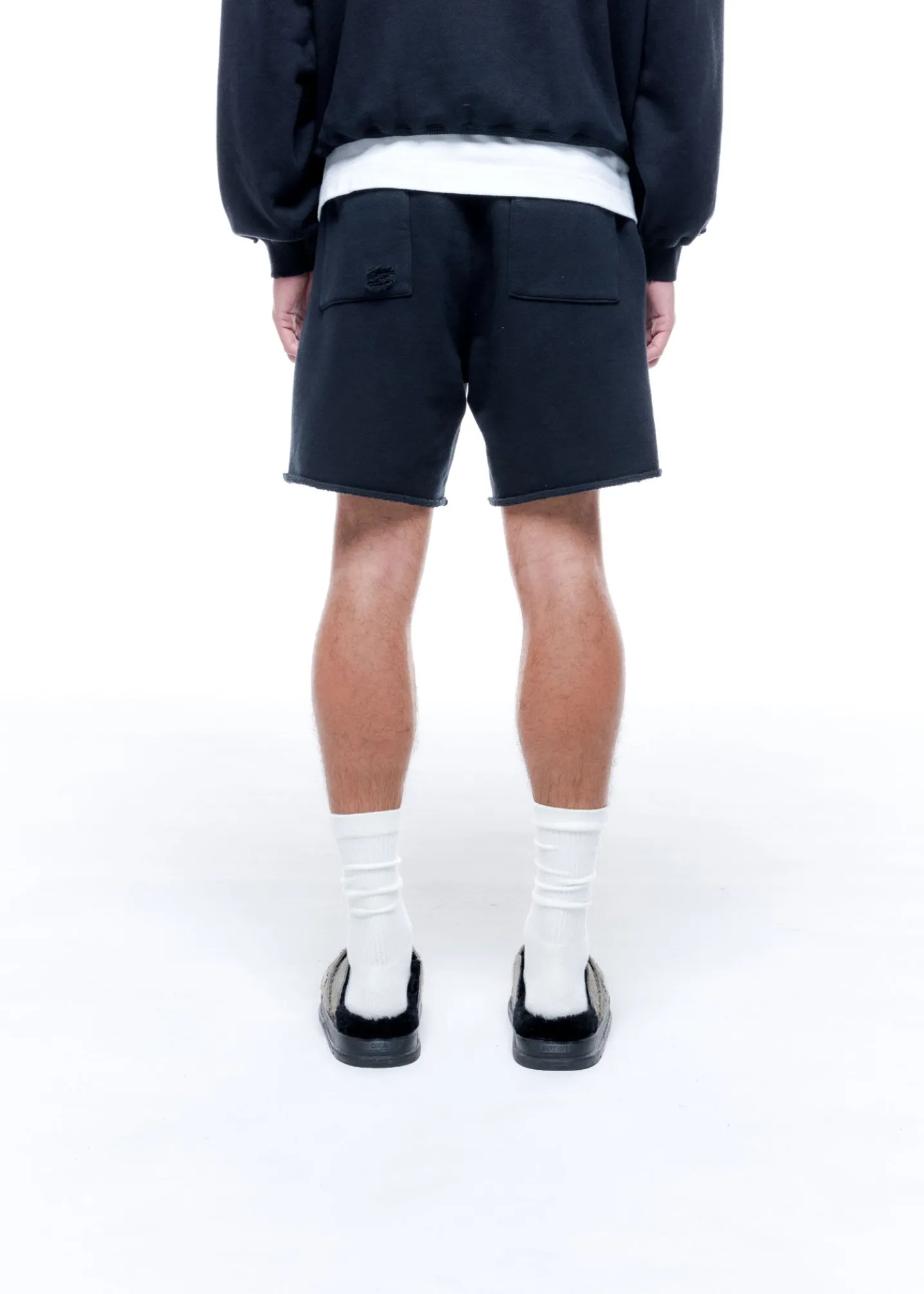 These distressed shorts are brand new for ss25. We’ve developed a brand new 500gsm half brushed American fleece for this that’s heavy in weight yet has a luxury drape. The silhouette is boxy and old school and we’ve heavily washed these and finished them with a rash hem to mimic those Americana classics.