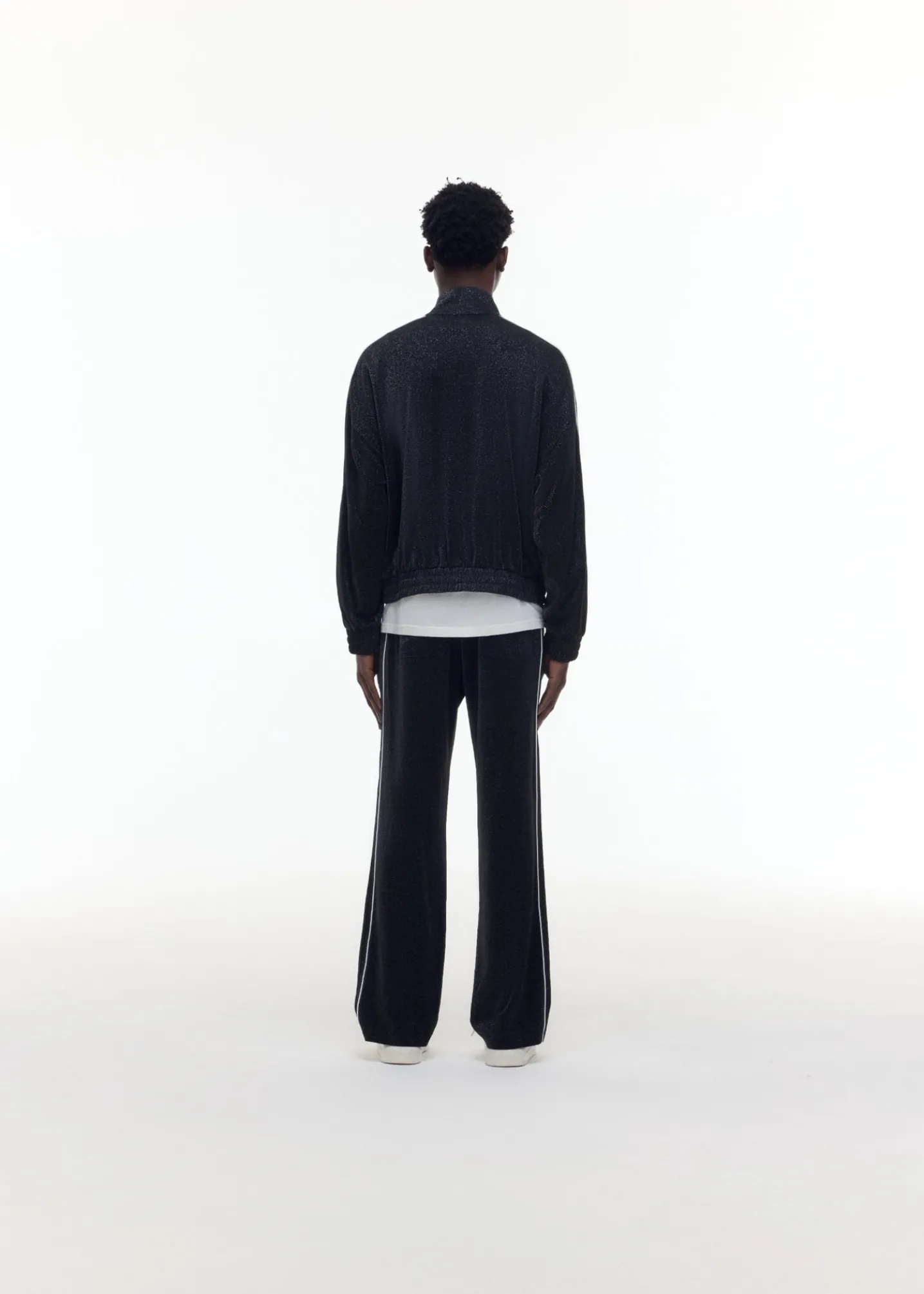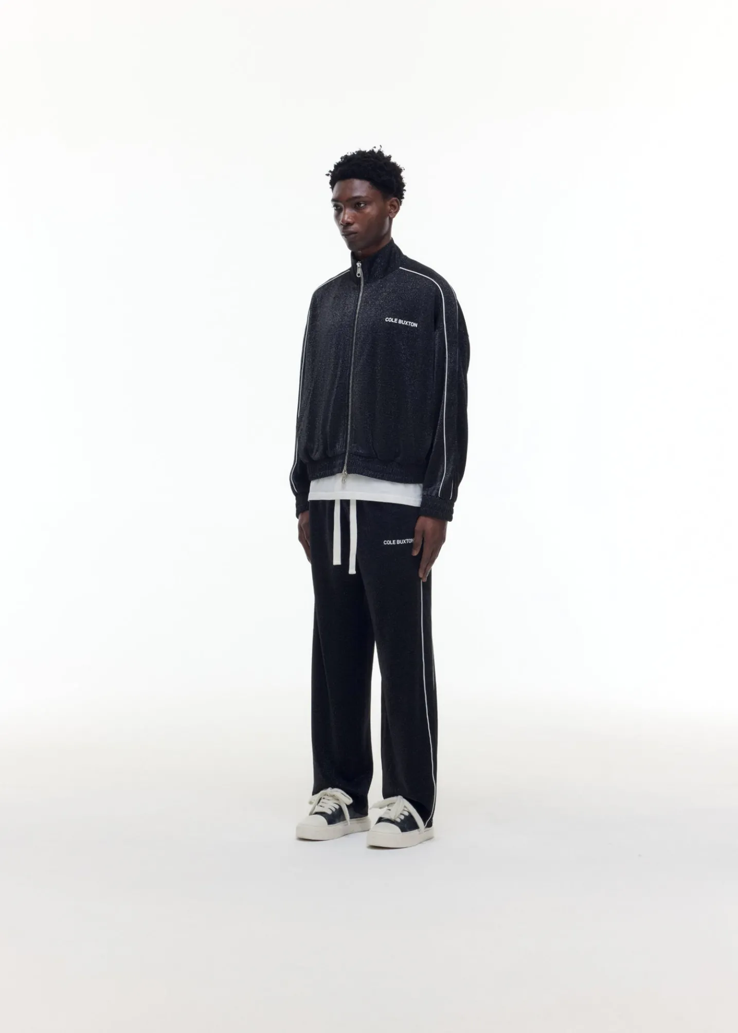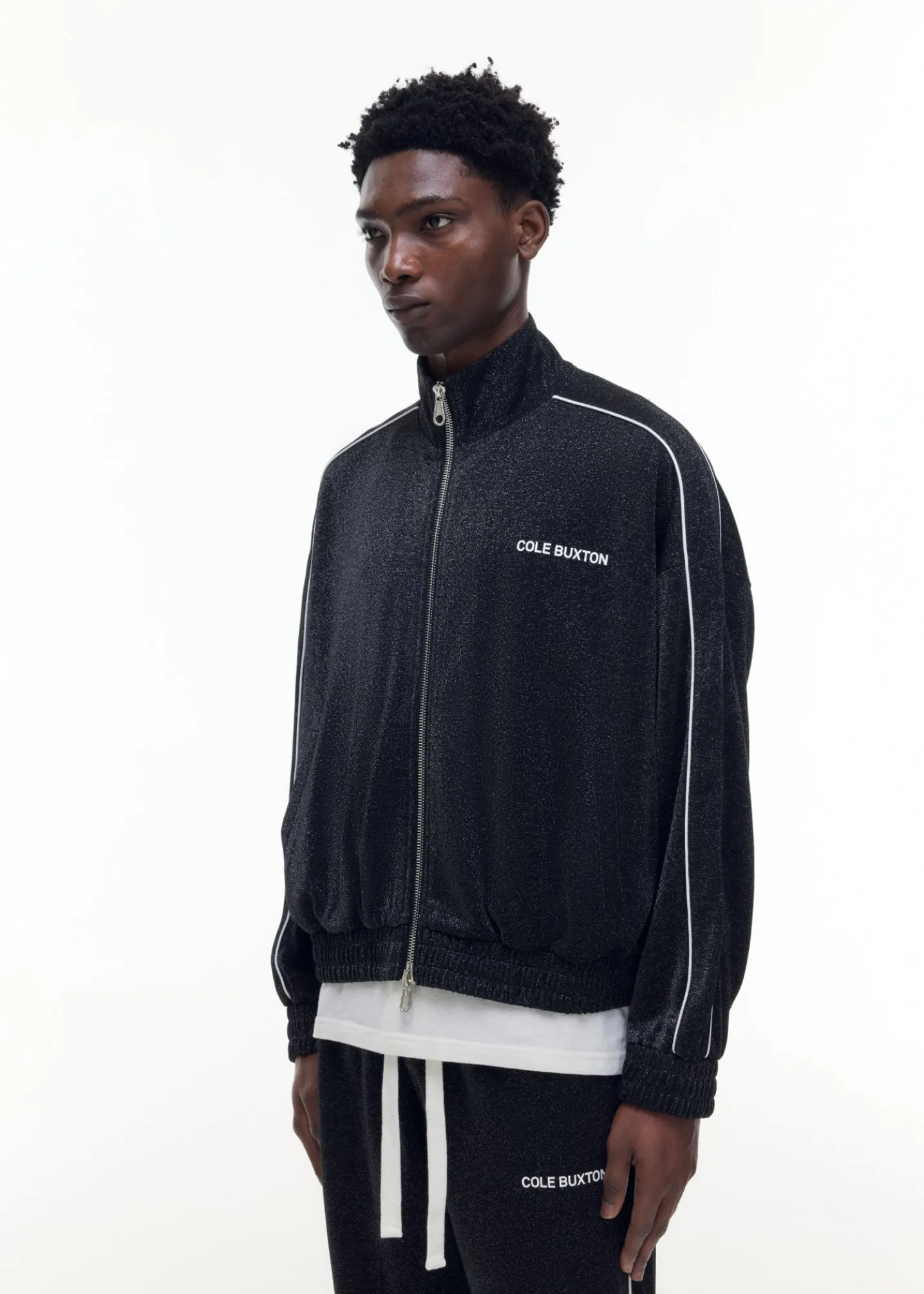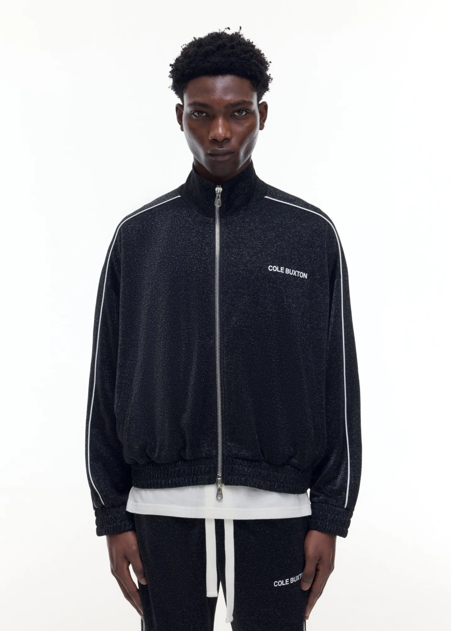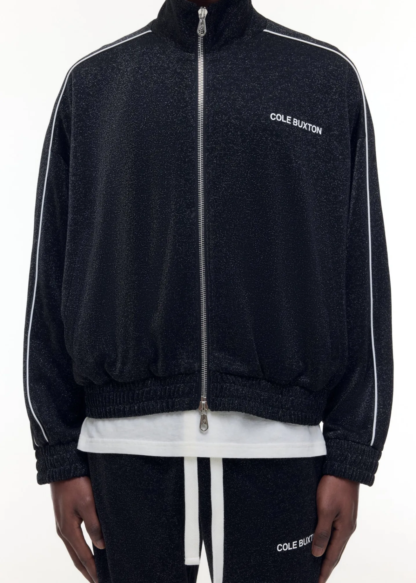 The glitter piped track jacket, a stand out piece from ss25. Cut from our drapey interlock polyester in a classic cropped track jacket silhouette, featuring a sporty Cole Buxton print on the left chest and a double piped side panel inspired by 90s track and field. This fabric has been custom knit with randomly placed metallic threads to create a glittered effect.