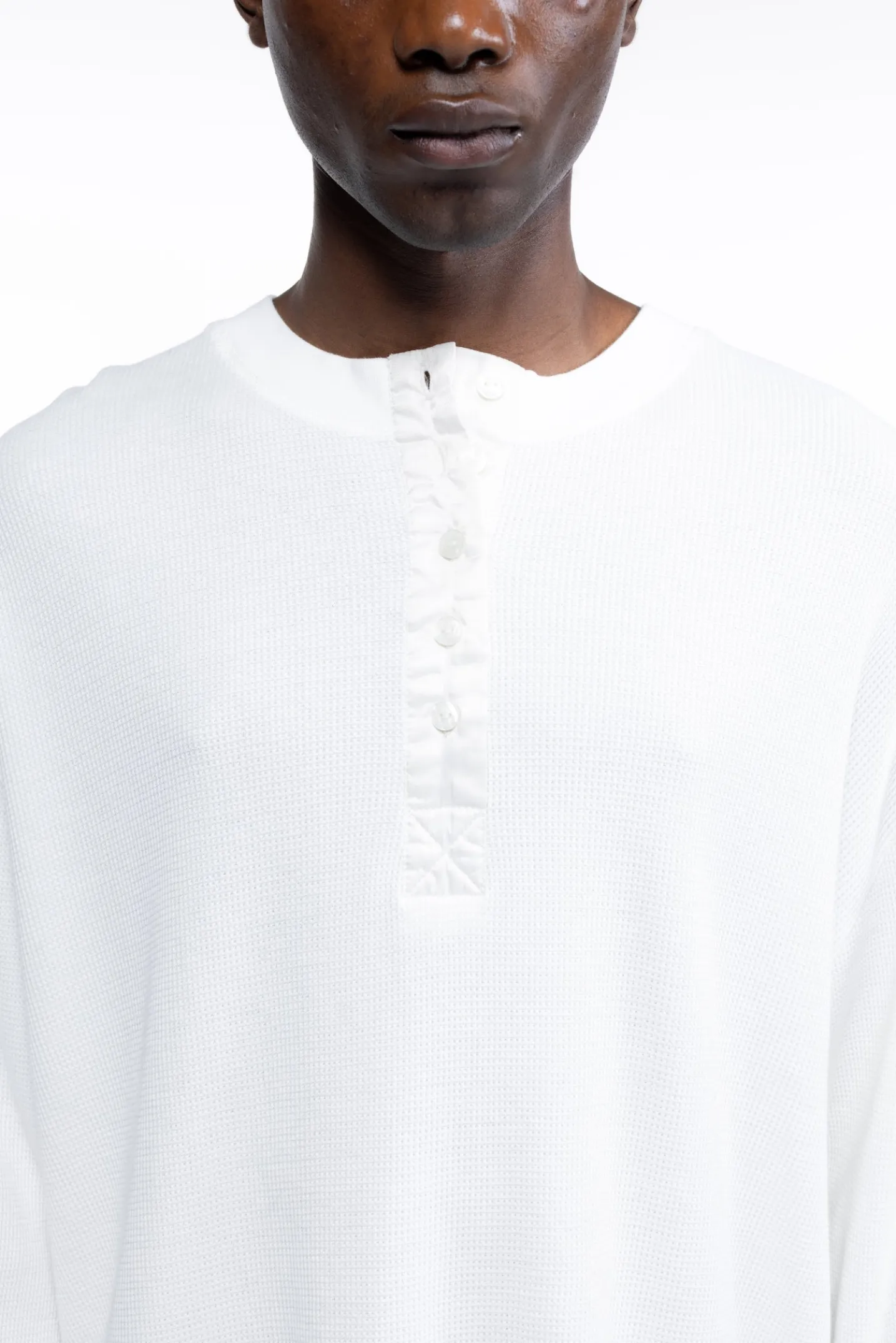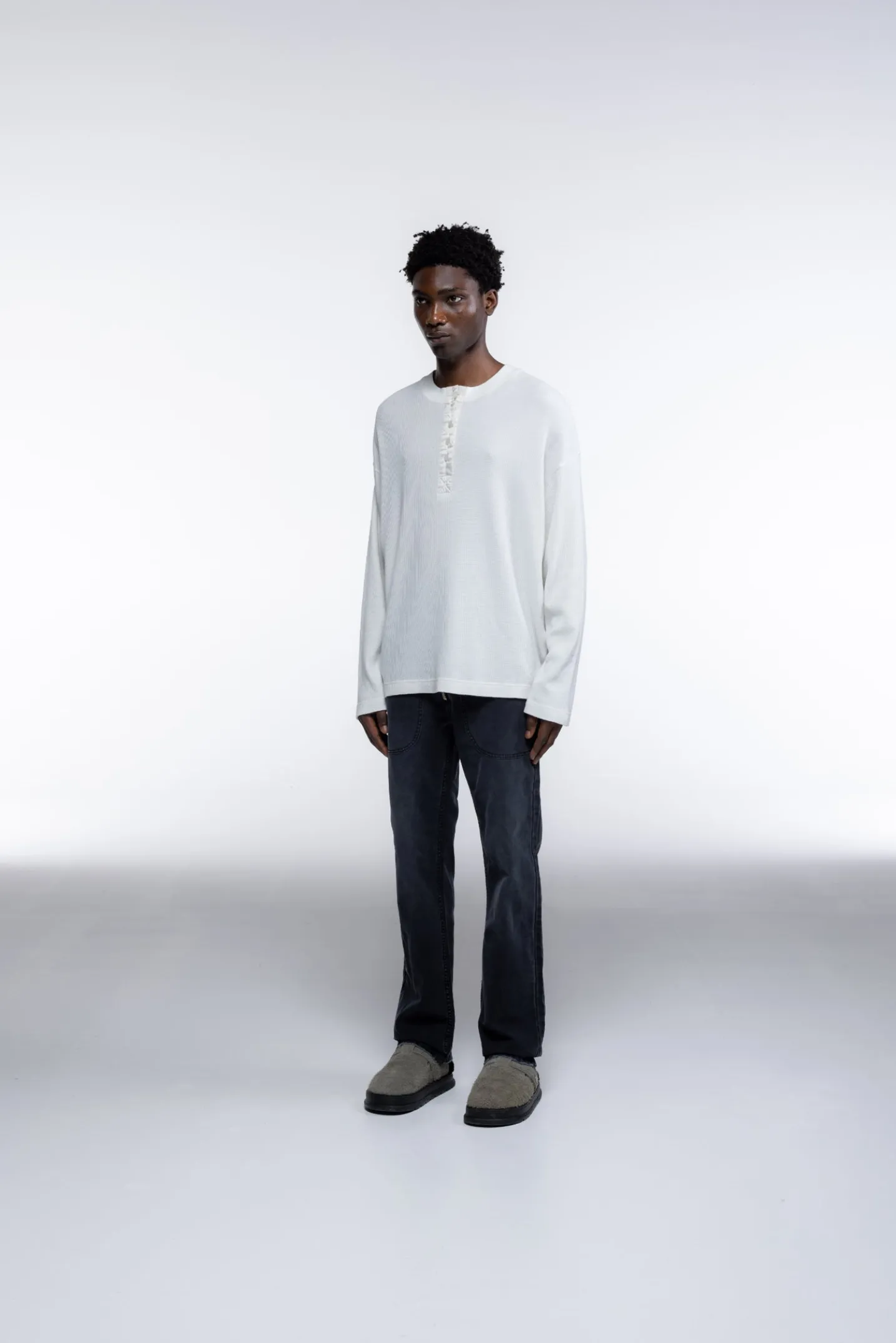 This Henley waffle has been inspired by vintage Americana but with a luxury update. The body is cut from a 100% cotton knit waffle in a boxy silhouette with dropped shoulders and elongated sleeves. The standout feature on this is the neckline which features a soft washed cupro placket and 5 CB branded buttons.