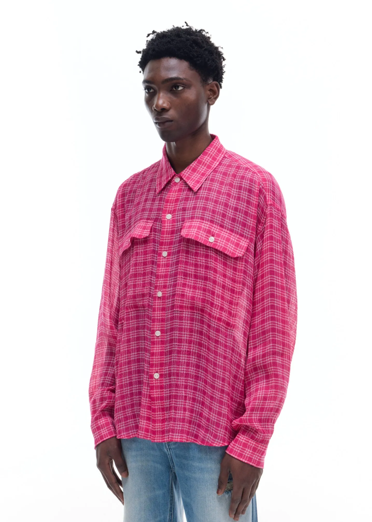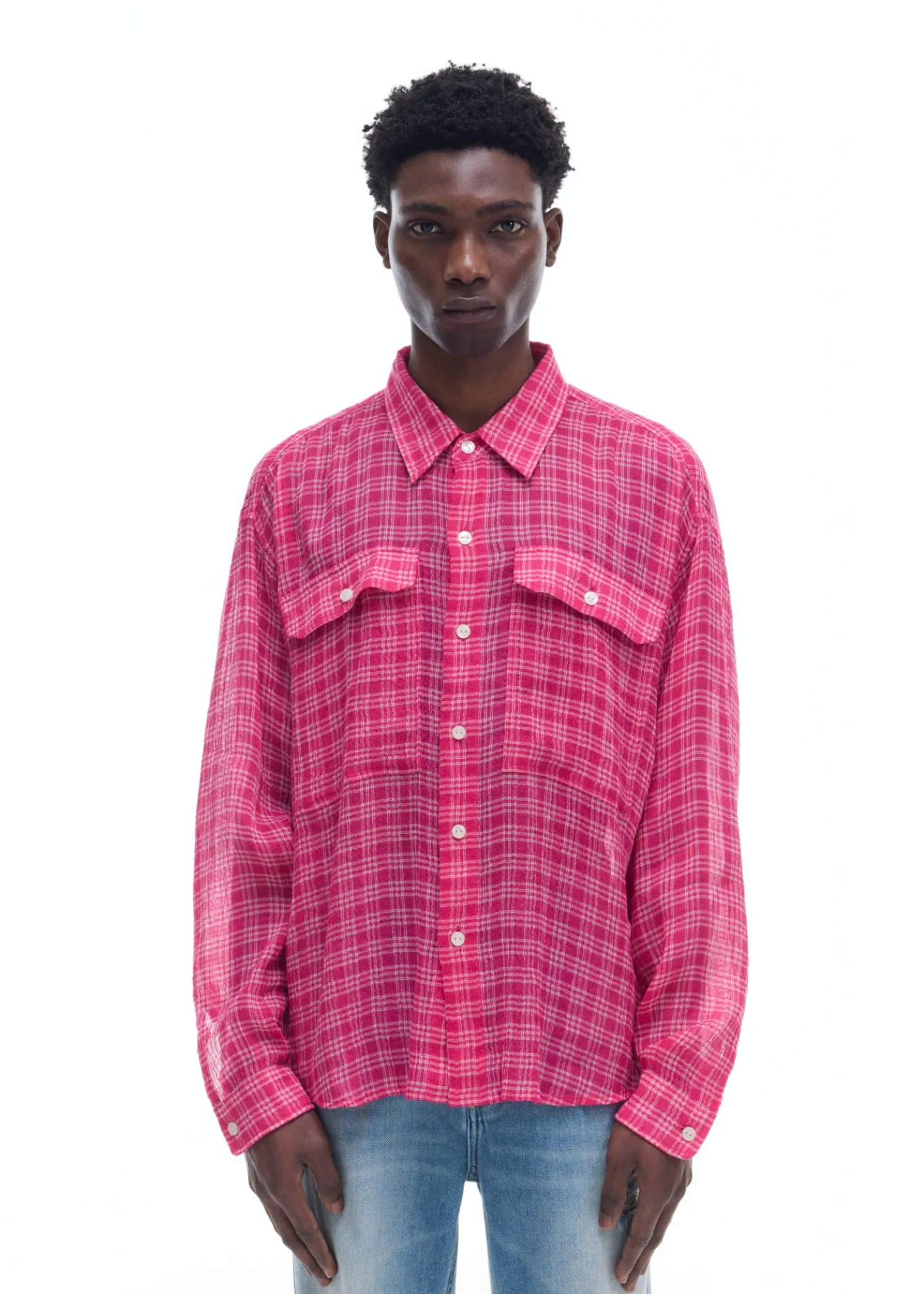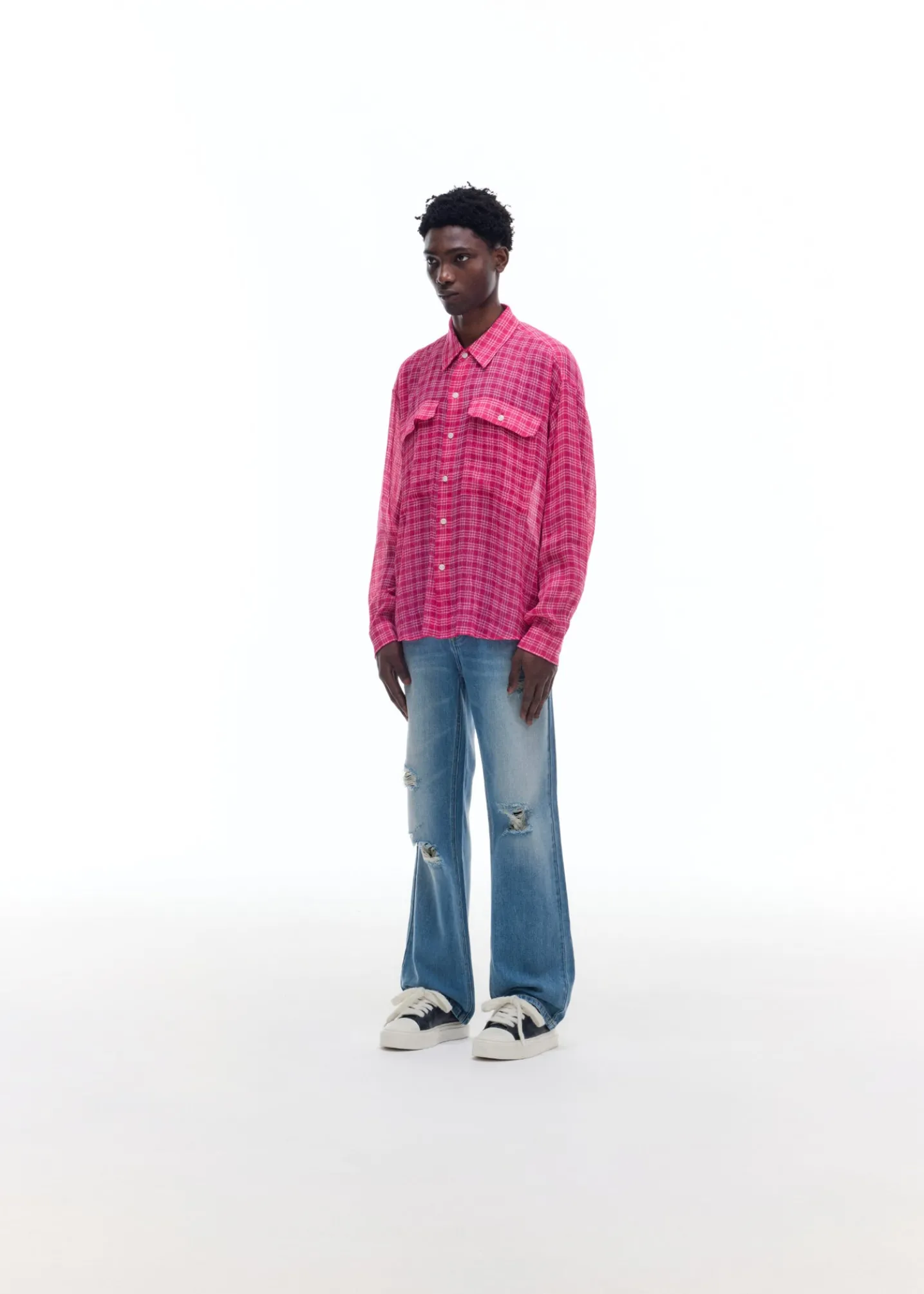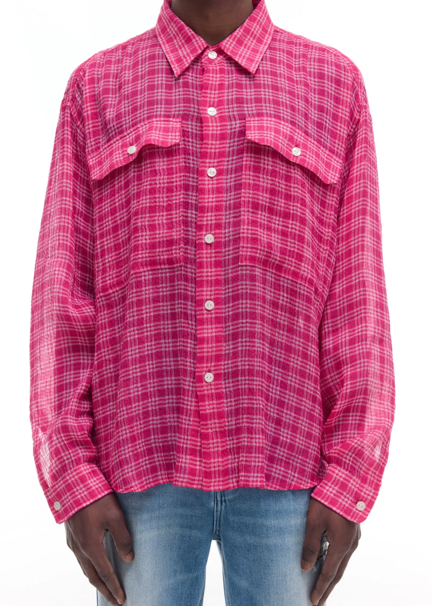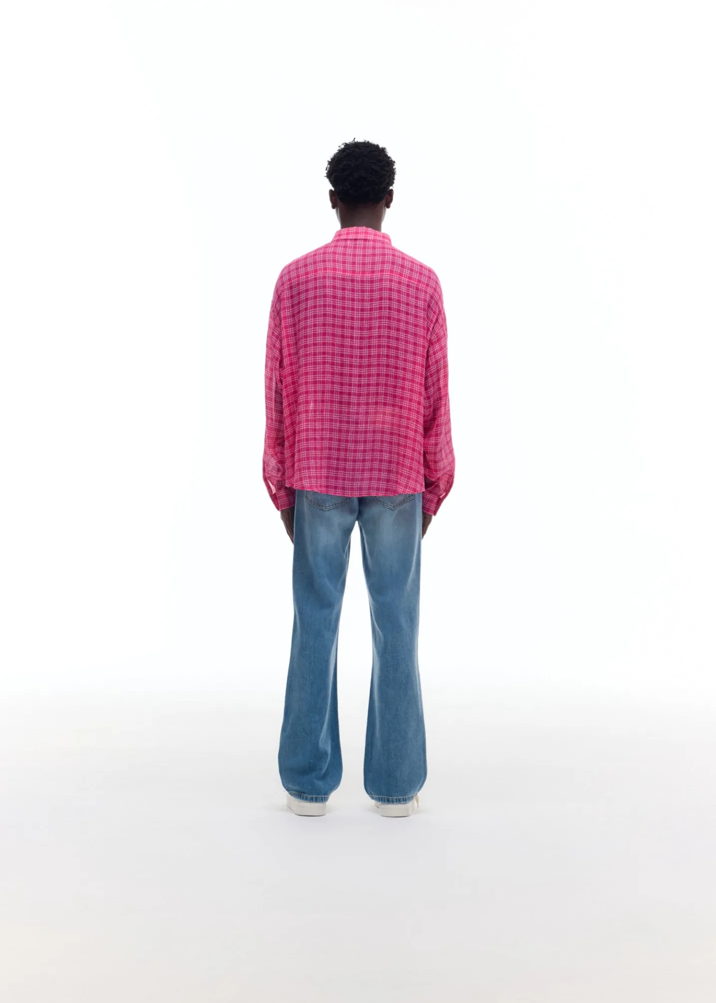 Brand new for SS25 is our kacy shirt. With design cues taken from classic Ivy League campus attire we’ve cut this shirt from a textured linen check in a cropped and wide silhouette with dropped shoulders, a distressed scalloped hemline and finished with 2 button down signature chest pockets.