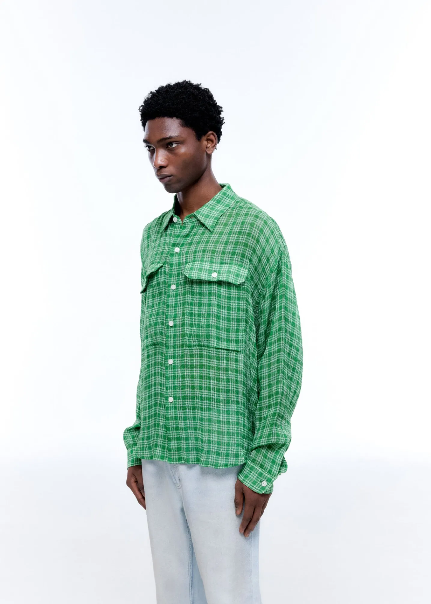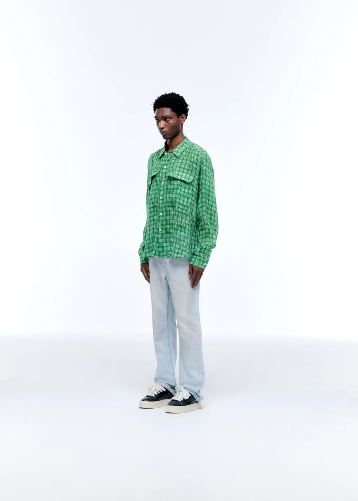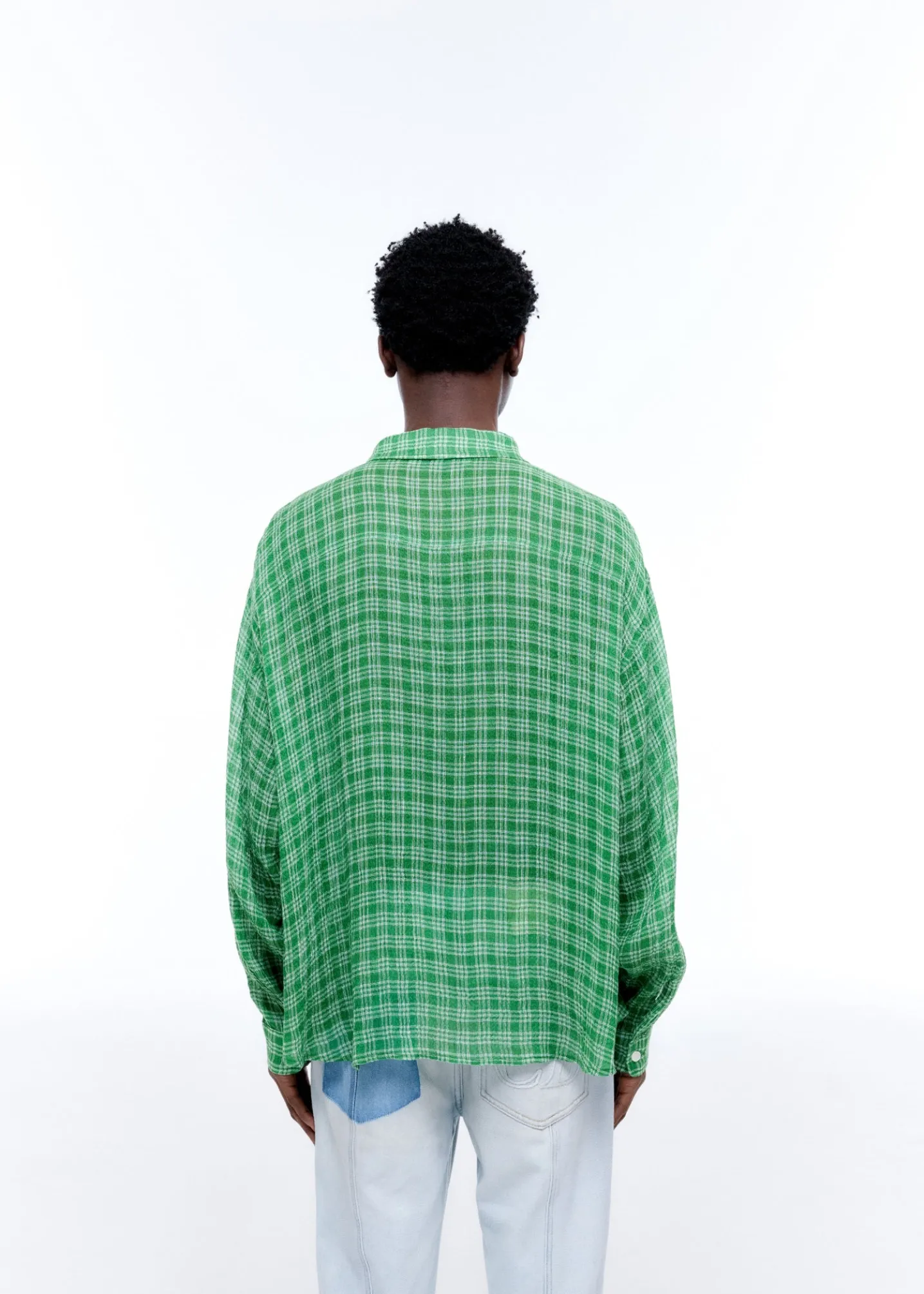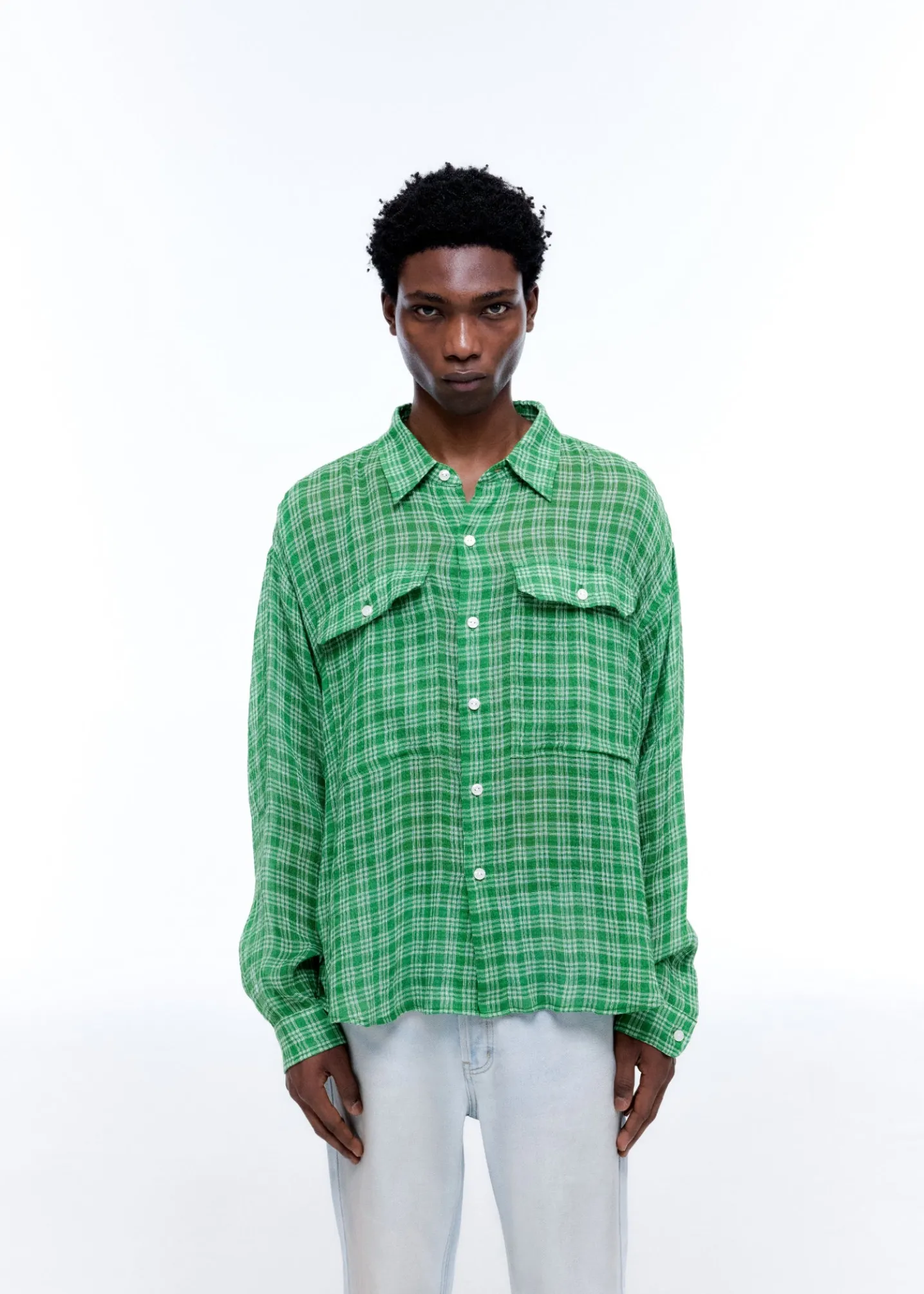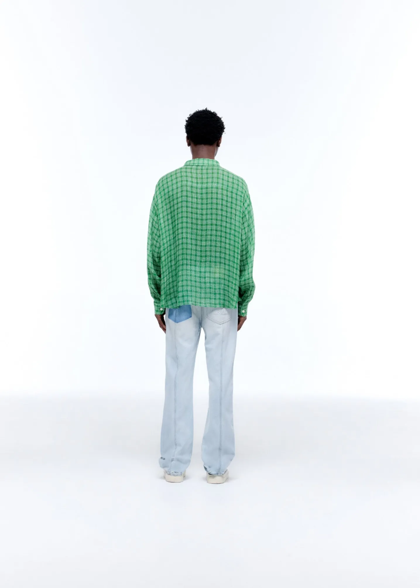 Brand new for SS25 is our kacy shirt. With design cues taken from classic Ivy League campus attire we’ve cut this shirt from a textured linen check in a cropped and wide silhouette with dropped shoulders, a distressed scalloped hemline and finished with 2 button down signature chest pockets.