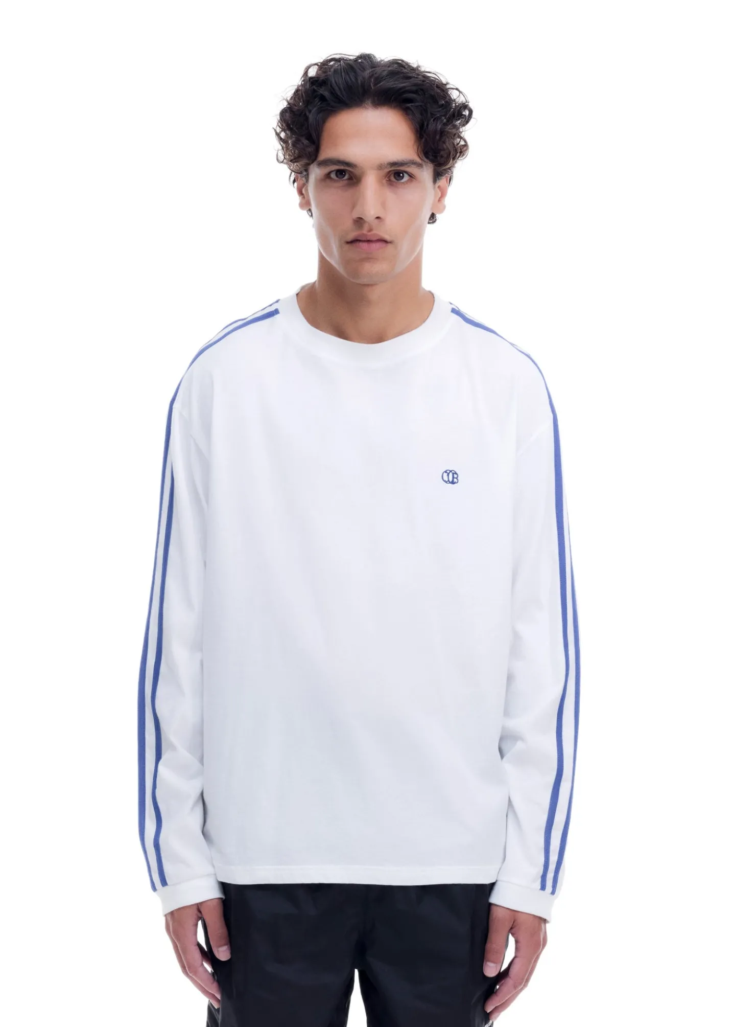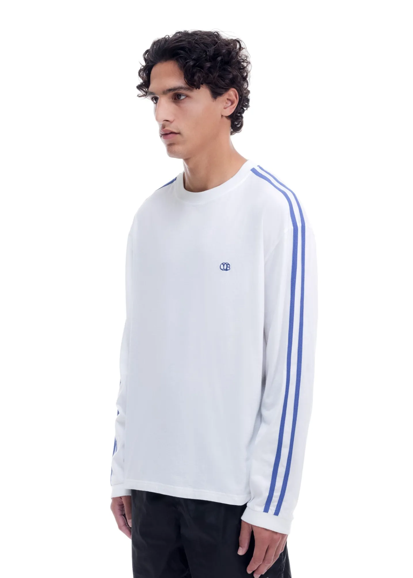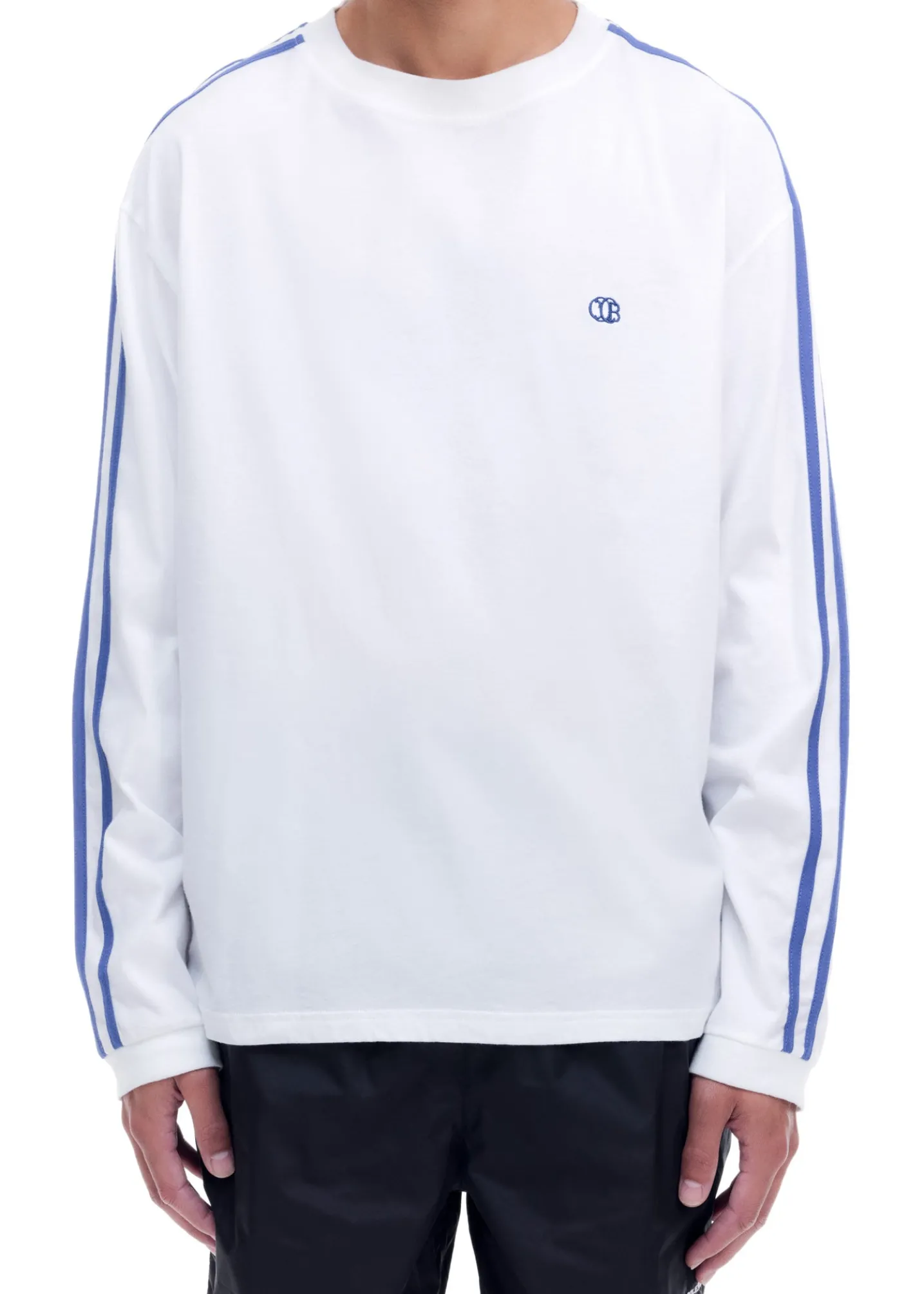 The mini emblem football long sleeve is cut from our 100% cotton lightweight single jersey with contrast blue flat stripes sewn down the outer arms. The silhouette is longer in the arms with relaxed ribbed cuffs and neckline. featuring our CB resort emblem delicately embroidered on the left chest.