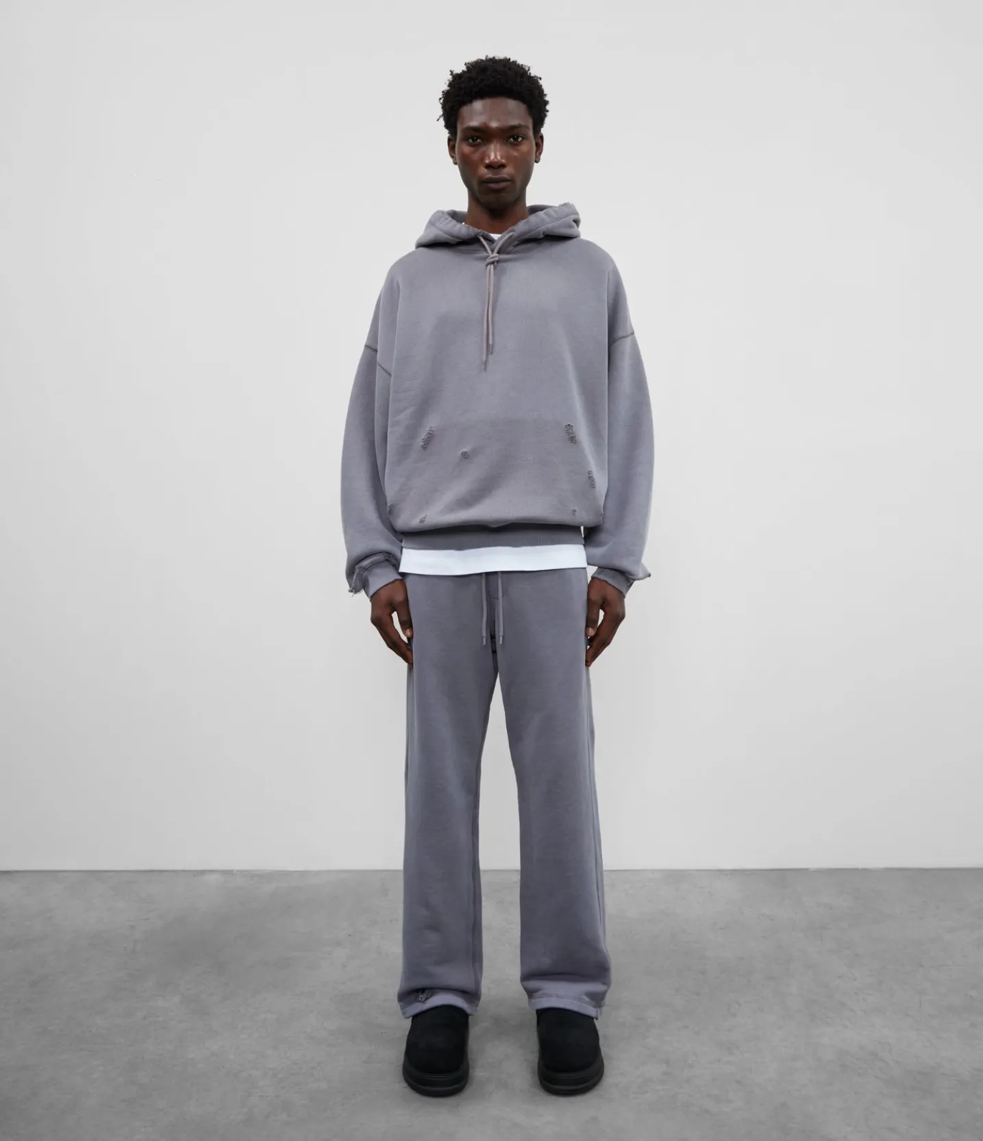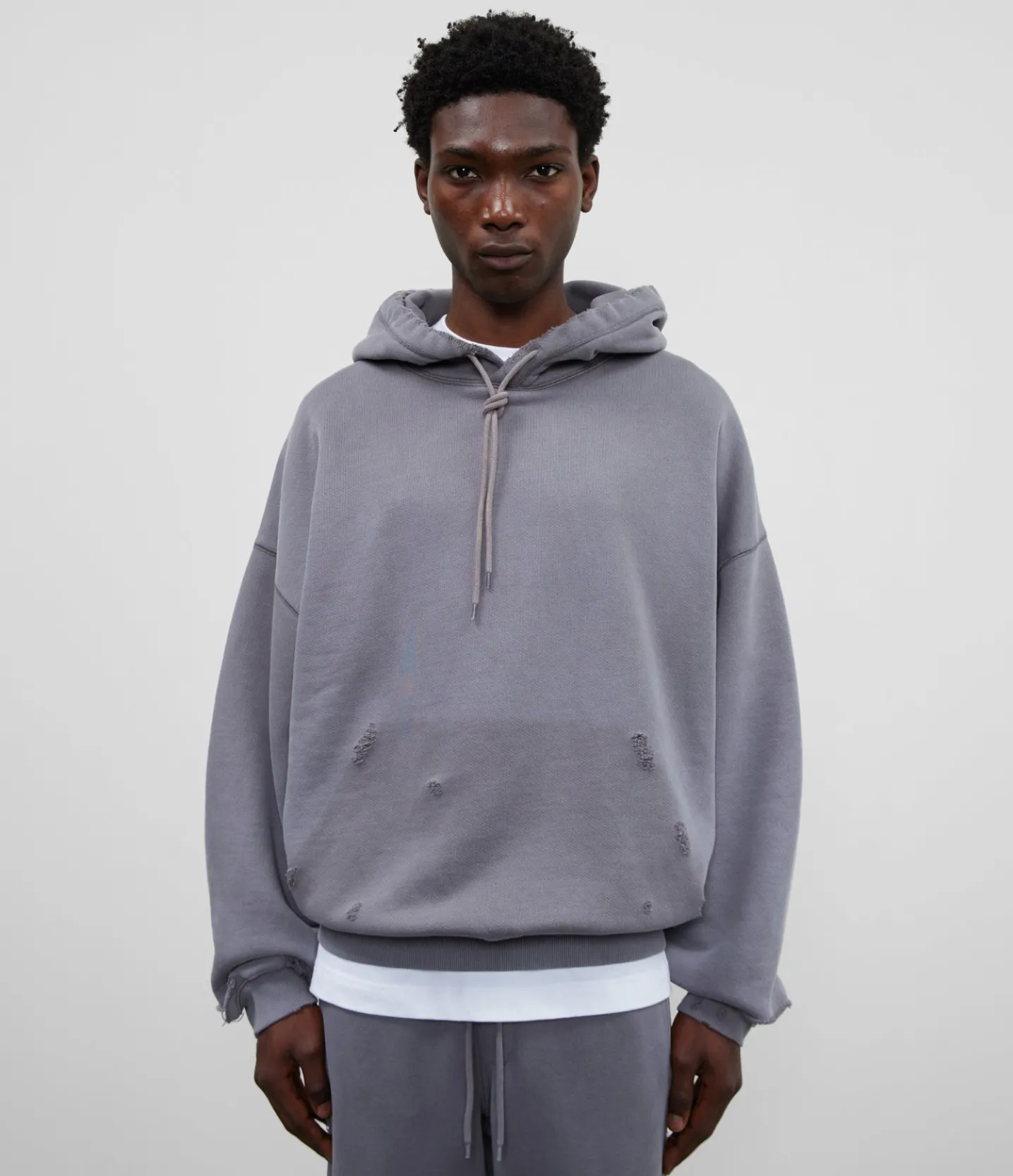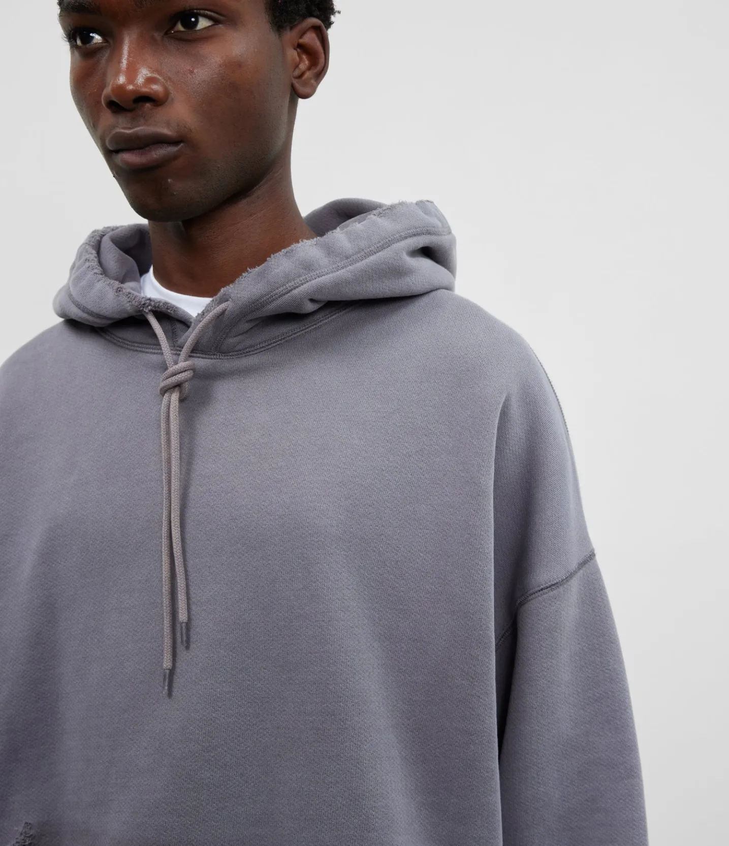 The pocket fade hoodie, a brand new hoodie for SS24. We’ve developed a brand new 500gsm half brushed American fleece for this that’s heavy in weight yet has a luxury drape. We have heavily washed this then removed the pocket to reveal itsdarkerunwashed silhouette. The distressing has been done by hand mimicking my dad’s original CB hoodie from 8 years ago.