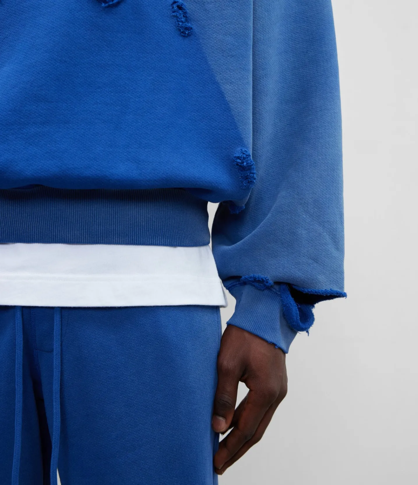 The pocket fade sweatpants, a brand new pant for SS24. We’ve developed a brand new 500gsm half brushed American fleece for this that’s heavy in weight yet has a luxury drape. We have heavily washed this then removed the back pocket to reveal itsdarkerunwashed silhouette.