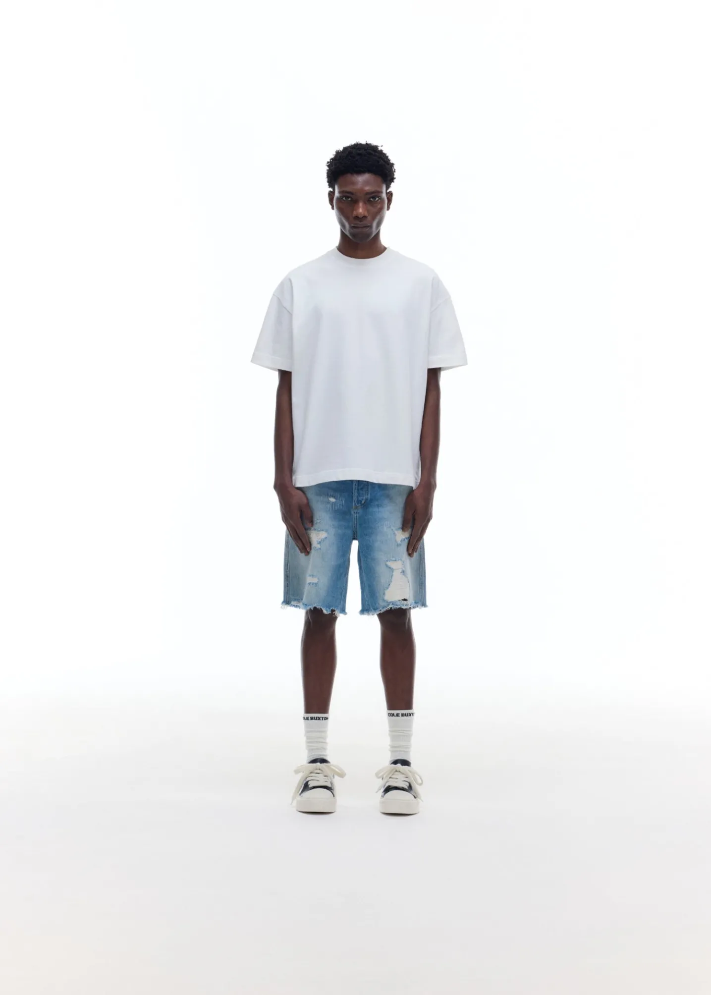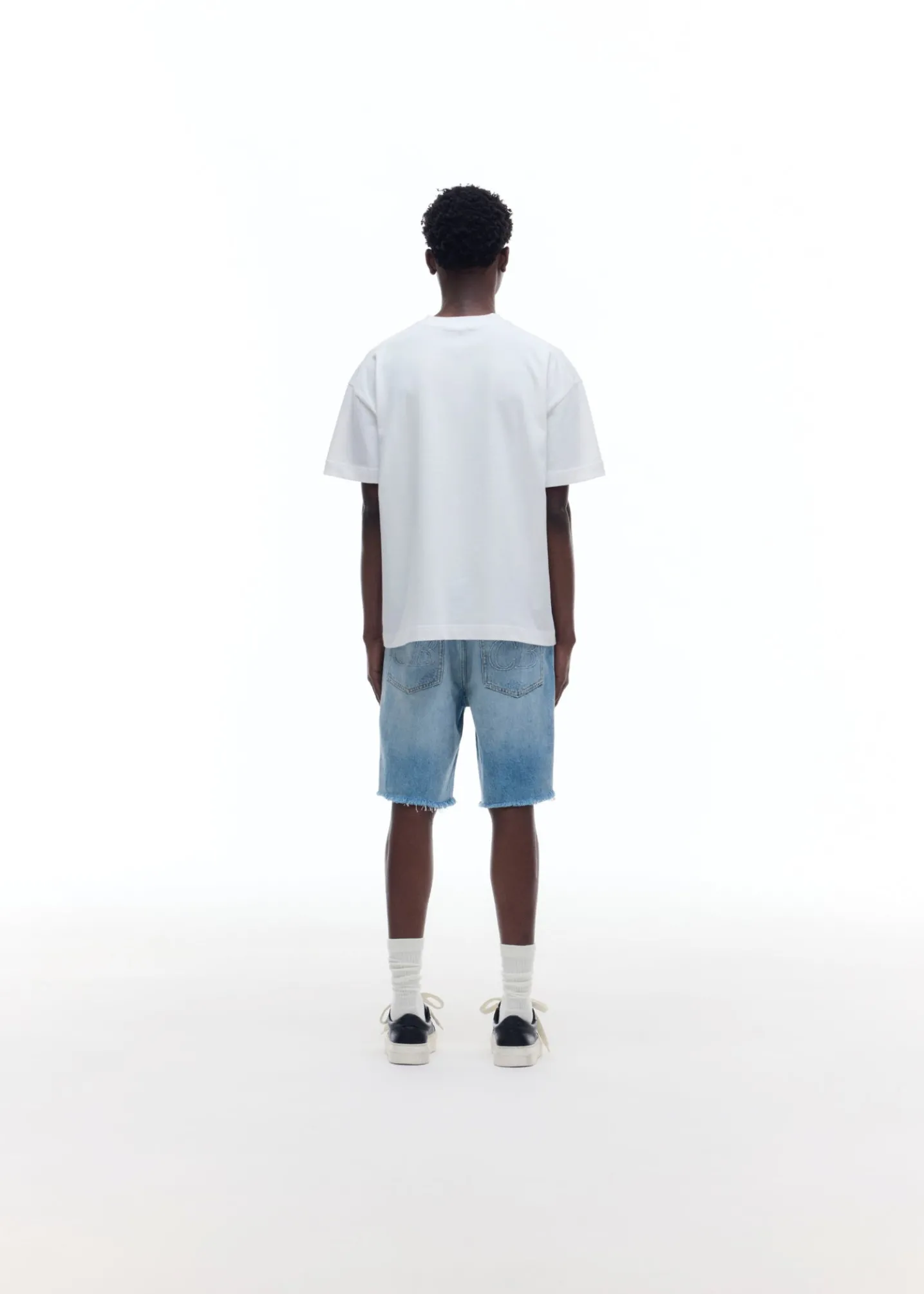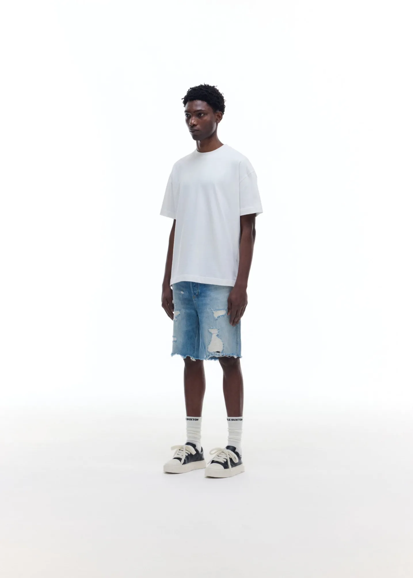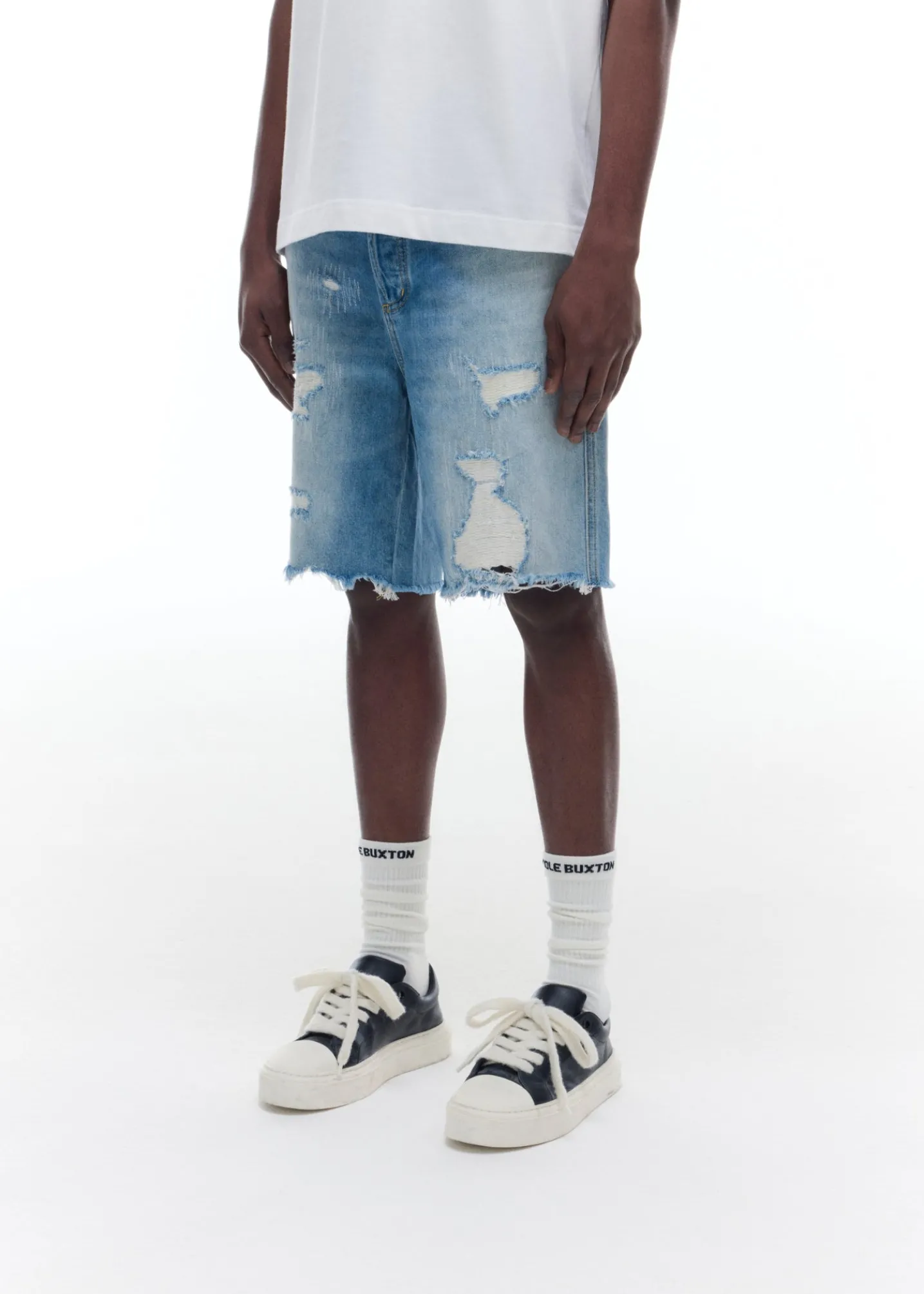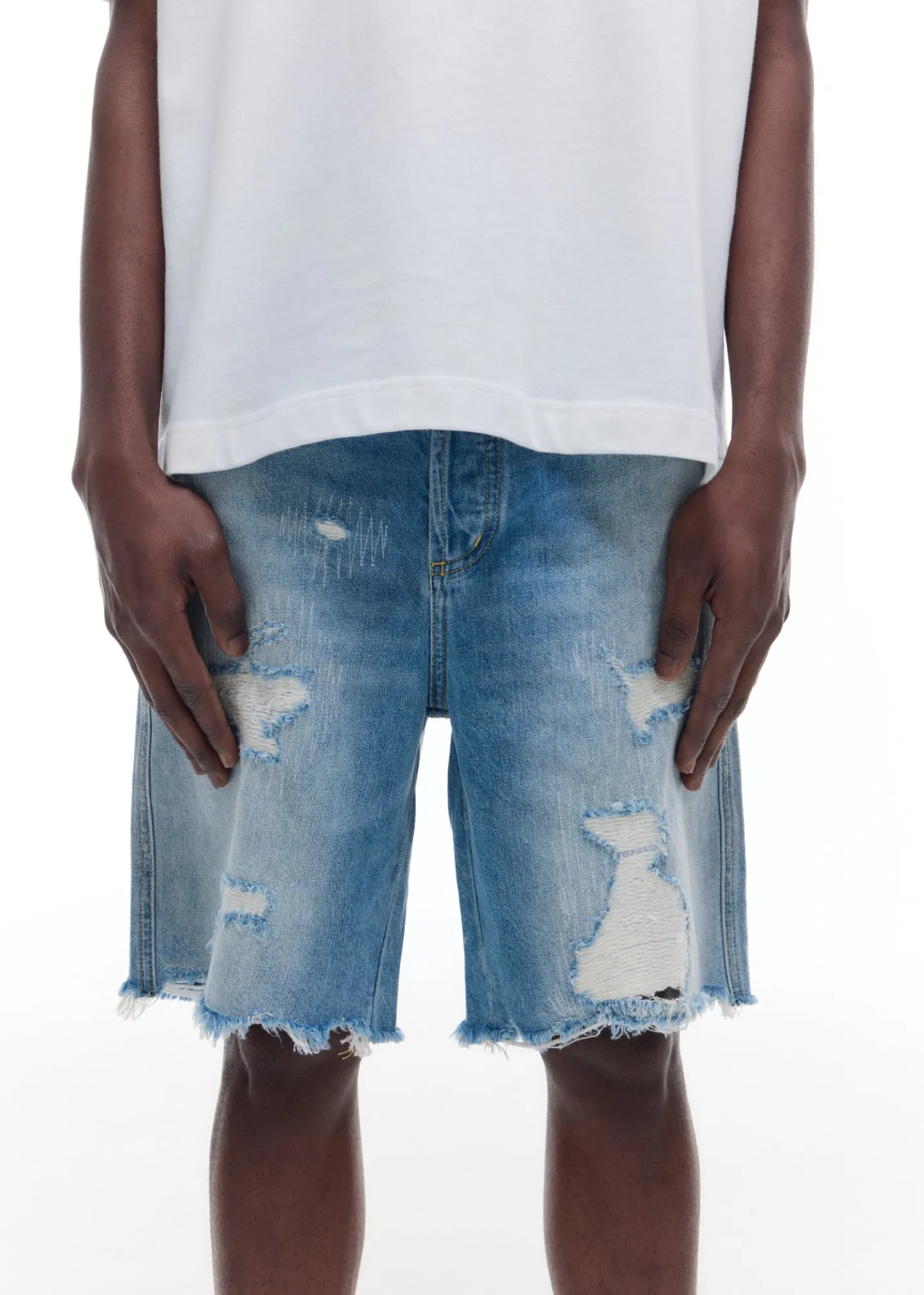 Brand new for SS25 are these distressed denim shorts. Cut from a mid weight washed denim in a straight legged boxy silhouette. These have been heavily distressed and repaired by hand for a true vintage Americana aesthetic.