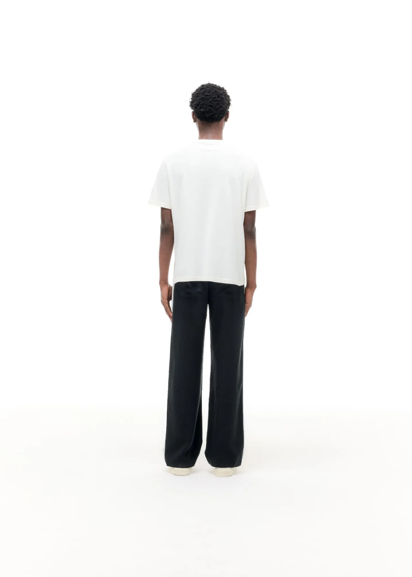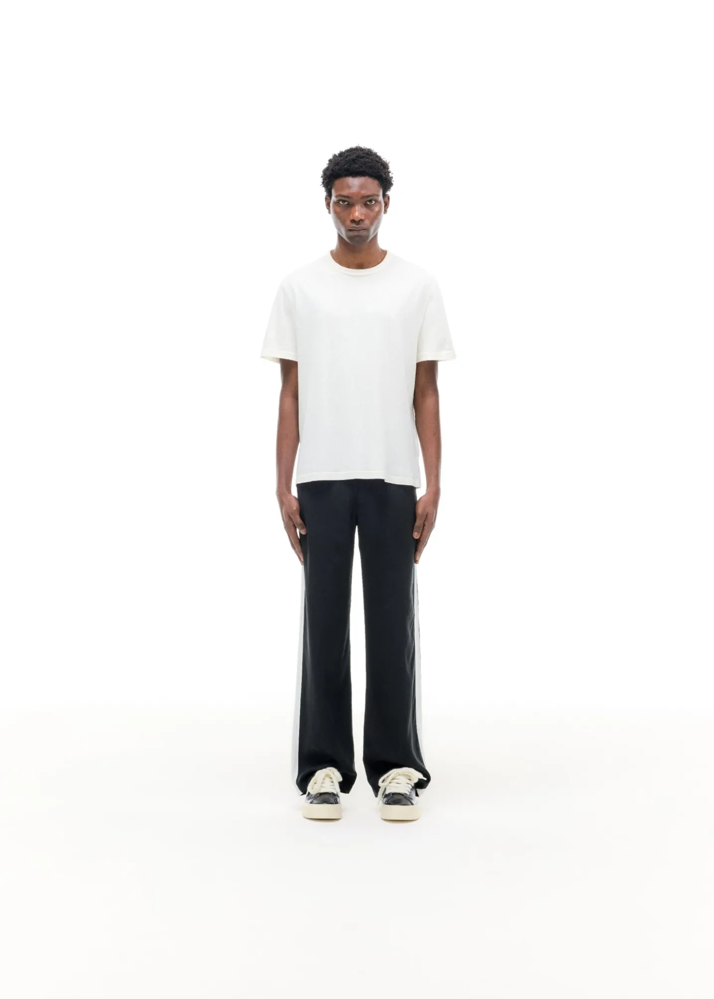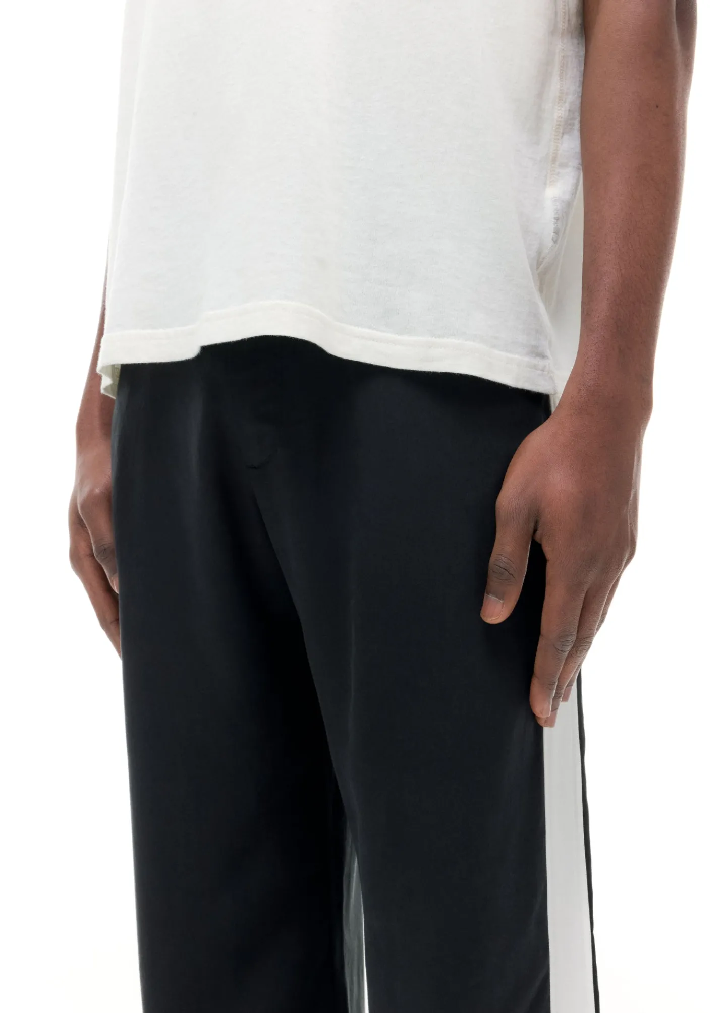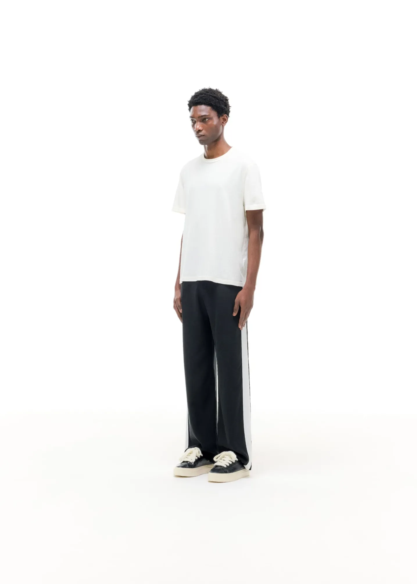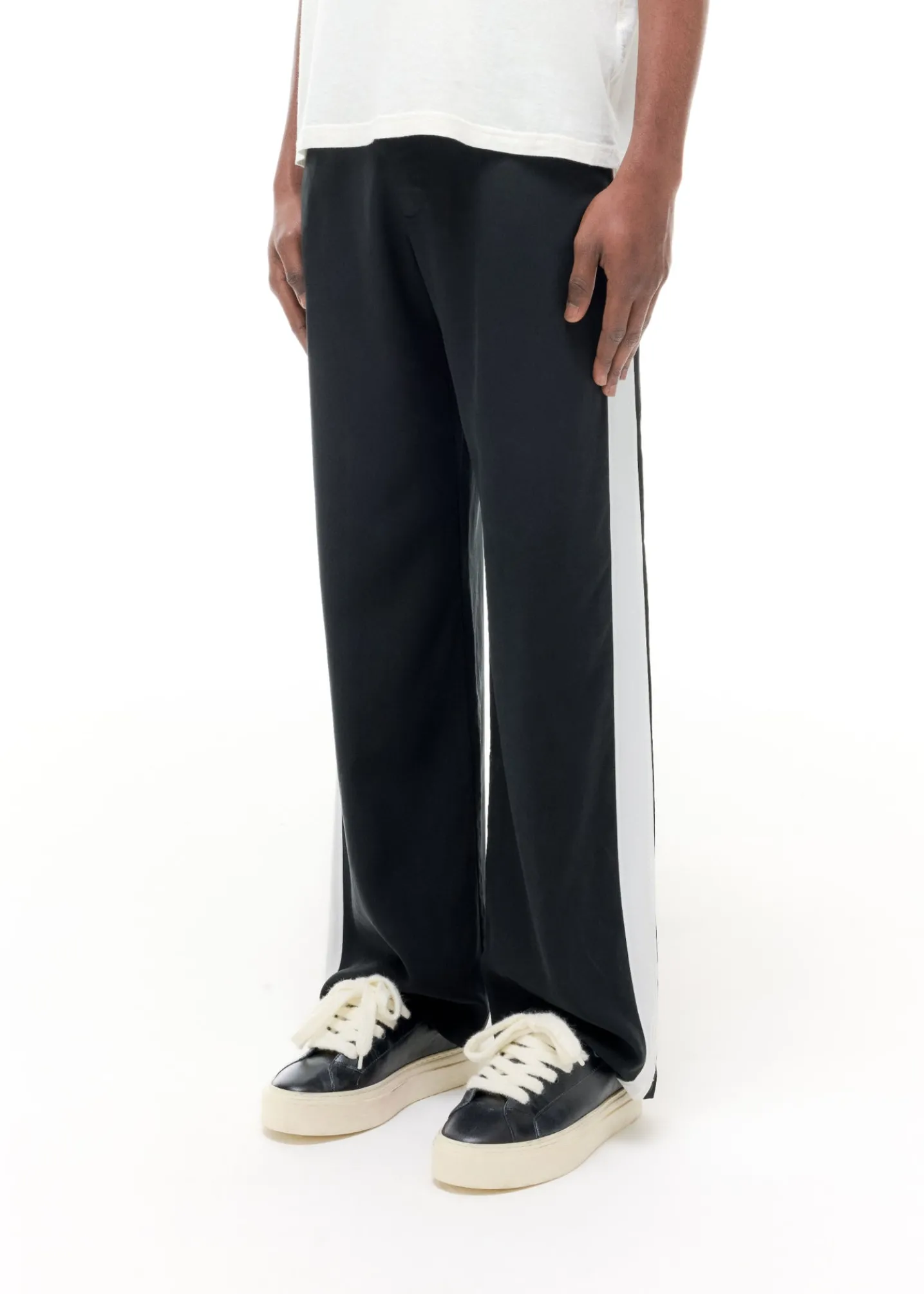 Cut from our drapey sand washed viscose /cupro in a baggy straight leg silhouette featuring a self fabric side panel on the outer leg in an off white . These tailored pants pair perfectly with Wilson’s and CB mules alike.