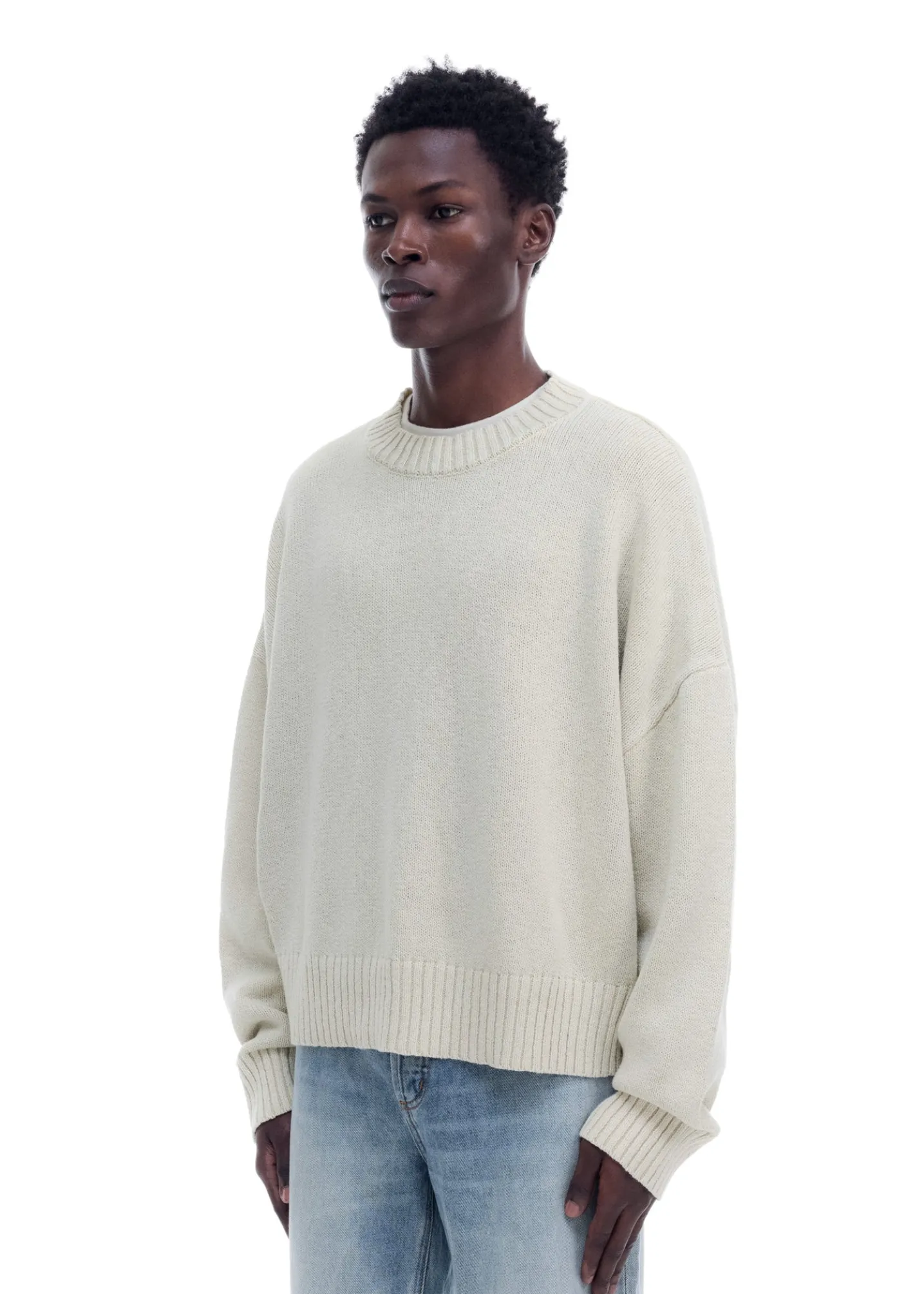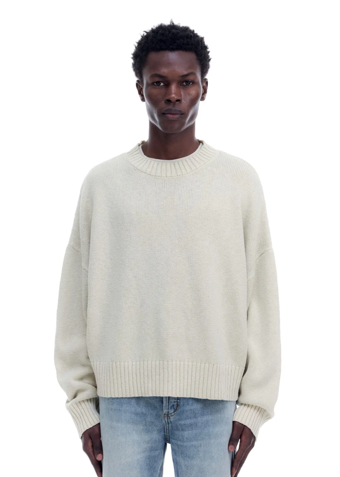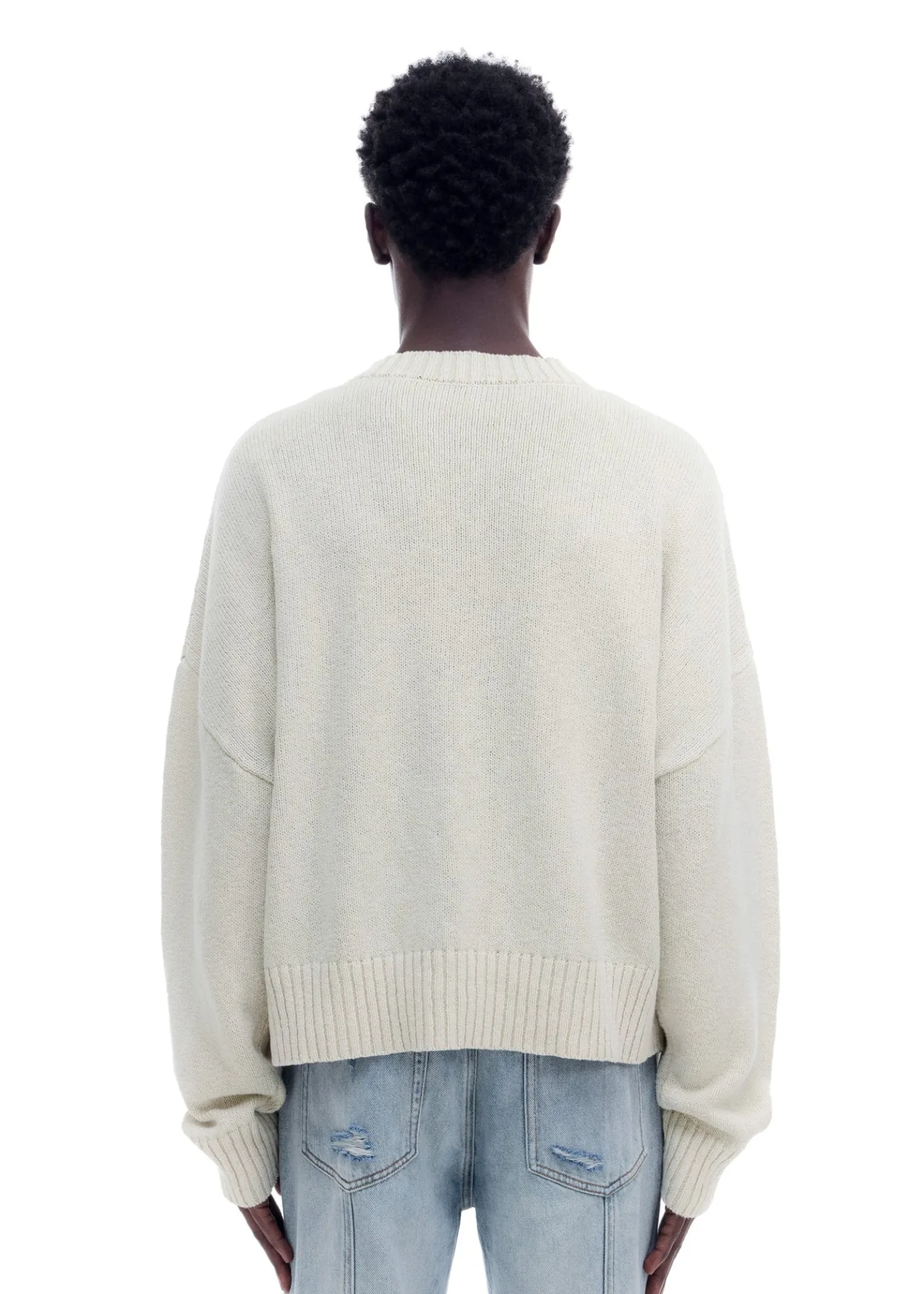 Our skipper sweater has been knitted in a super soft 100% cotton with a slight cream and white marl. Thesilhouette is boxy with dropped shoulders and a cropped body length with a ribbed hemline that hangs loosely making it perfect for summer layering.