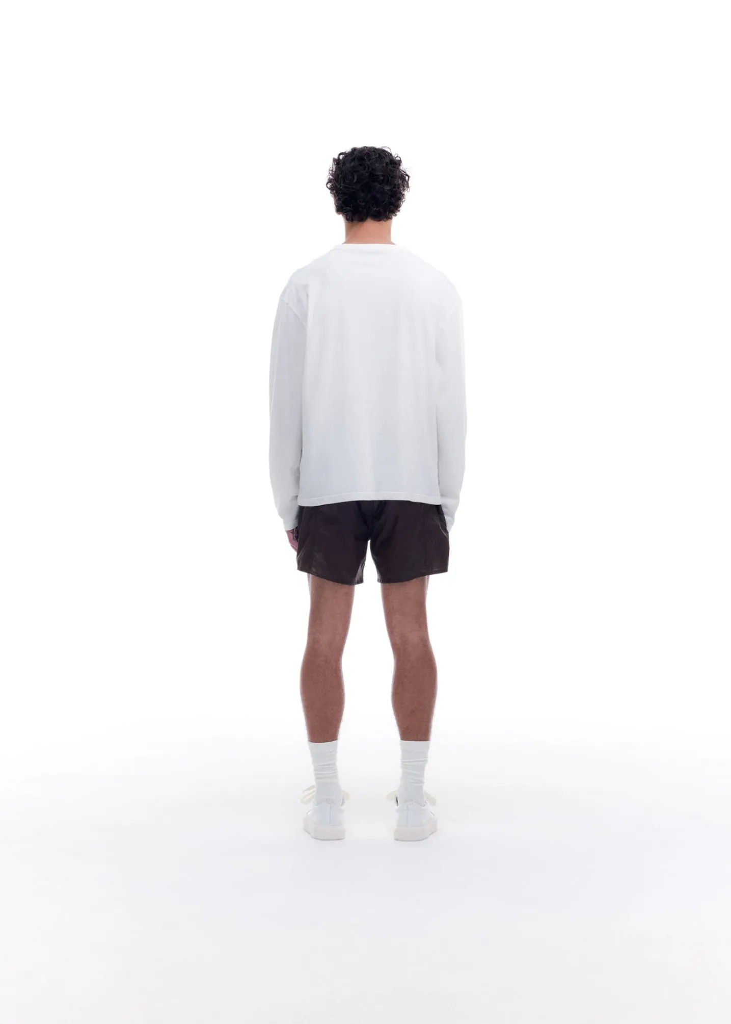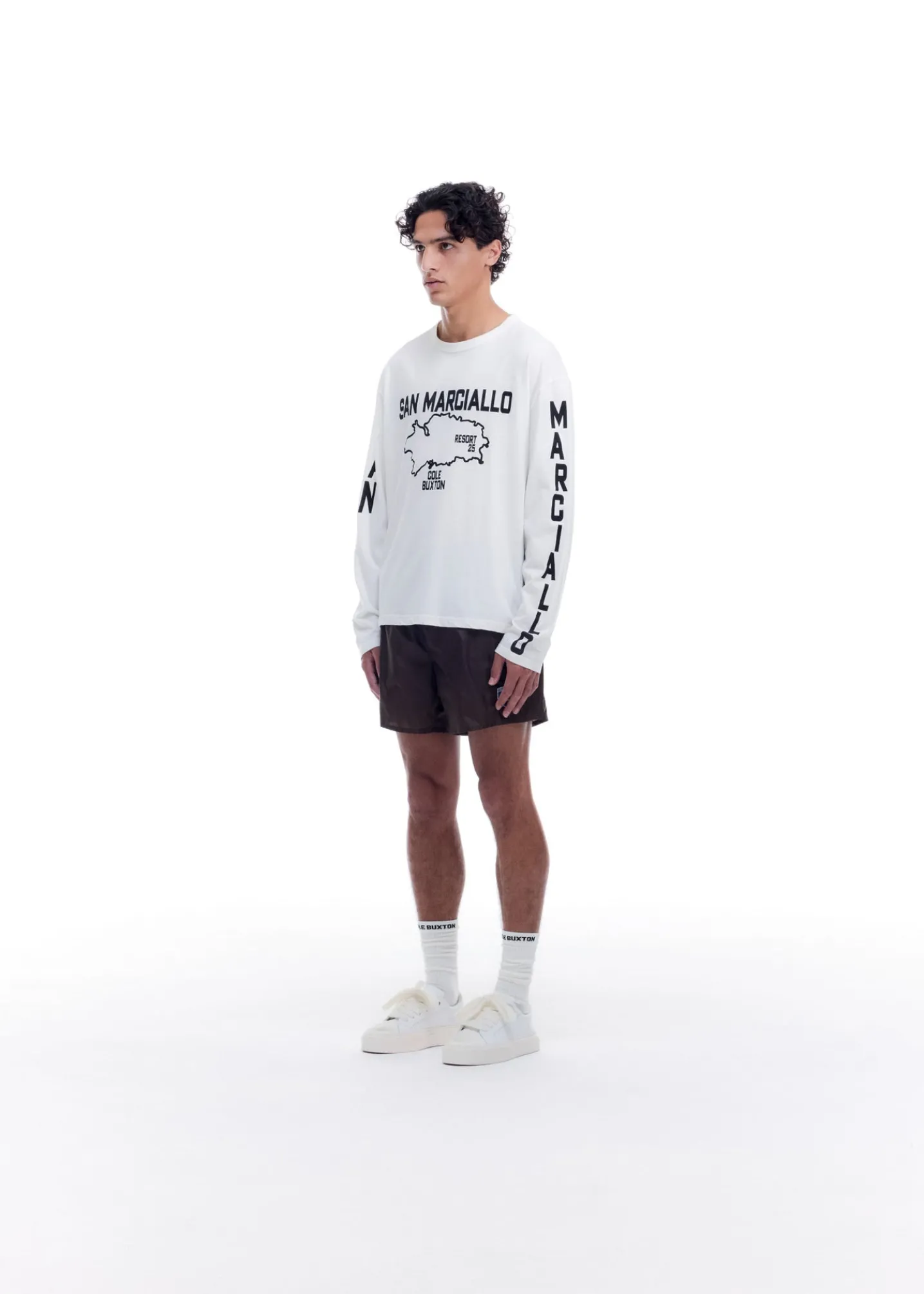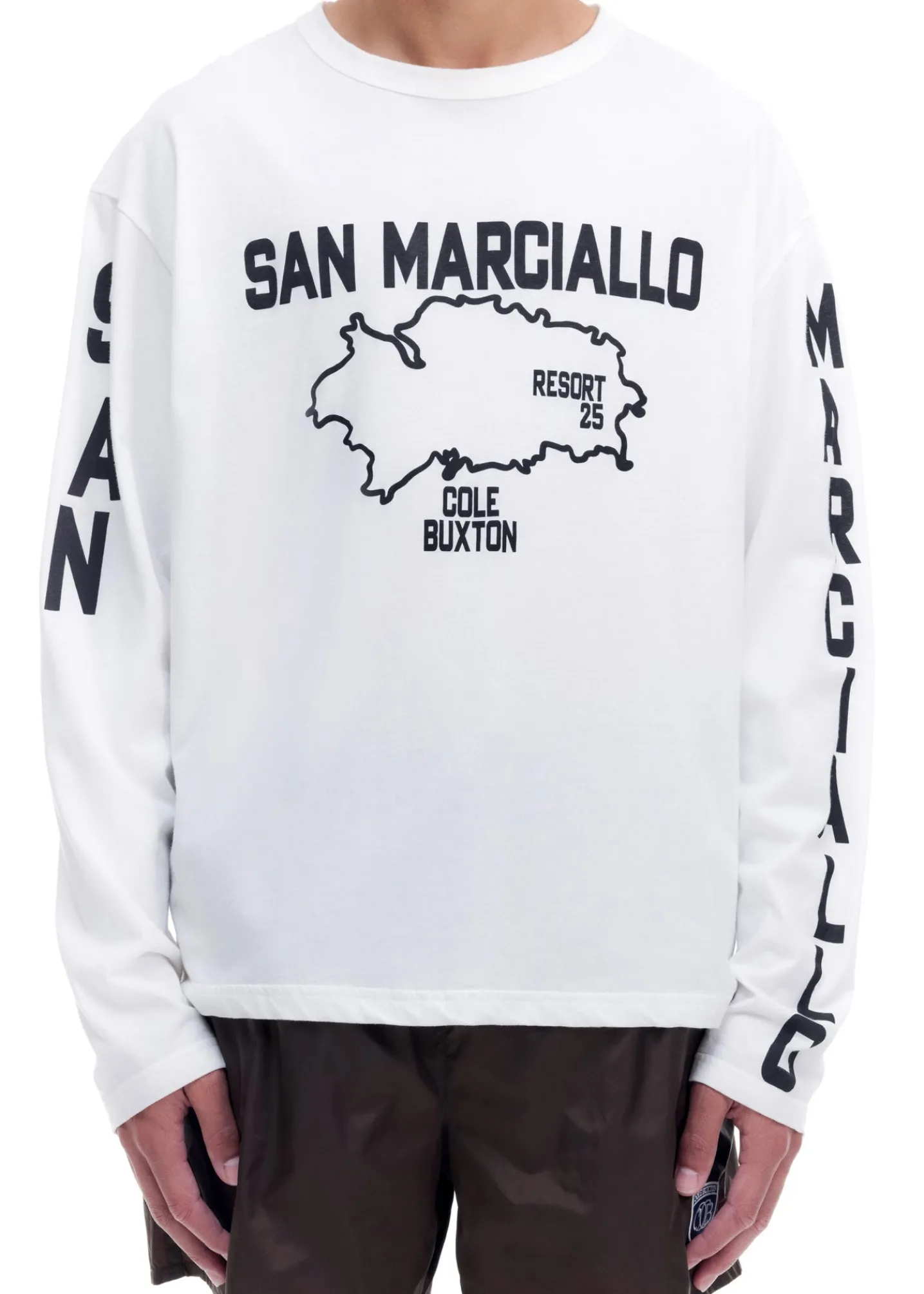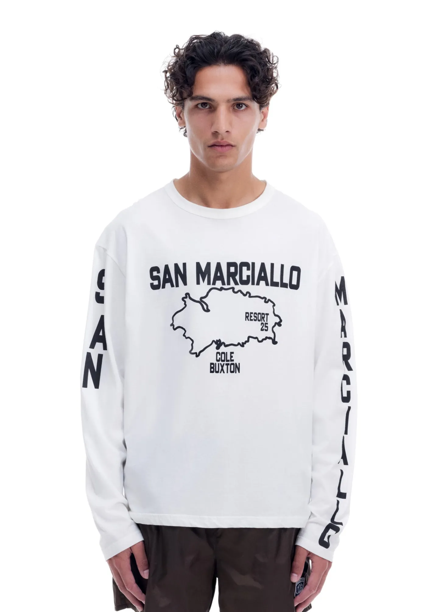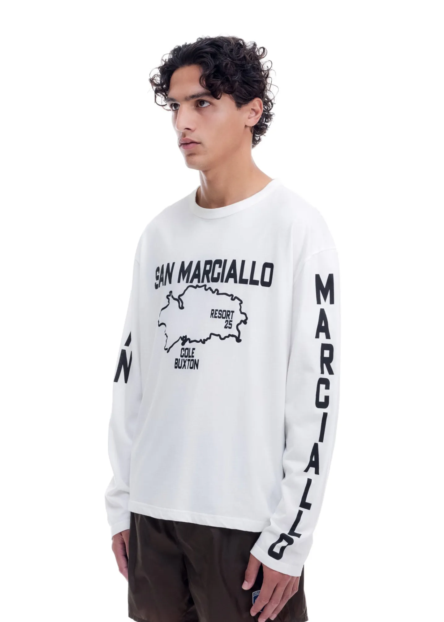The SM island long sleeve. Cut in our refined ss25 shape with dropped shoulders from our luxury 100% cotton single jersey. Featuring our signature cover stitched self fabric neckline and our racing inspired San Marciallo graphic across the chest and sleeves.