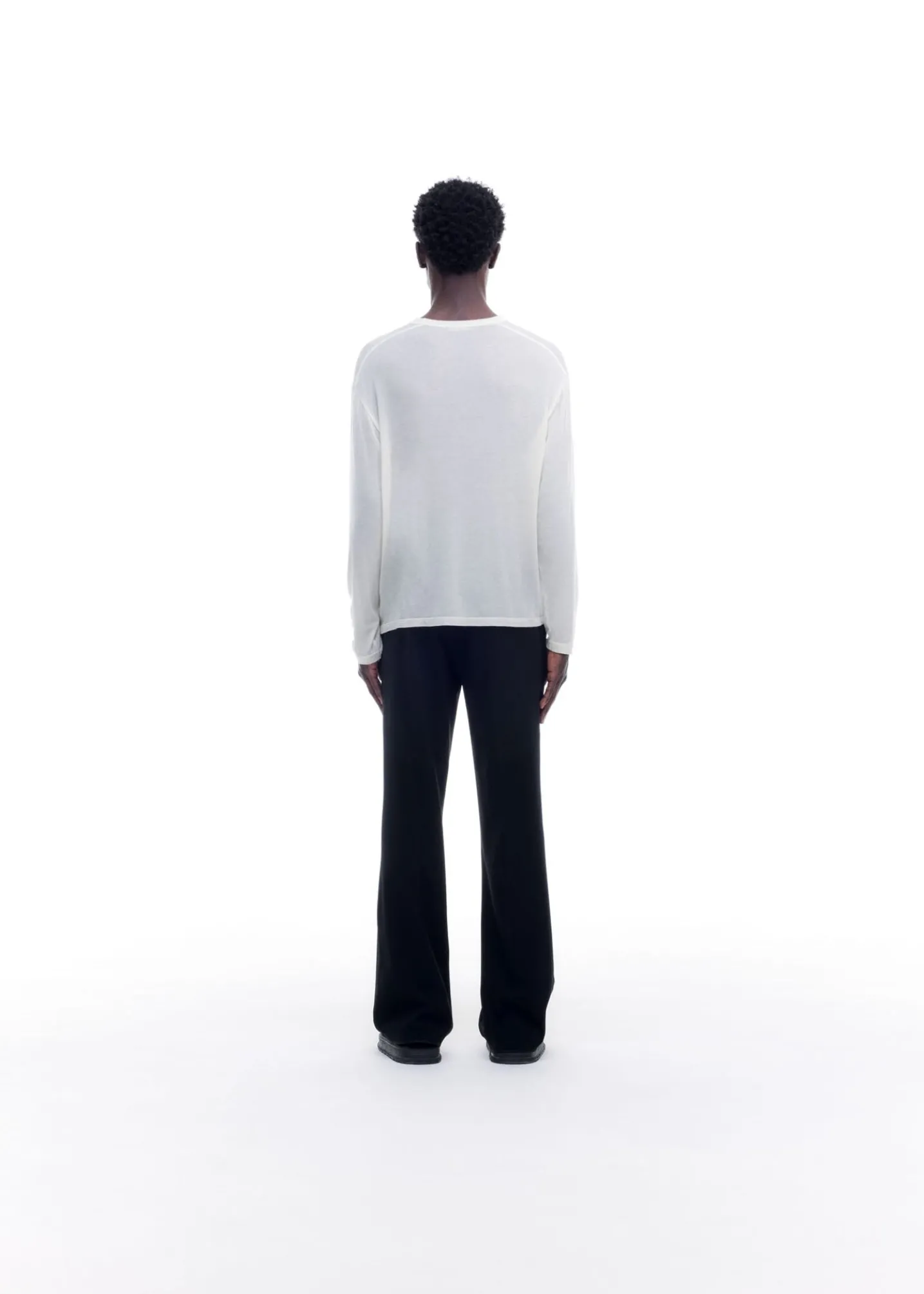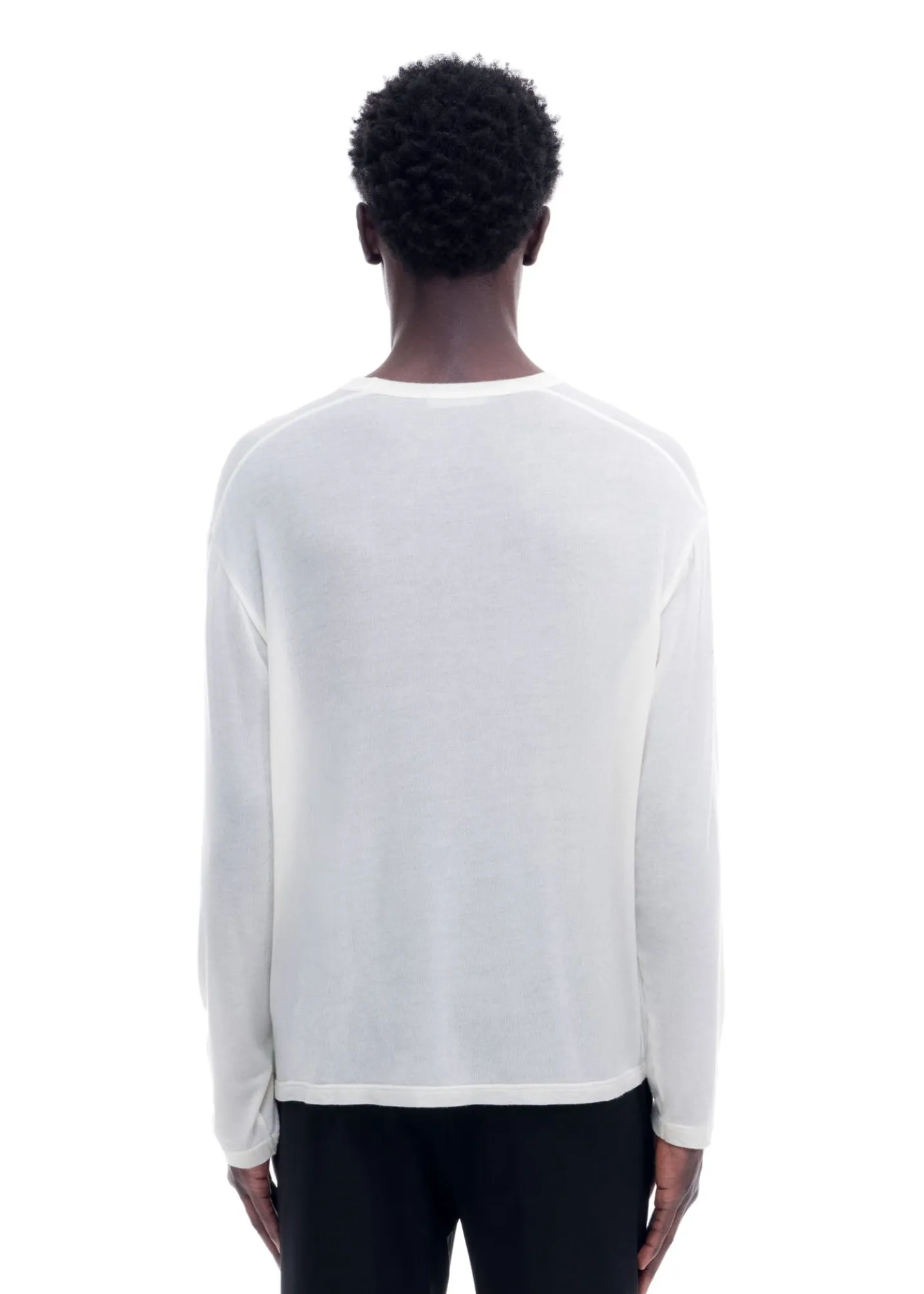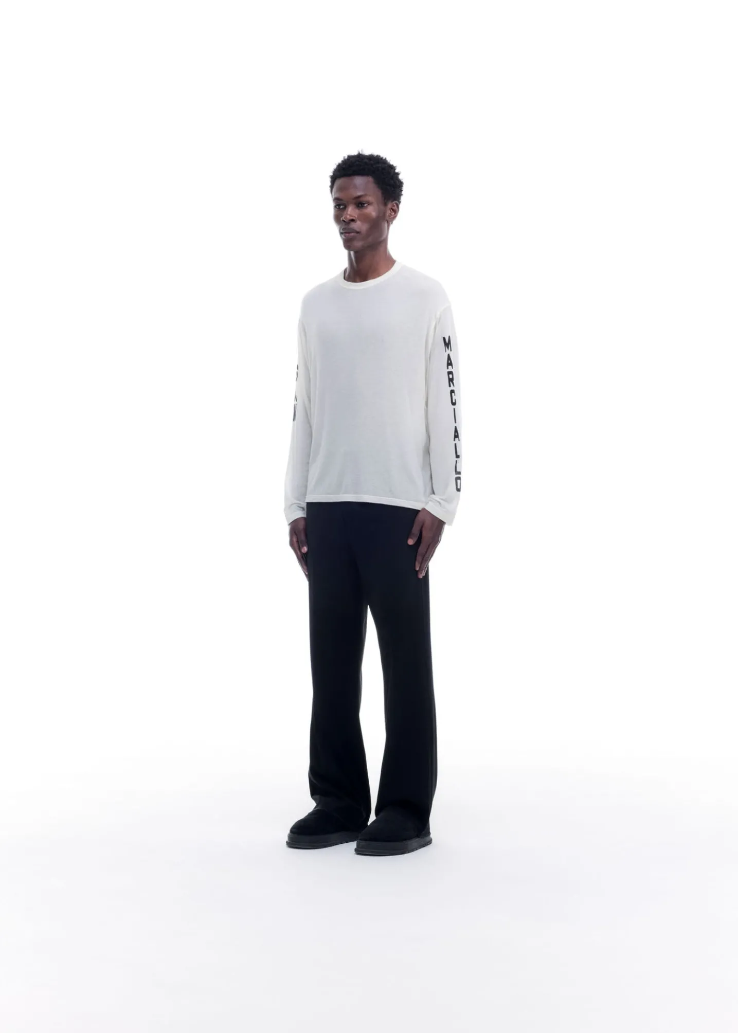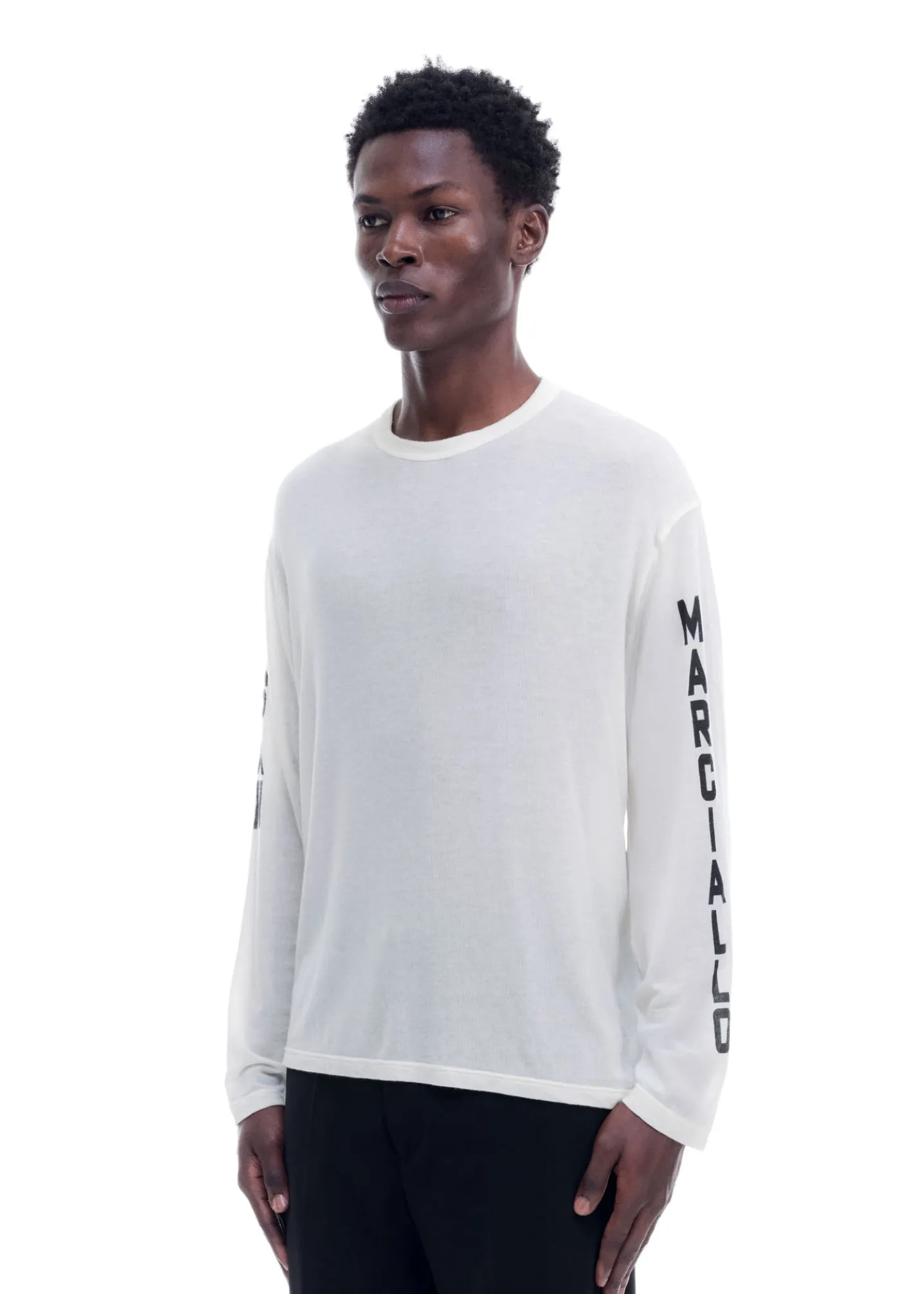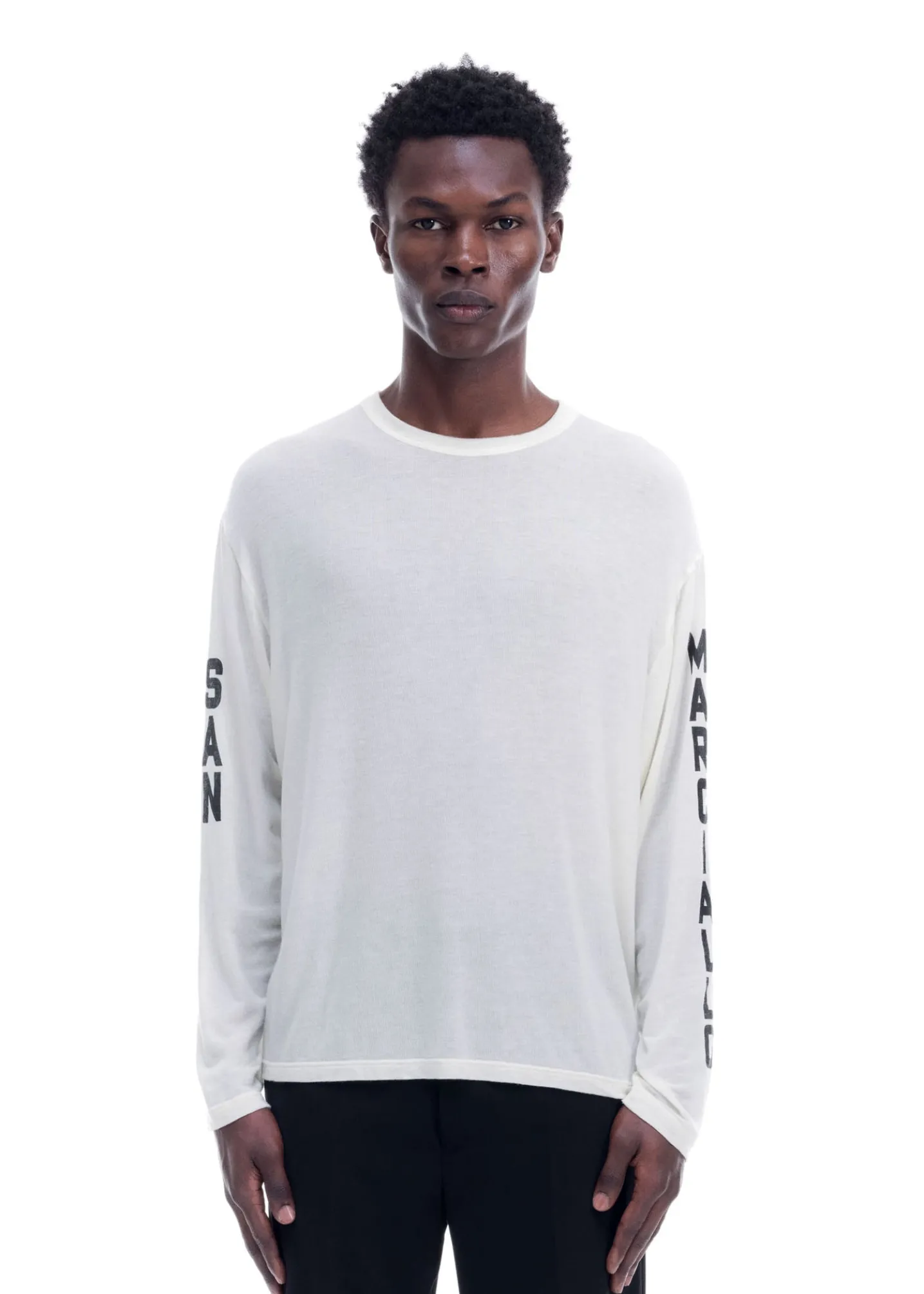 This sheer long sleeve is cut from a luxury blend of Tencel, cashmere and silk in a cropped slouchy long sleeved silhouette. Featuring our SM screen printed type down both sleeves.