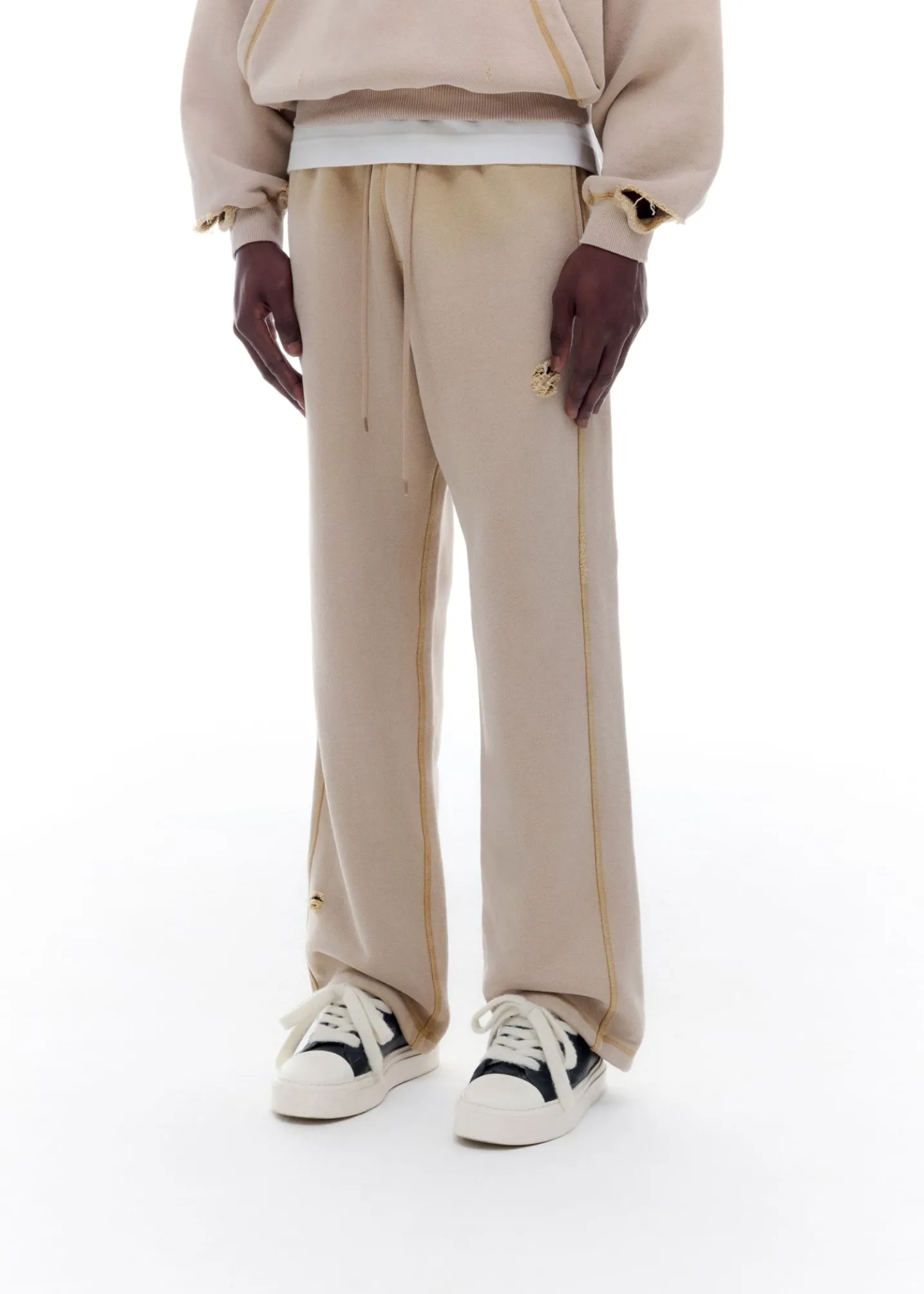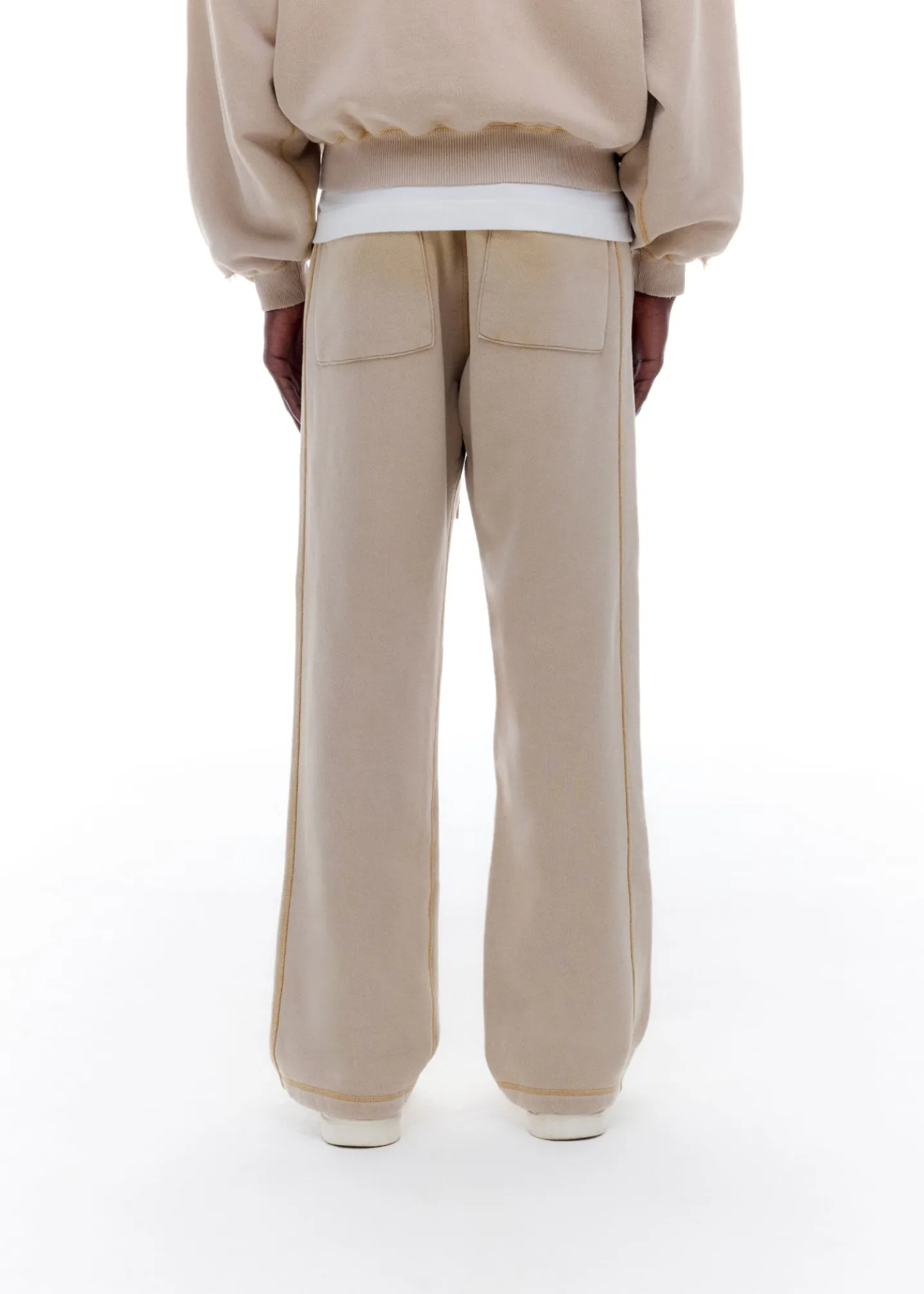 The sun fade lounge pants, a brand new pant for SS25. We’ve developed a brand new 500gsm half brushed American fleece for this that’s heavy in weight yet has a luxury drape. We have heavily washed this garment and treated it to achieve an authentic vintage sun fade.