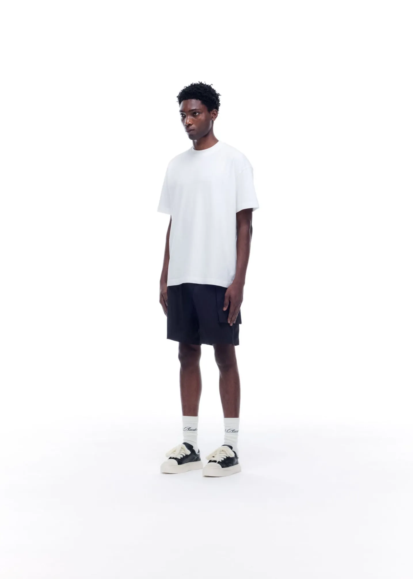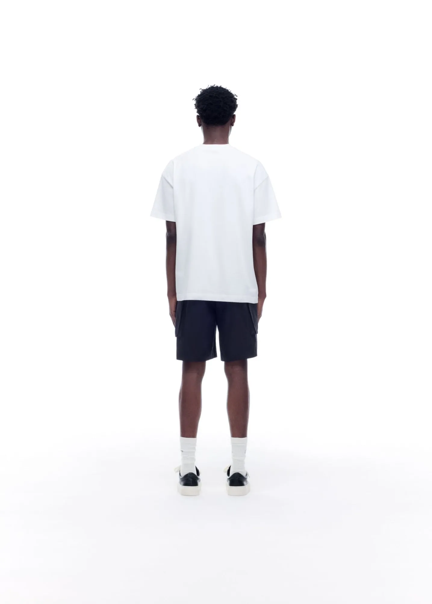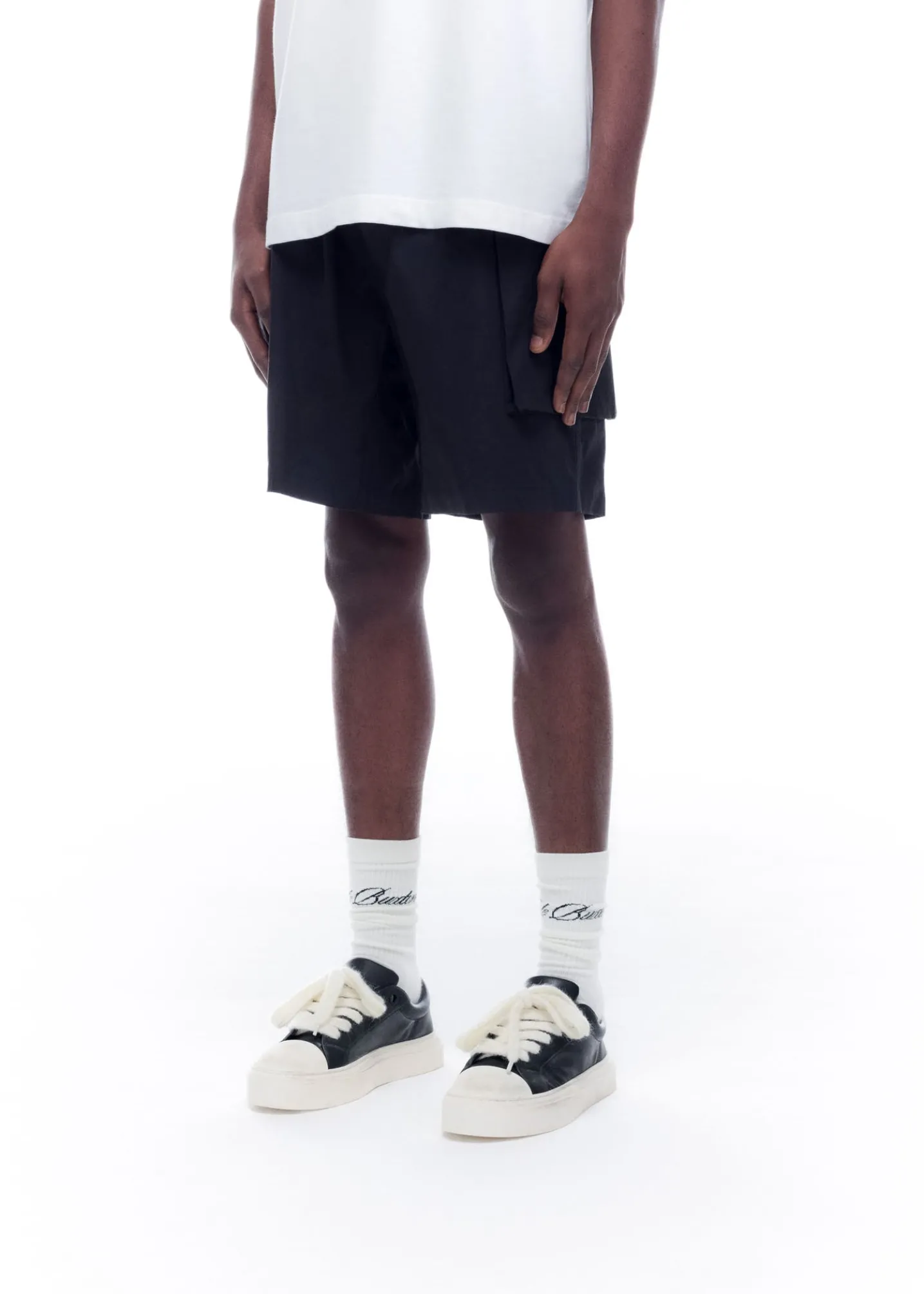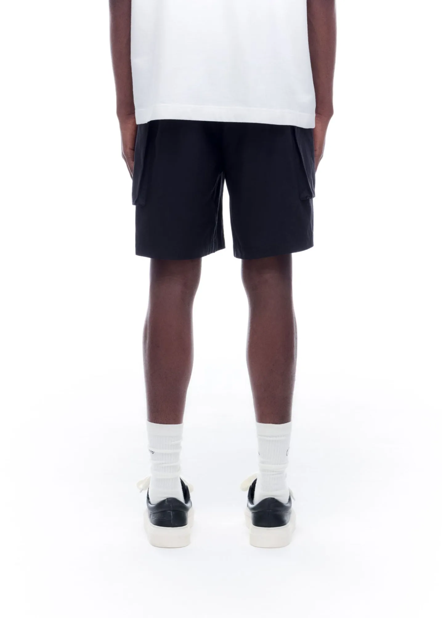 Our cargo shorts are a blend of classic menswear with design cues from military sportswear. The outer is cut from a luxury peach-faced nylon in a boxy silhouette featuring oversized front combat pockets, an elasticated waistband and finished with our CB branded zippers.