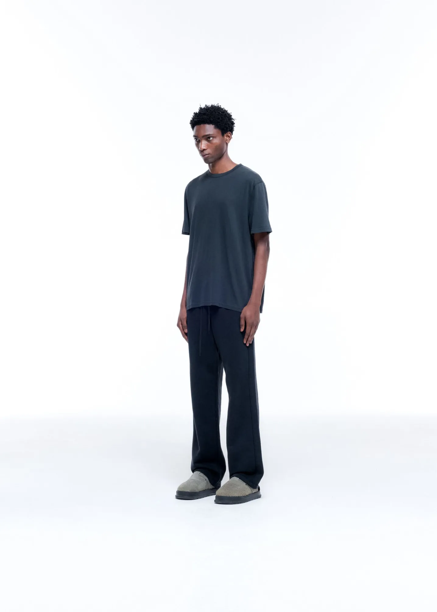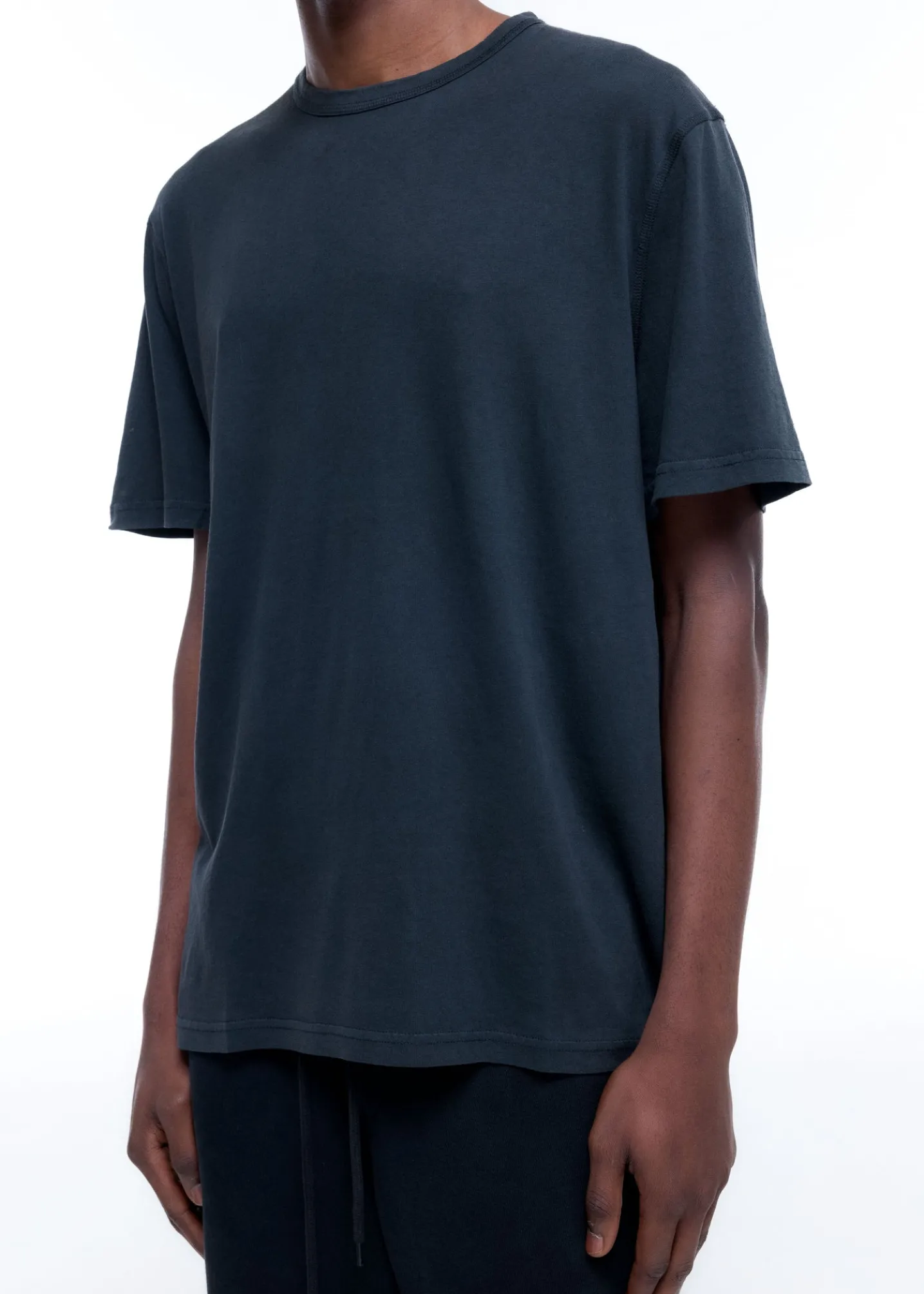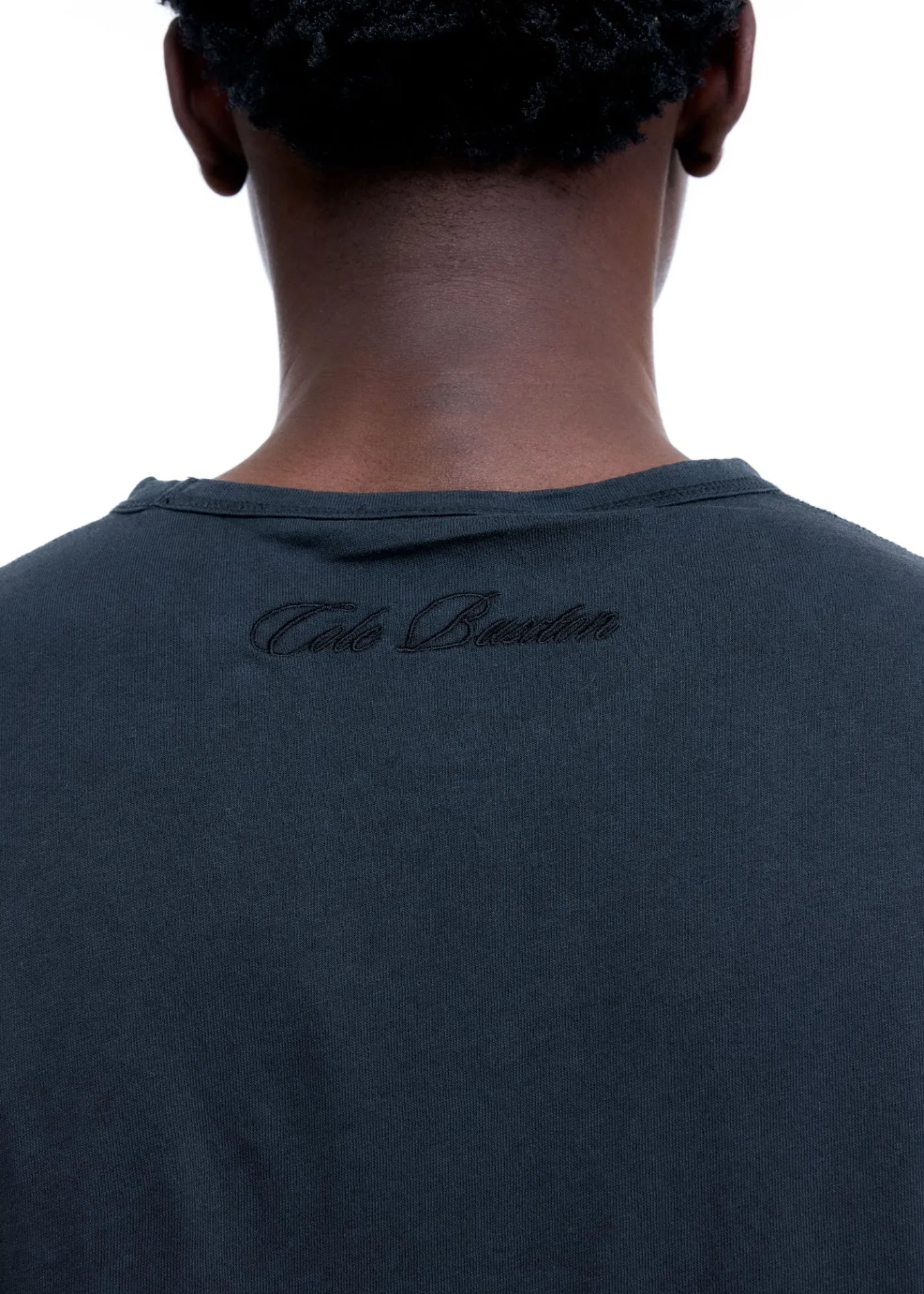 The Cole T-shirt is the newest offering in our t-shirt silhouettes. Cut in a more athletic shape from an open ended lightweight drapey cotton featuring a self fabric collar, coverstitched detailing throughout and a tonal classic embroidery on the back neck.
