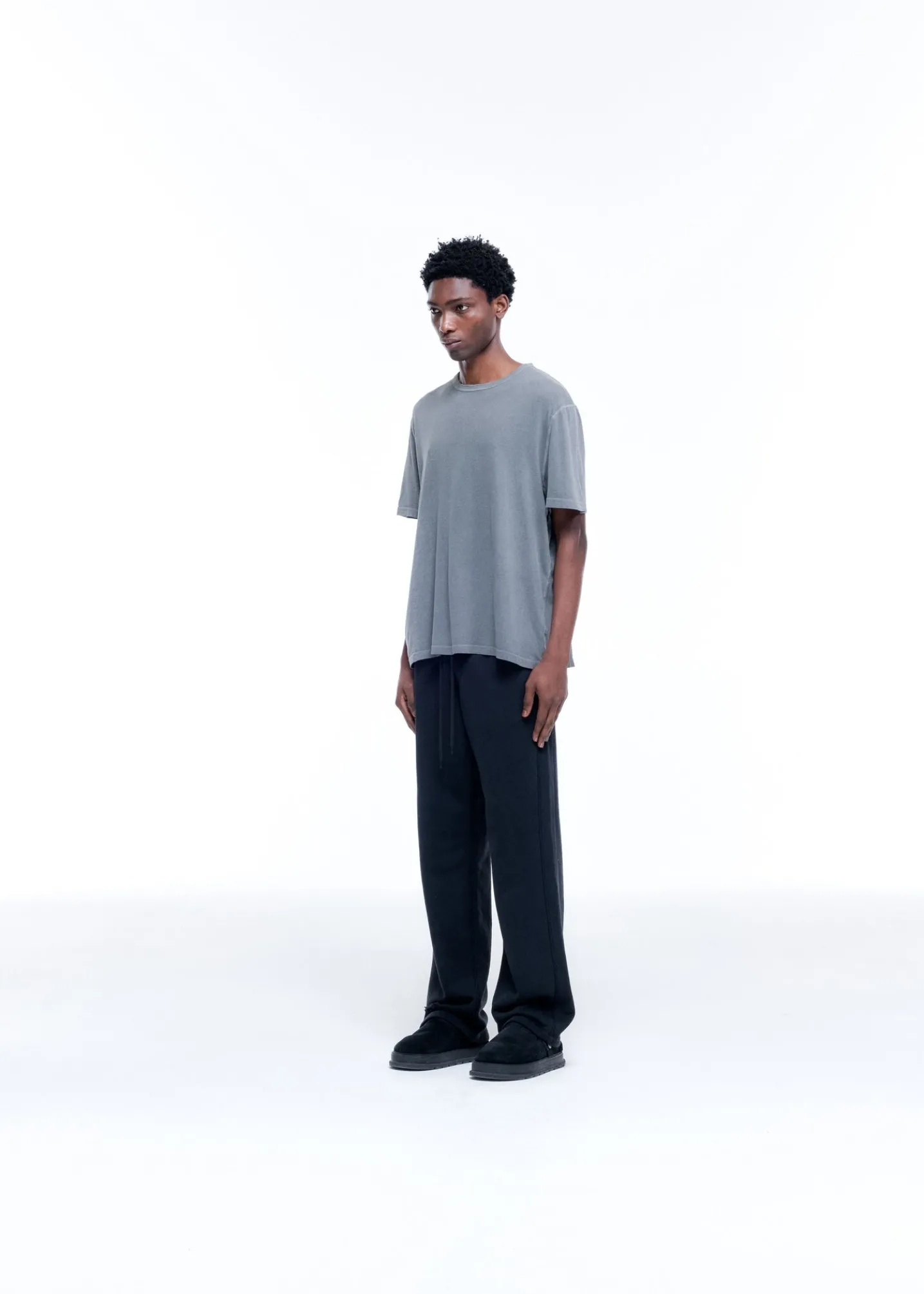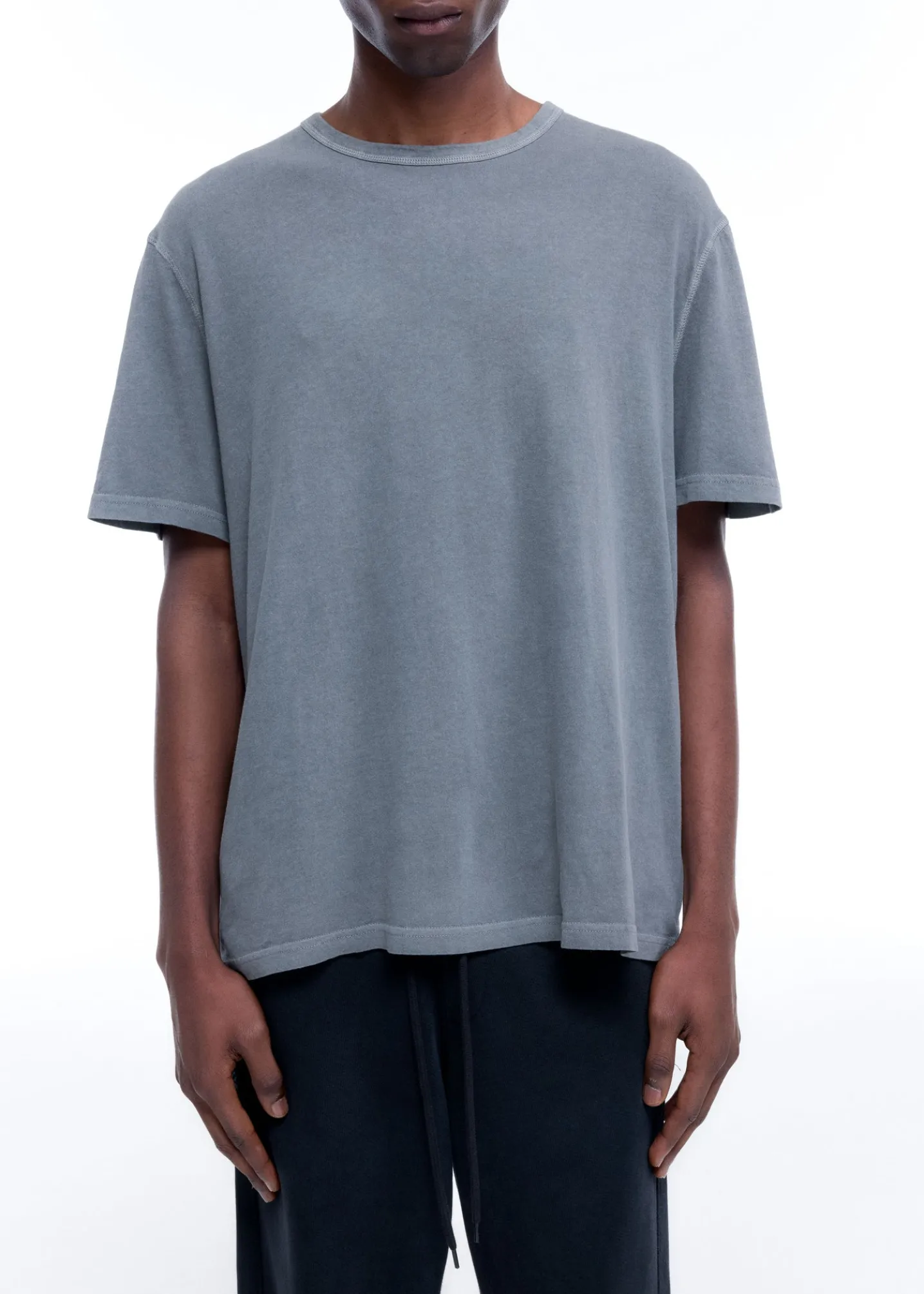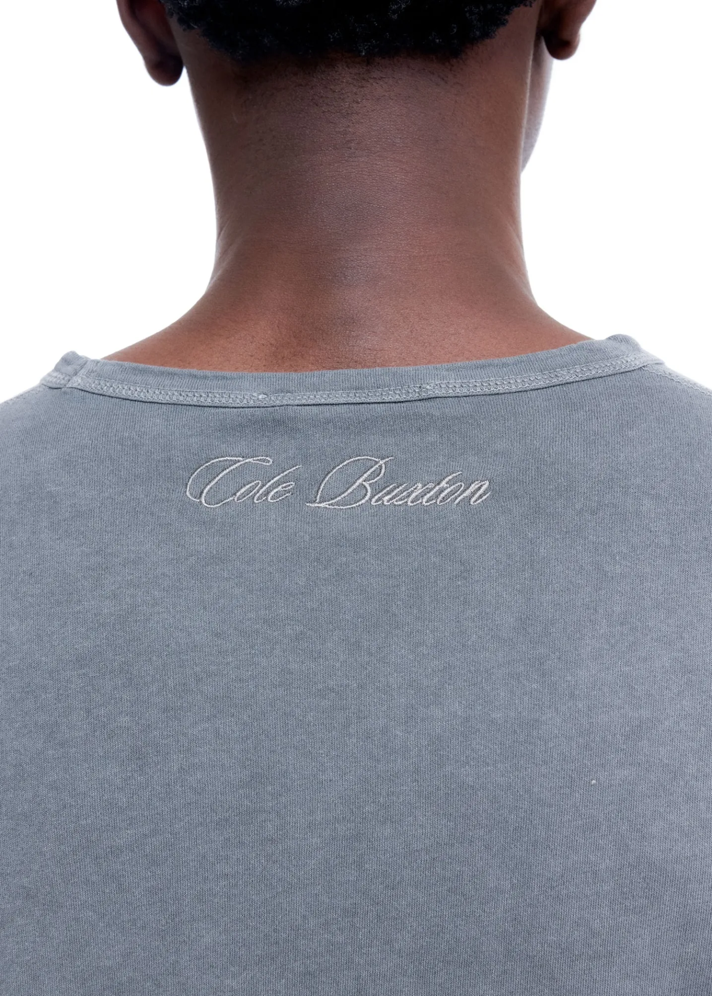 The Cole T-shirt is the newest offering in our t-shirt silhouettes. Cut in a more athletic shape from an open ended lightweight drapey cotton featuring a self fabric collar, coverstitched detailing throughout and a tonal classic embroidery on the back neck.