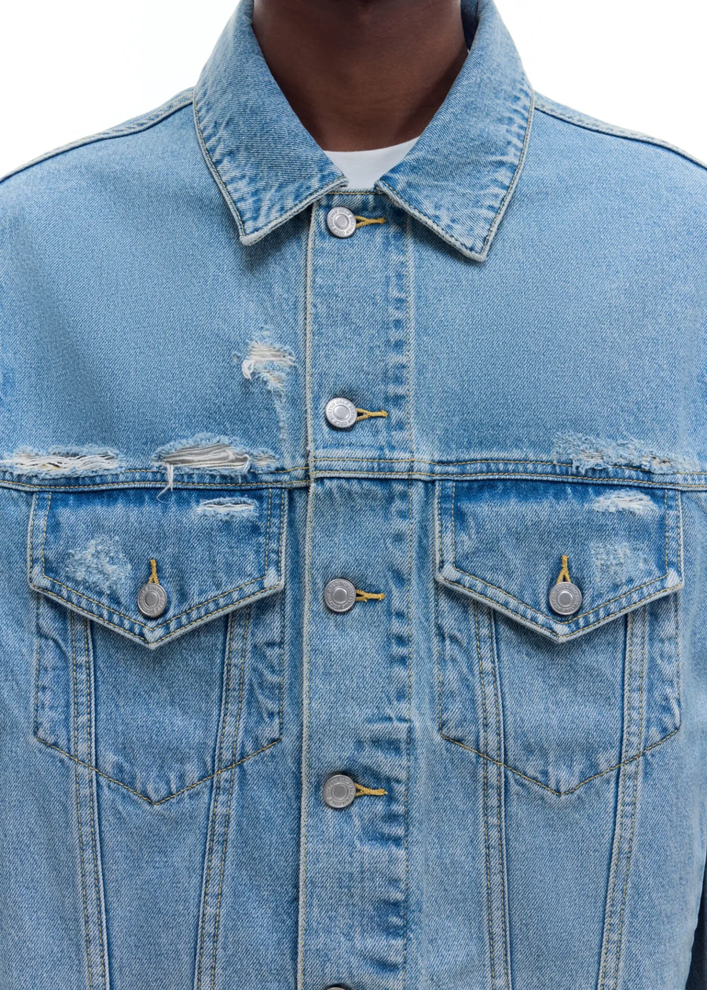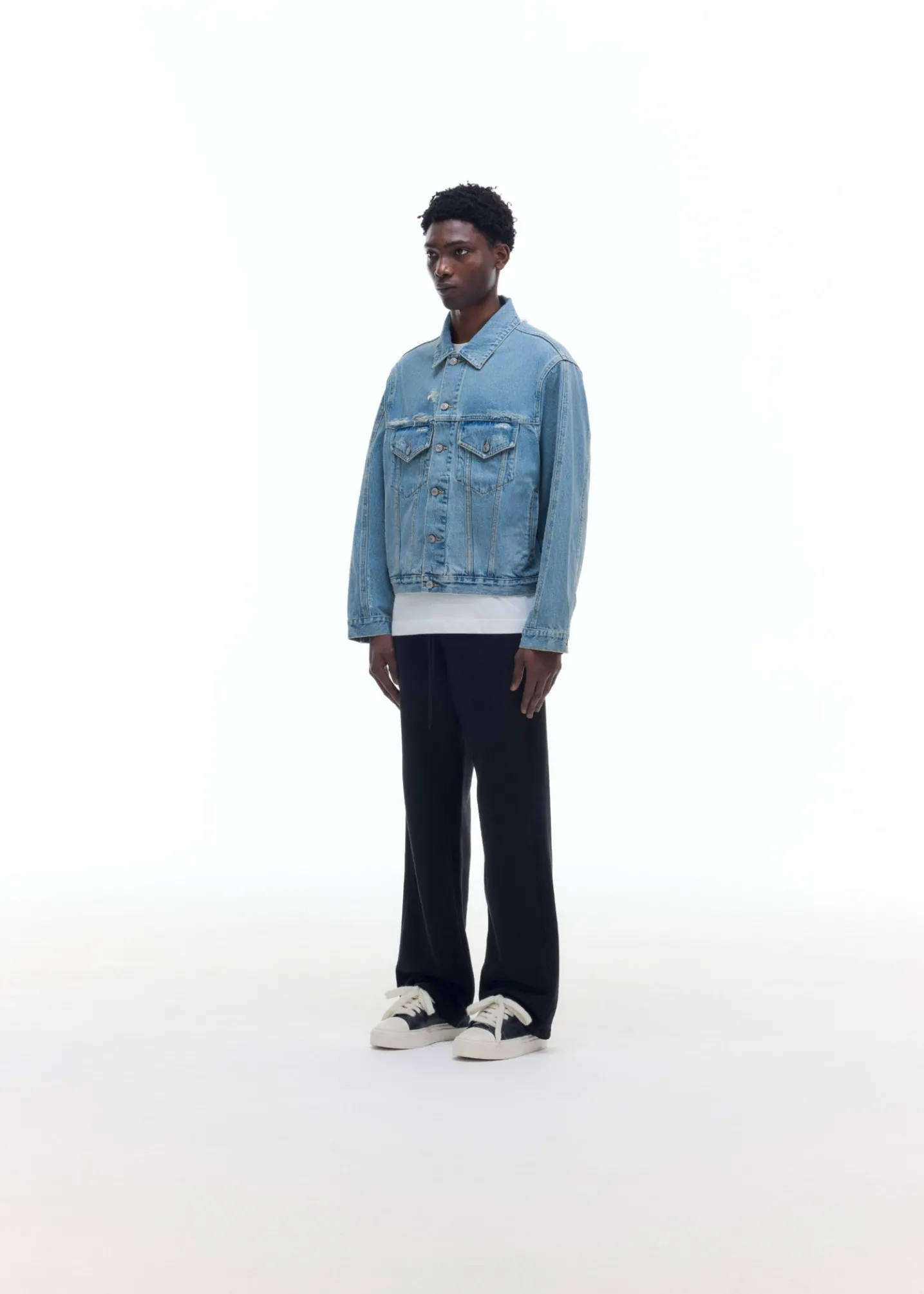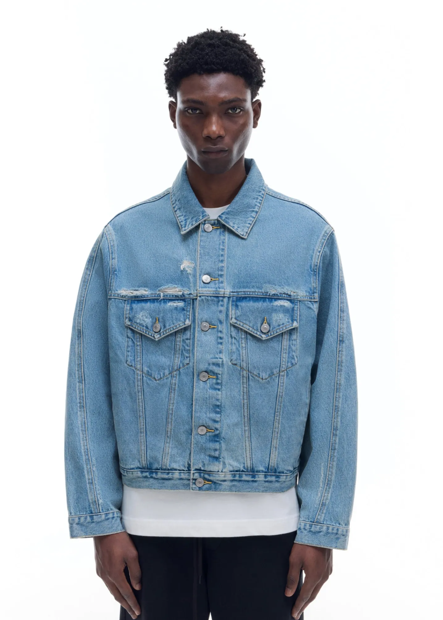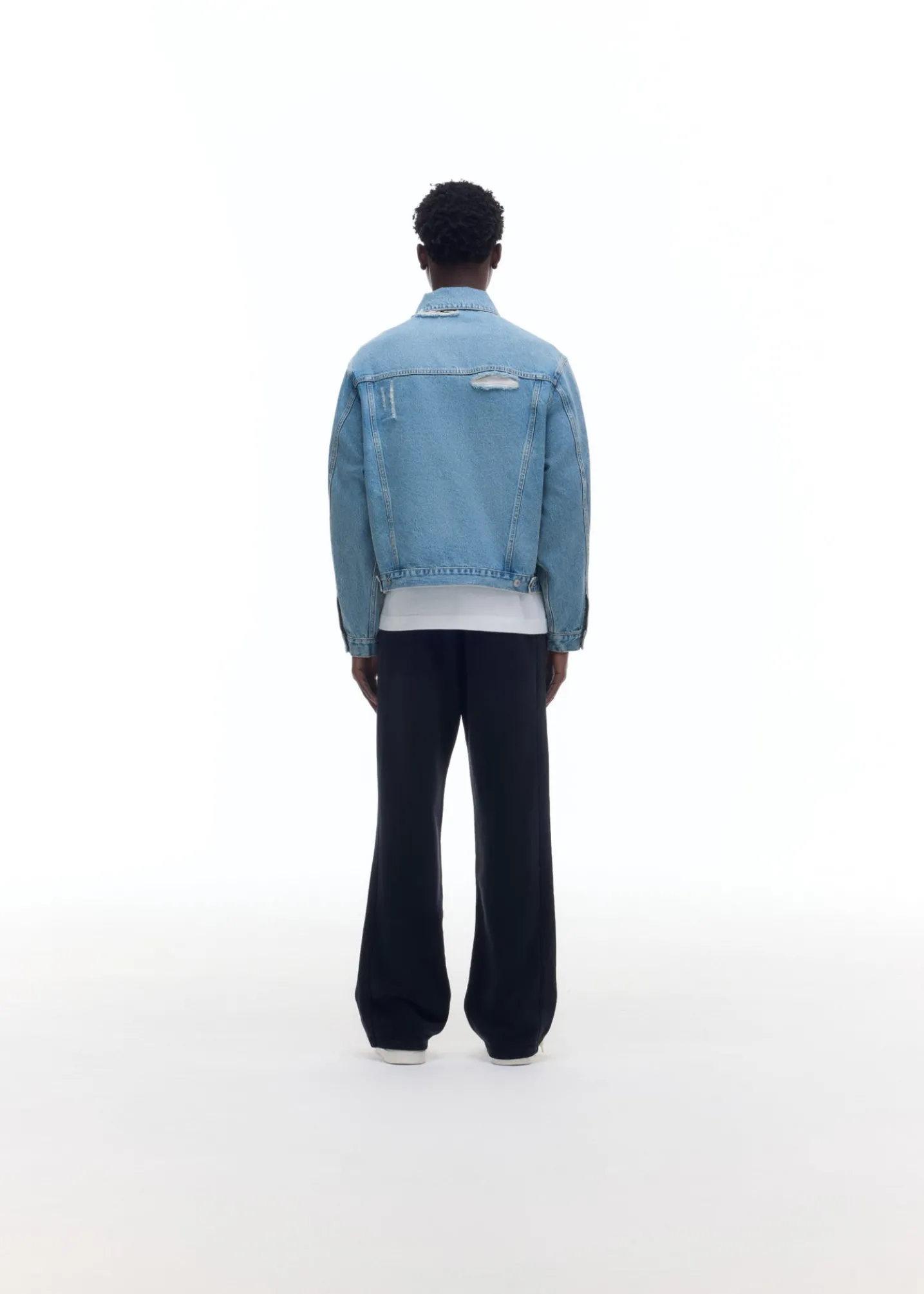 Following the success of our previous denim jacket, this one has been updated for SS25. Featuring our signature outer arm curved seam, type 3 pocket and stitch detailing and subtle distressing all over with a blown out back yoke and neck line. Cut from soft 100% cotton denim.